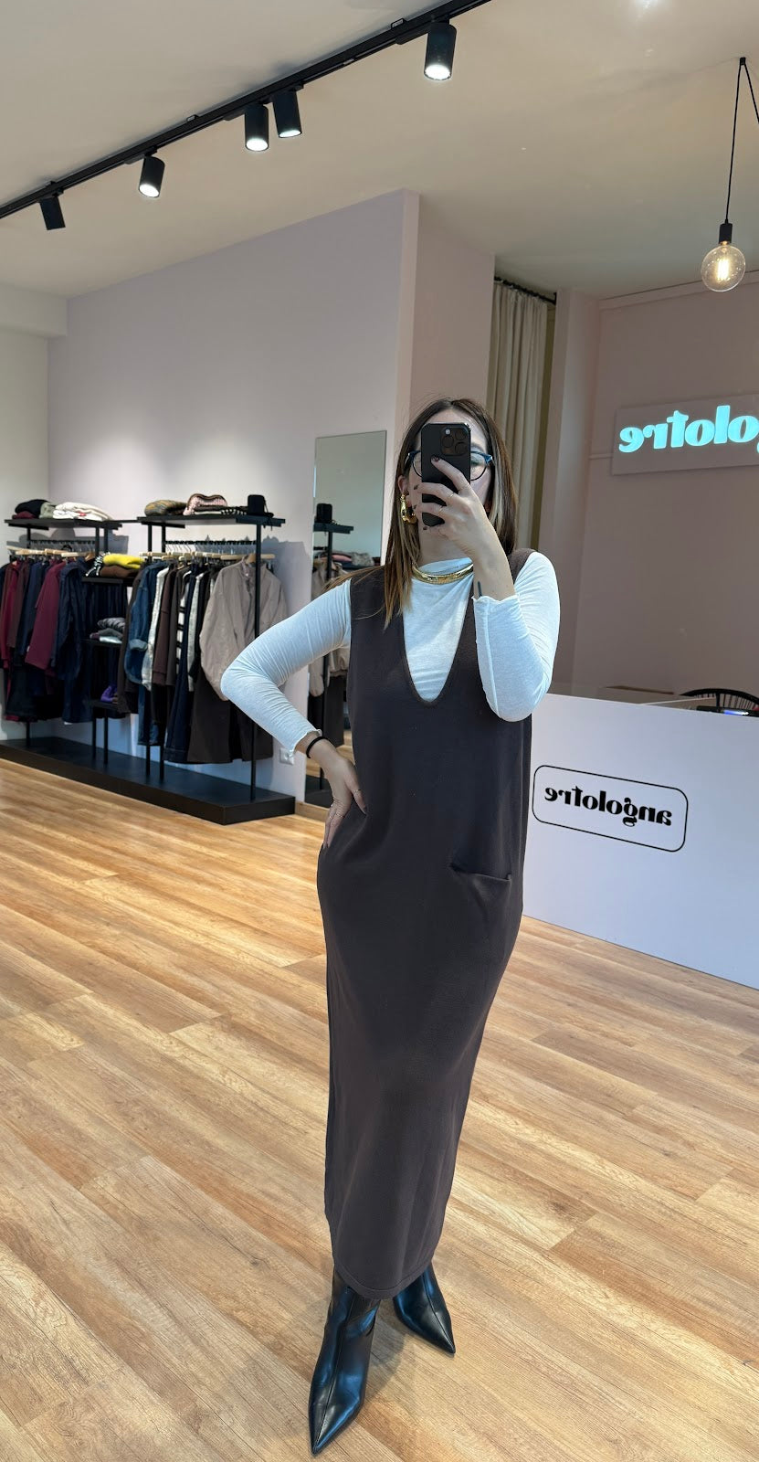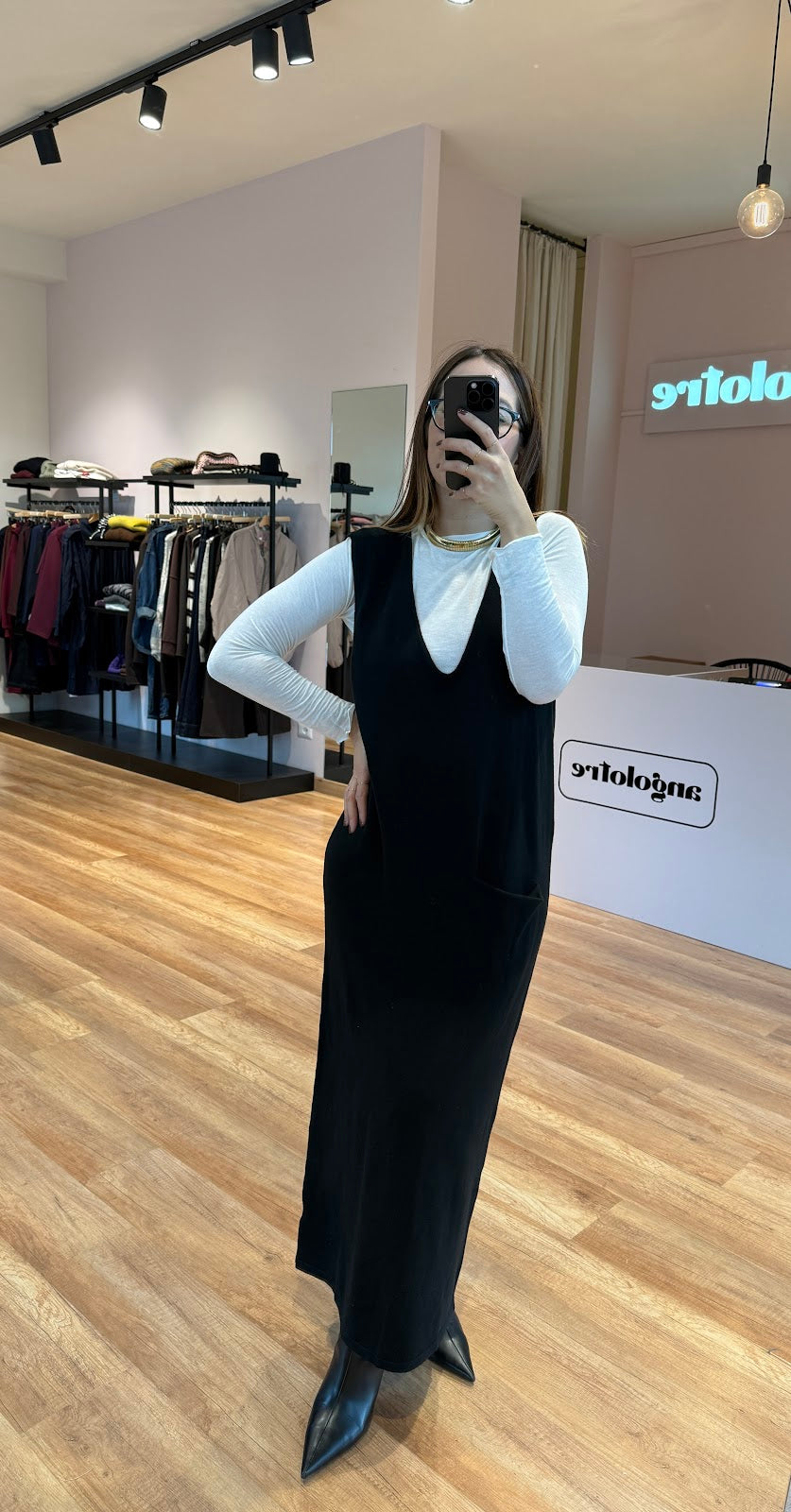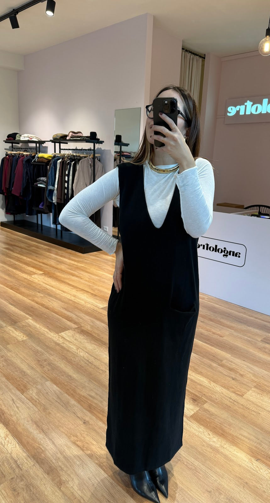 Abito lungo in maglia, con ampio scollo e taschino sul davanti. Greta veste una taglia 40/42.