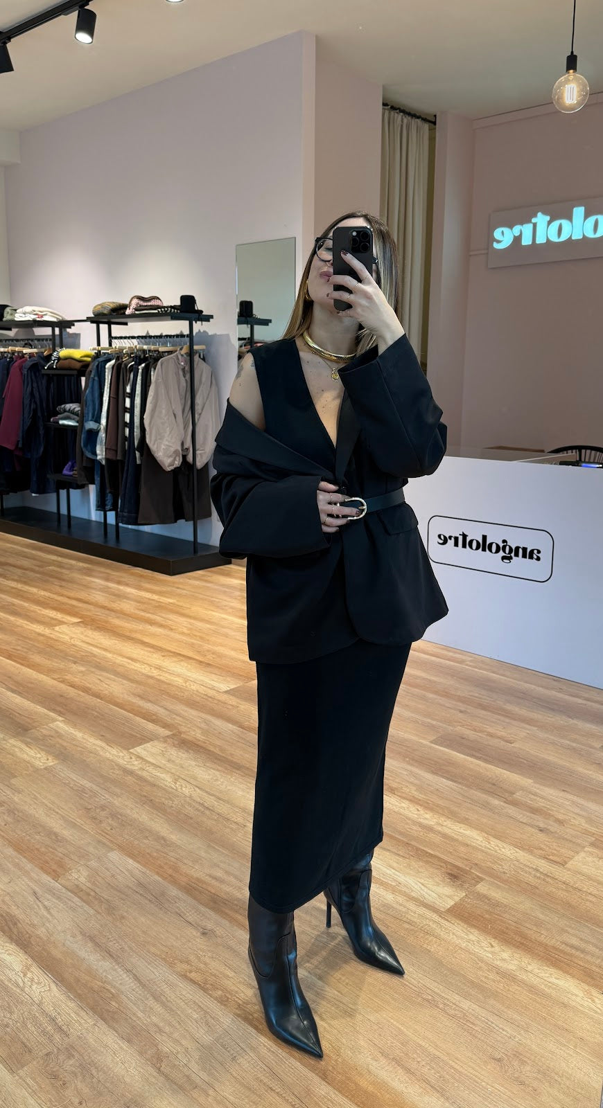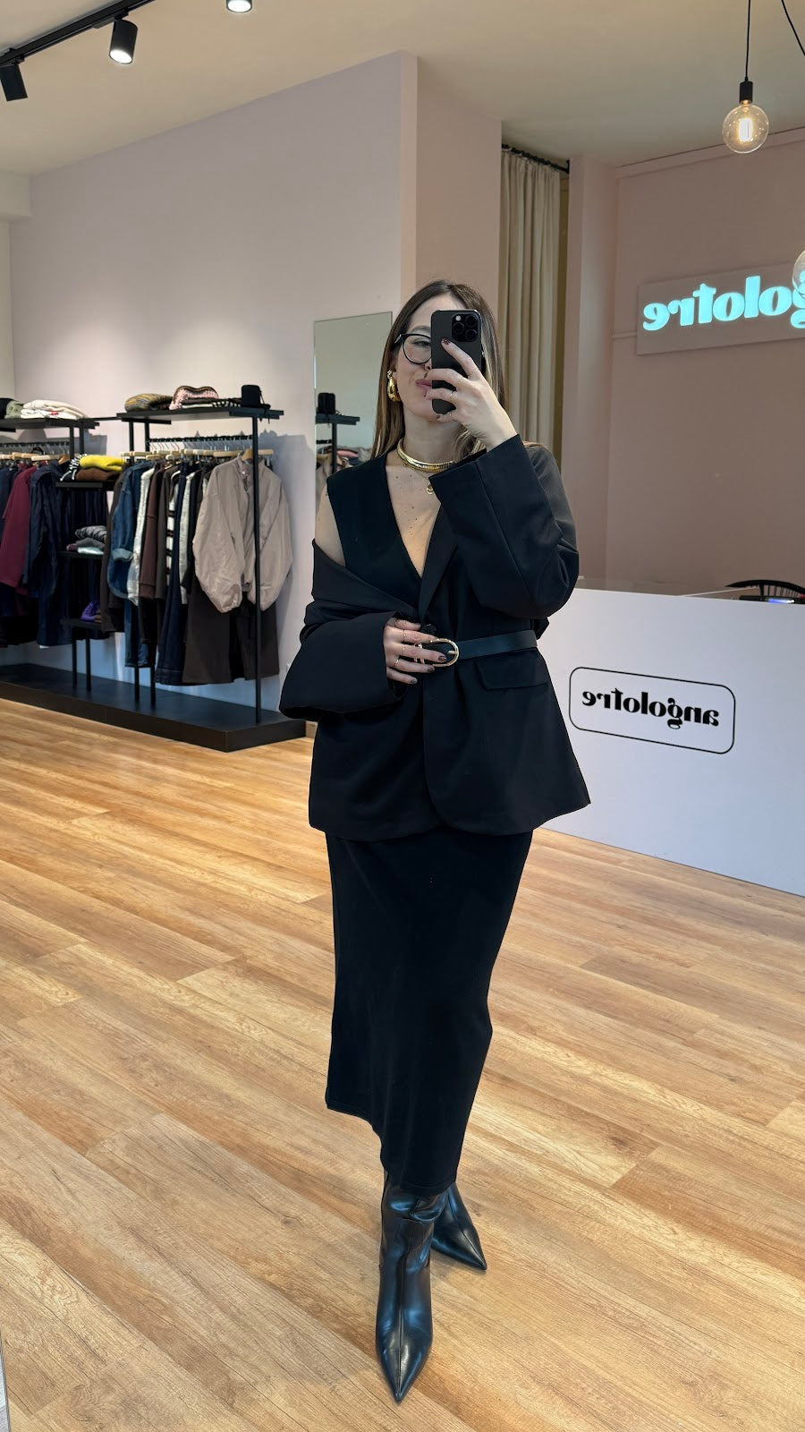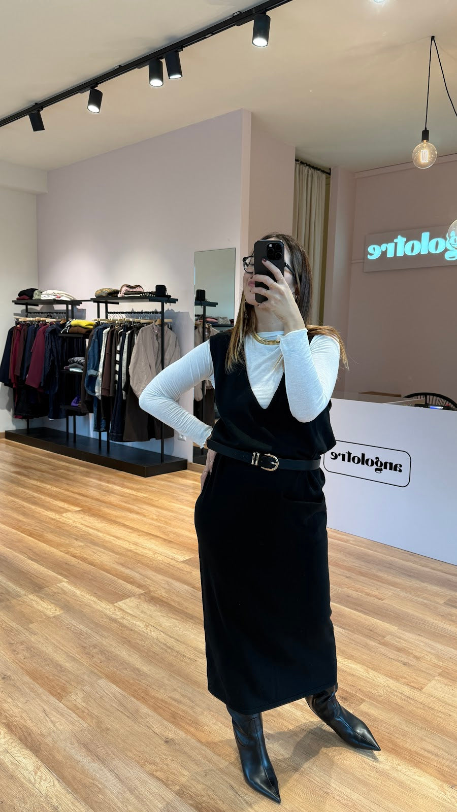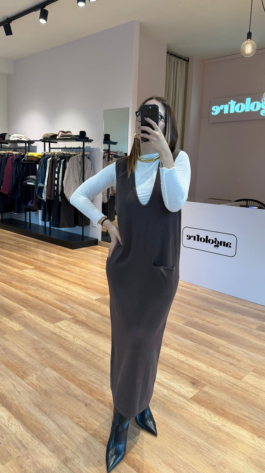 Abito lungo in maglia, con ampio scollo e taschino sul davanti. Greta veste una taglia 40/42.