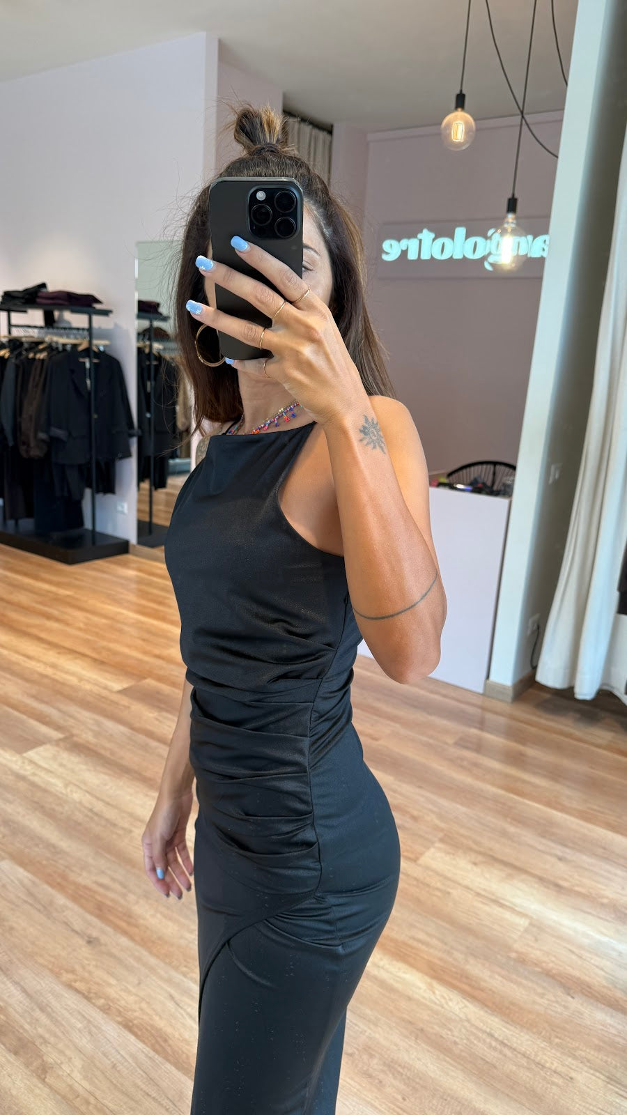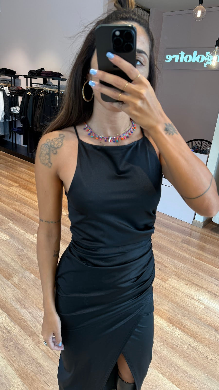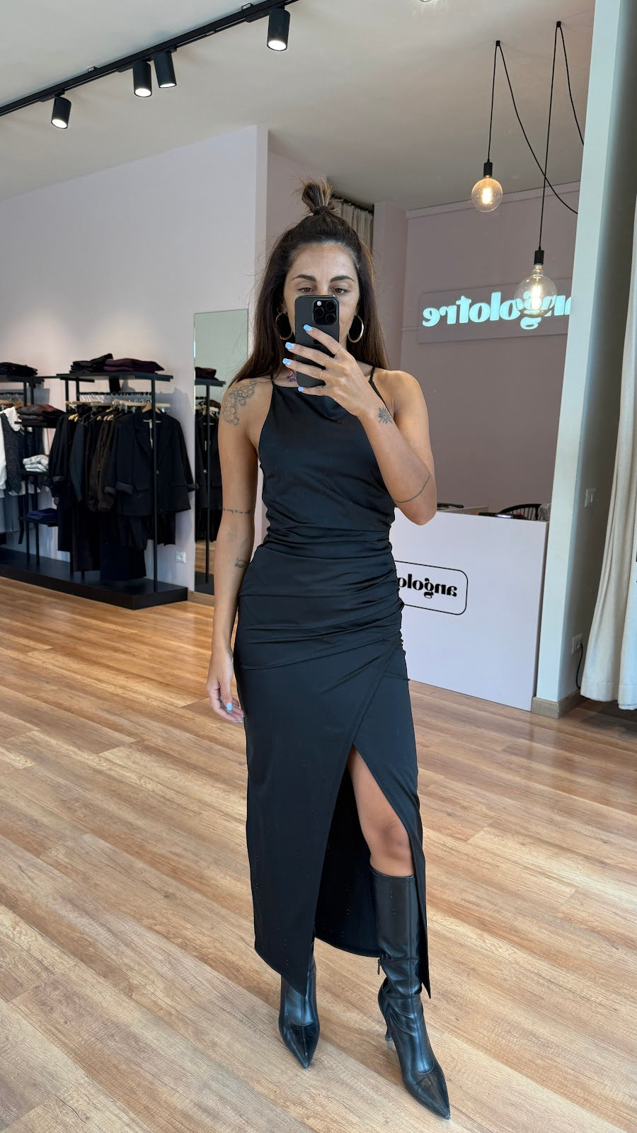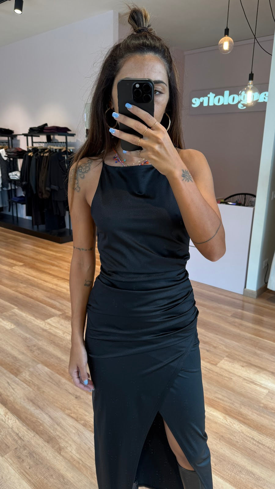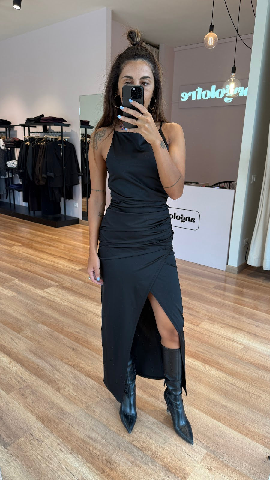 Abito lungo in tessuto elasticizzato semi lucido con drappeggio laterale e ampio spacco frontale. Jessica veste una taglia 40.
