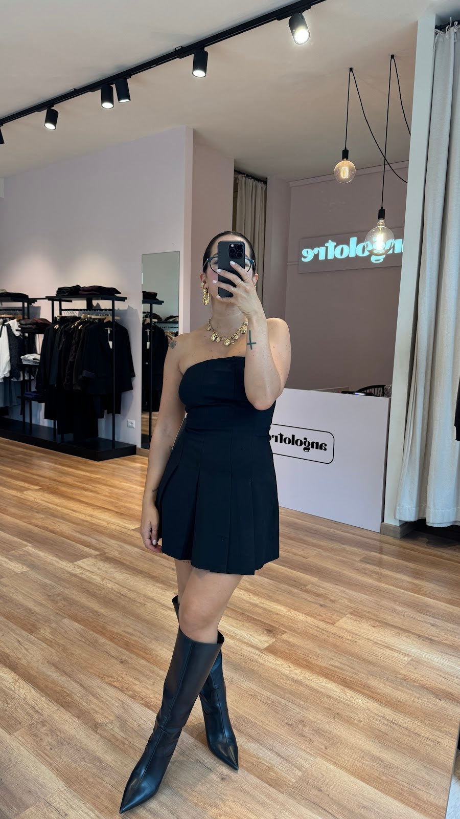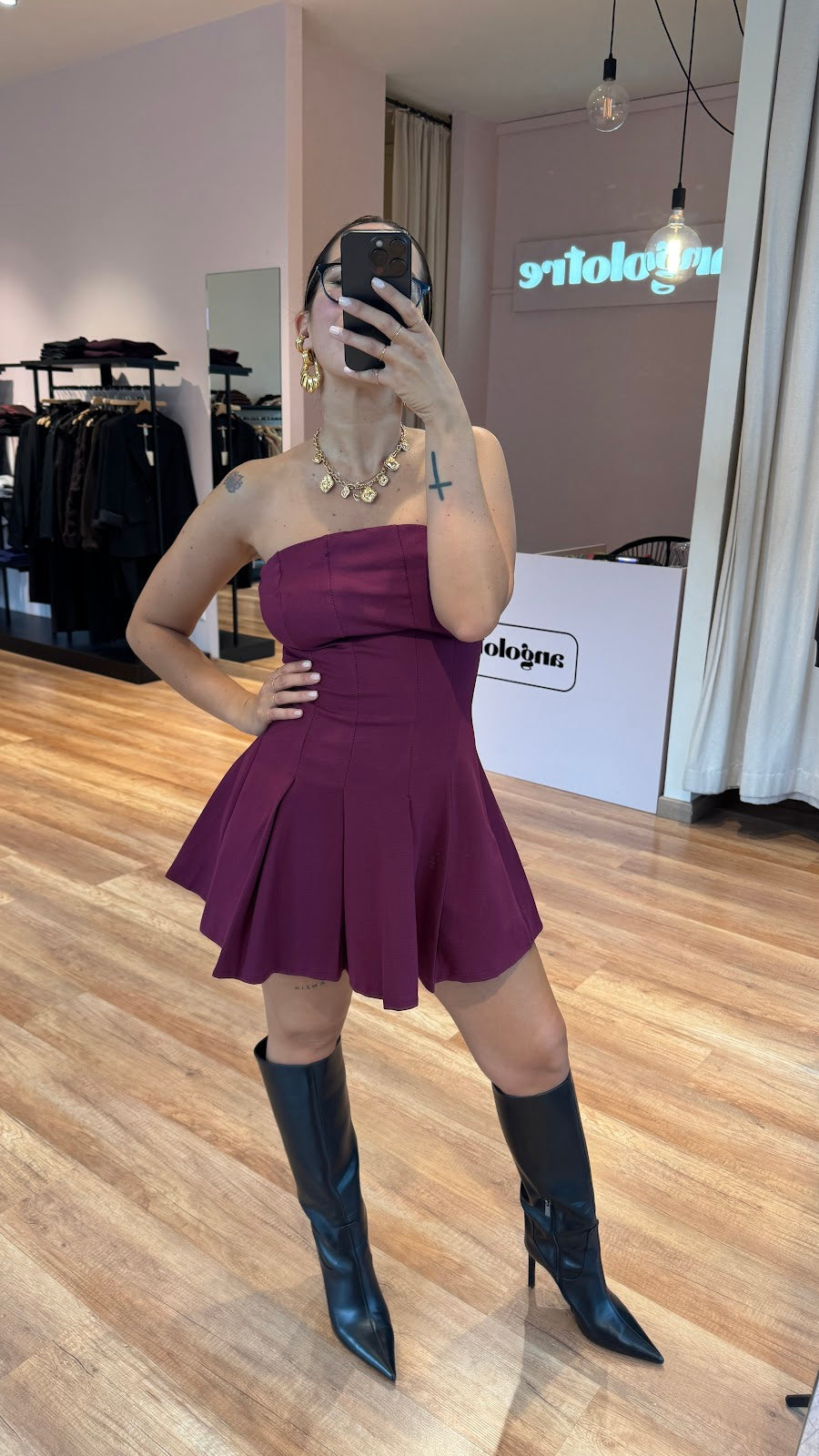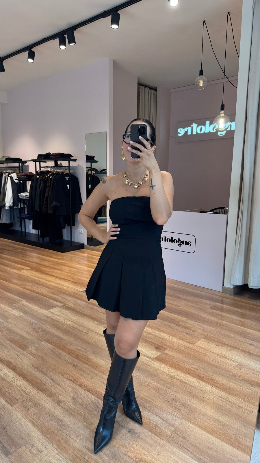 Abito a fascia con gonna a pieghe in punto Milano. Chiusura zip nella nparte posteriore. Greta veste una taglia 40/42.