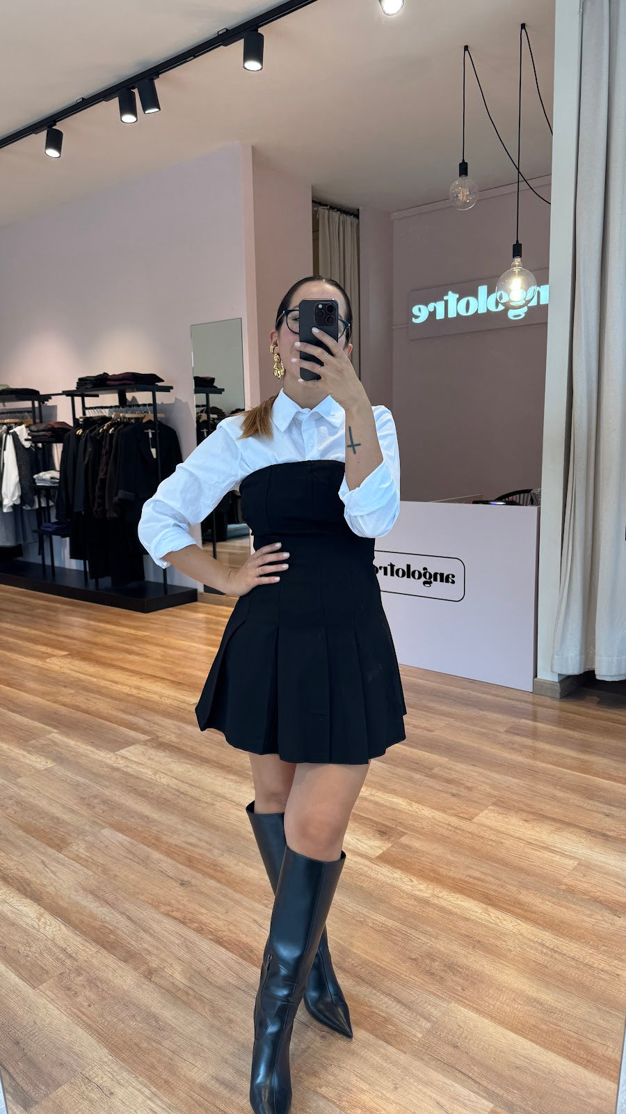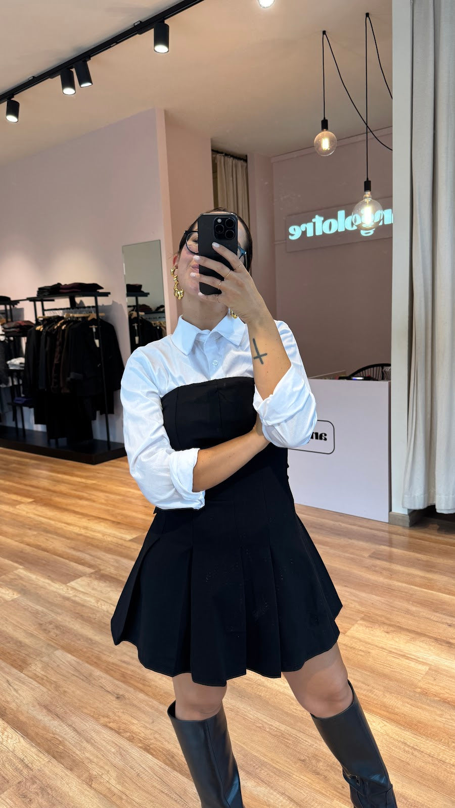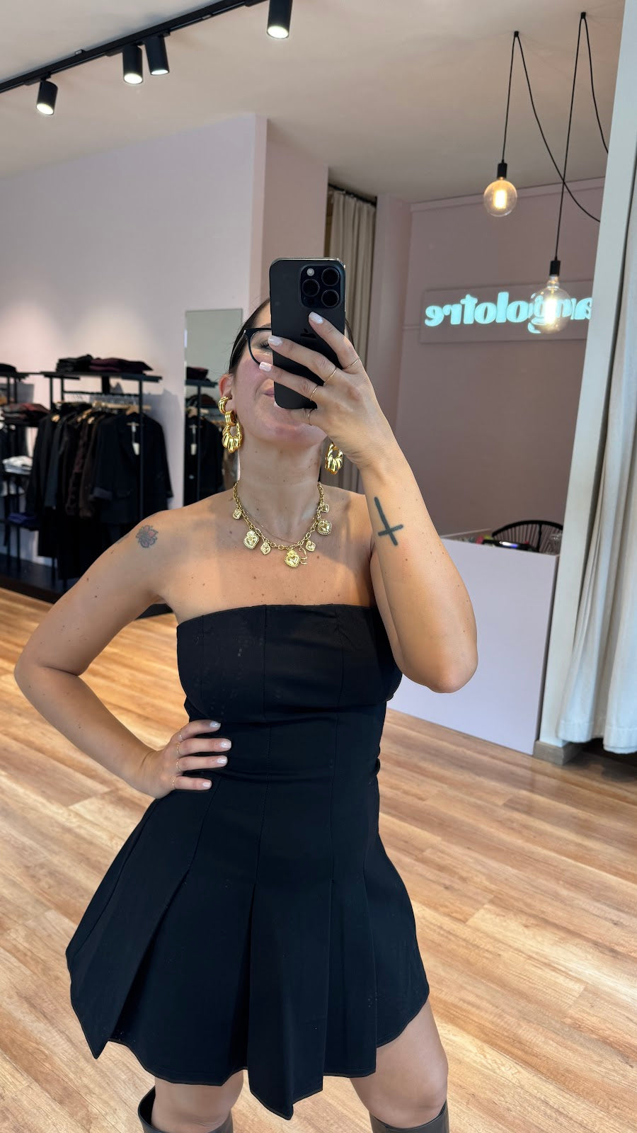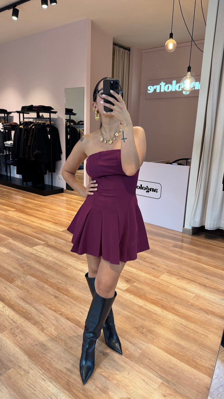 Abito a fascia con gonna a pieghe in punto Milano. Chiusura zip nella nparte posteriore. Greta veste una taglia 40/42.