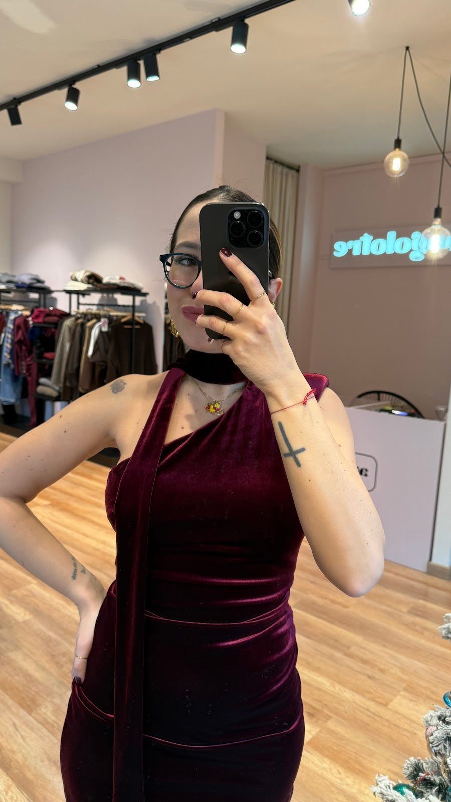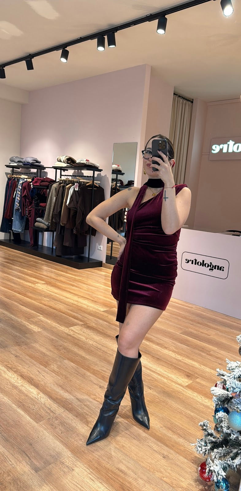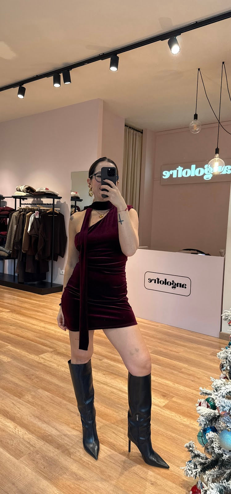 Mini abito in ciniglia, monospalla senza maniche, con sciarpina, drappeggio laterale. Greta veste una taglia 40/42.