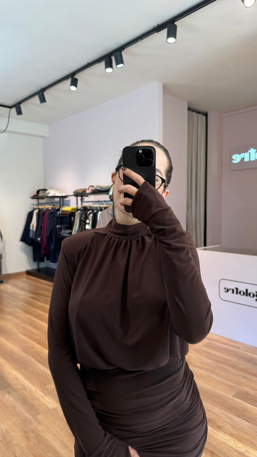 Mini abito manica a guanto, con spalline e mezzo collo, drappeggio sulla gonna. Tessuto elasticizzato. Greta veste una taglia 40/42.