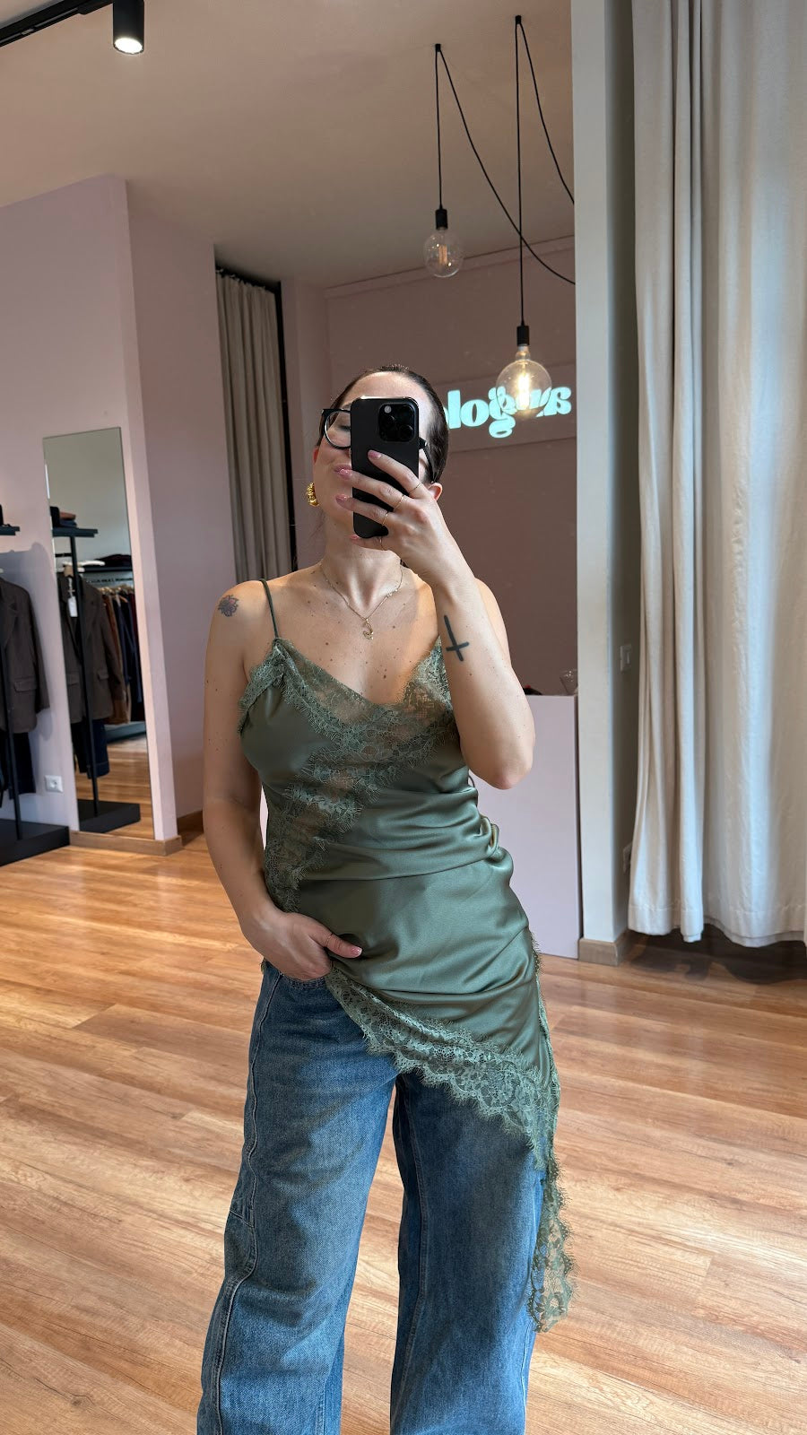Minidress asimmetrico pizzo. Greta veste una taglia 40/42.