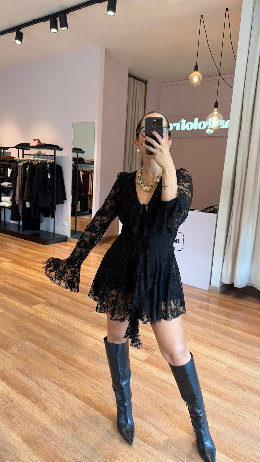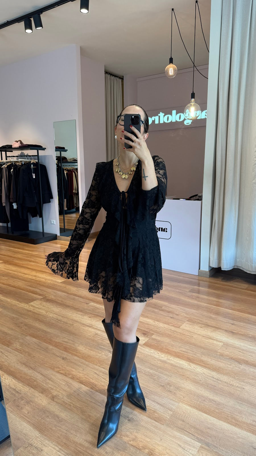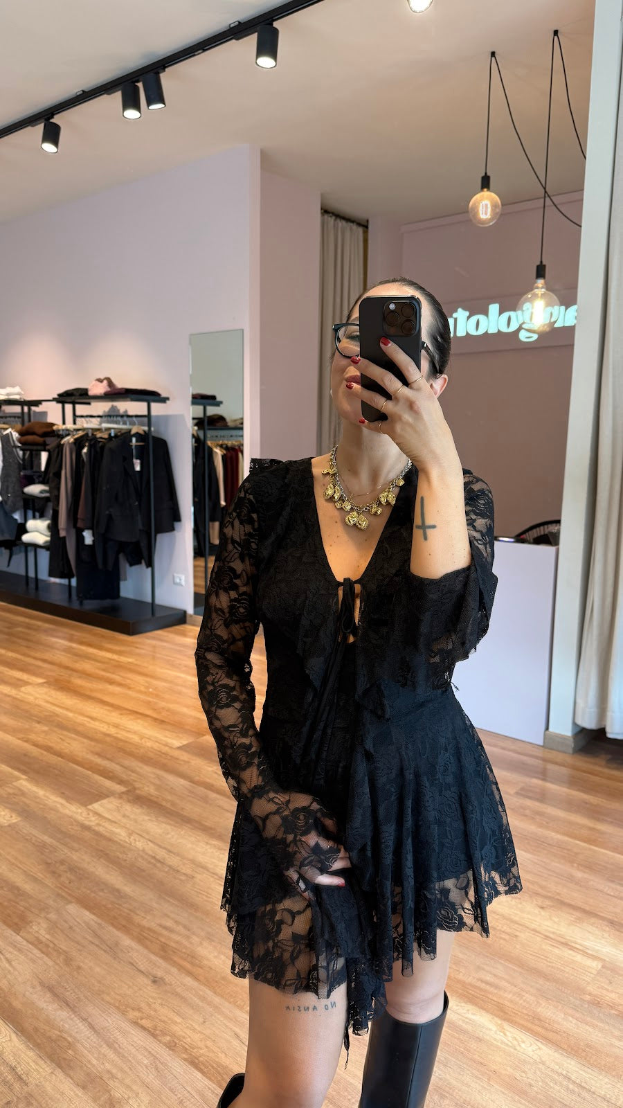 Mini abito in pizzo con volant sul polso e sul davanti. Chiusura con laccetto. Pantaloncini interni. Greta veste una taglia 40/42.