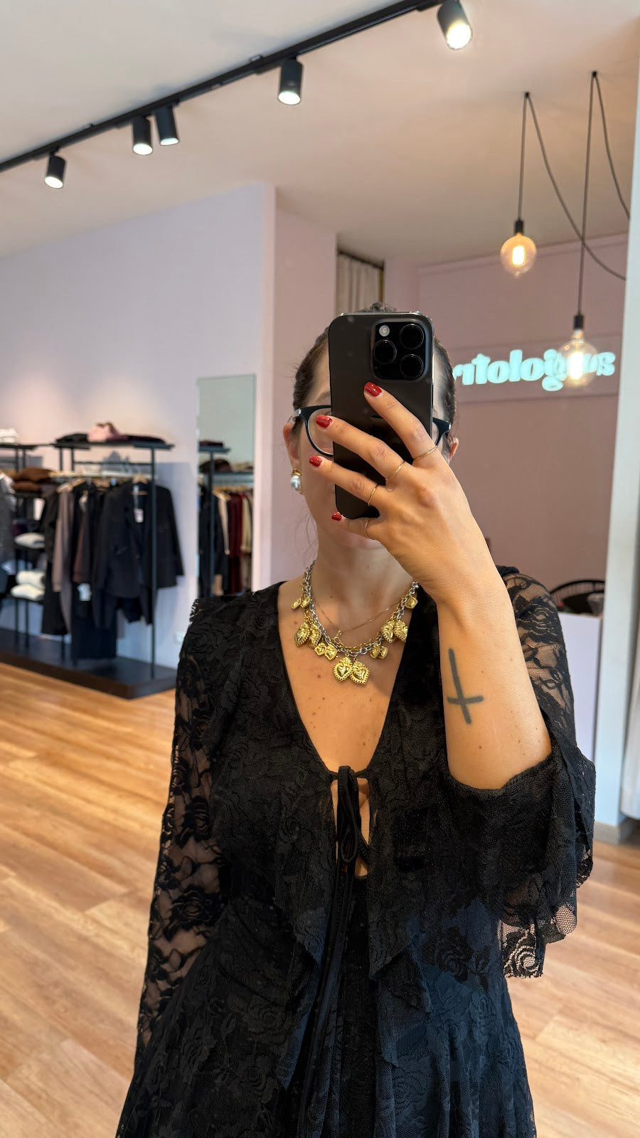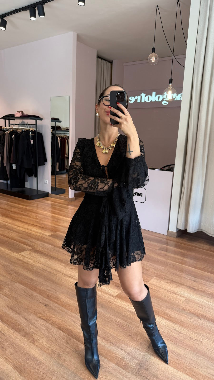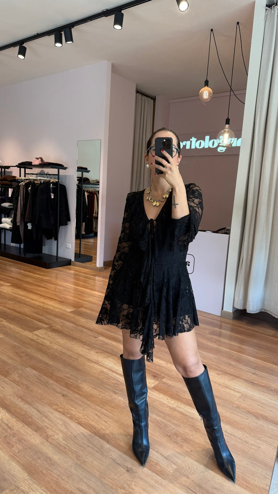 Mini abito in pizzo con volant sul polso e sul davanti. Chiusura con laccetto. Pantaloncini interni. Greta veste una taglia 40/42.