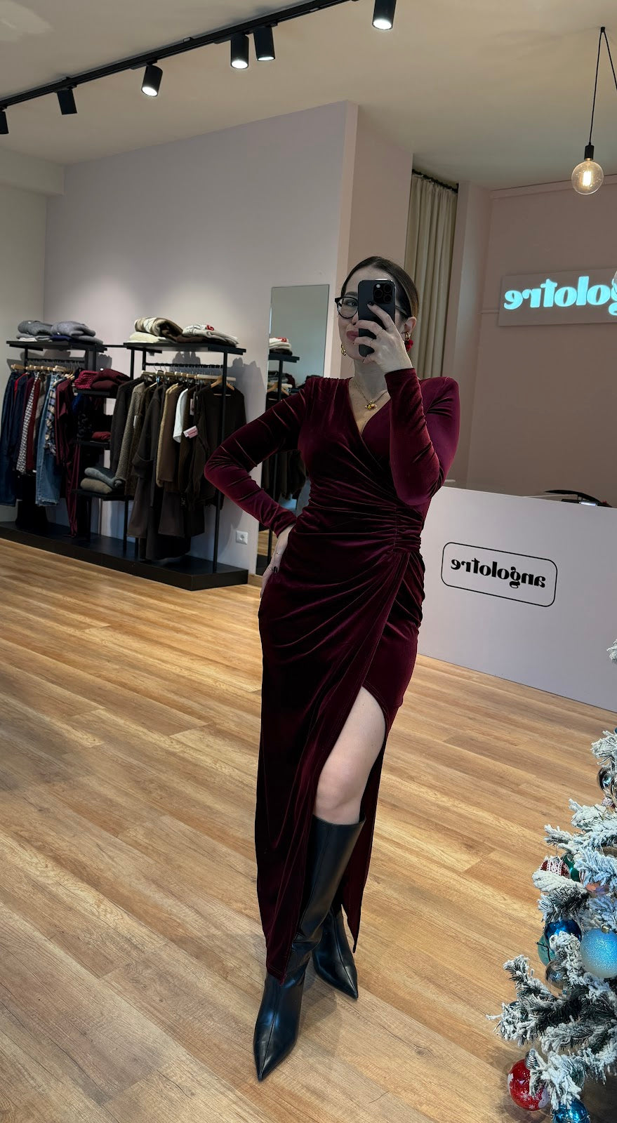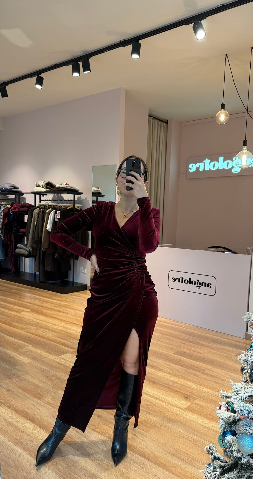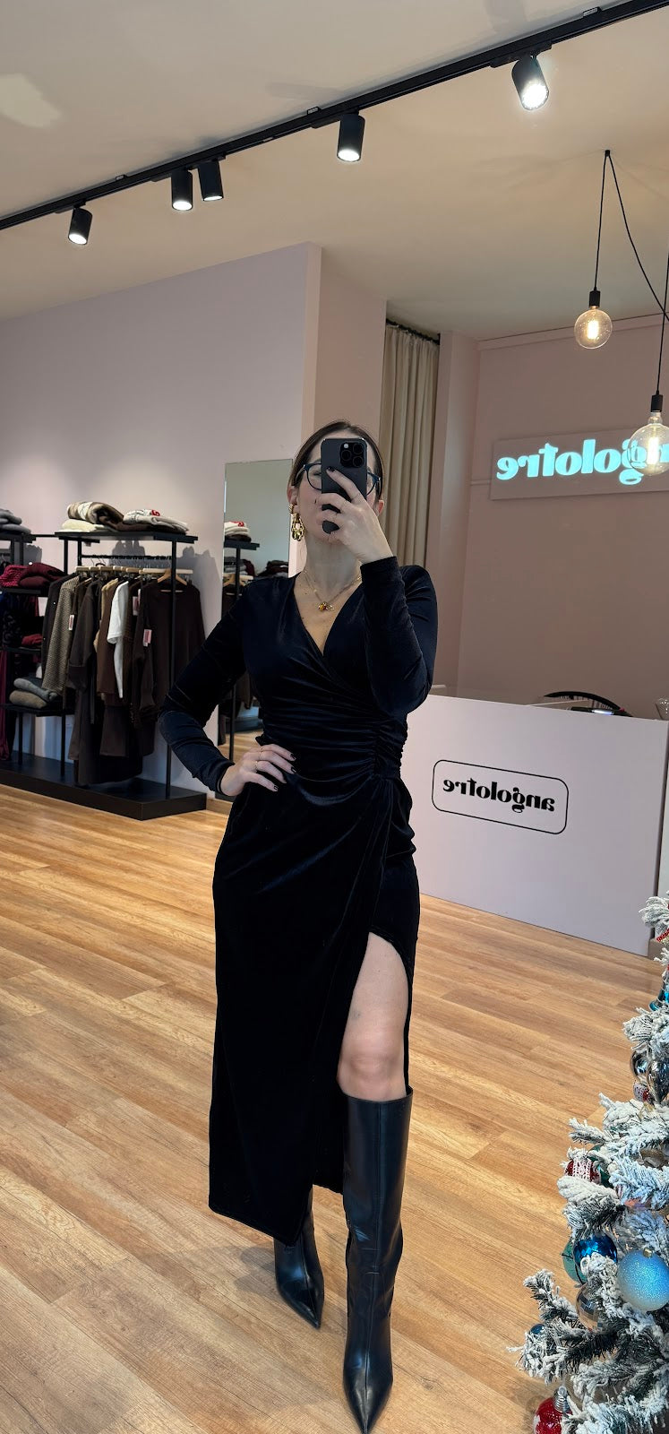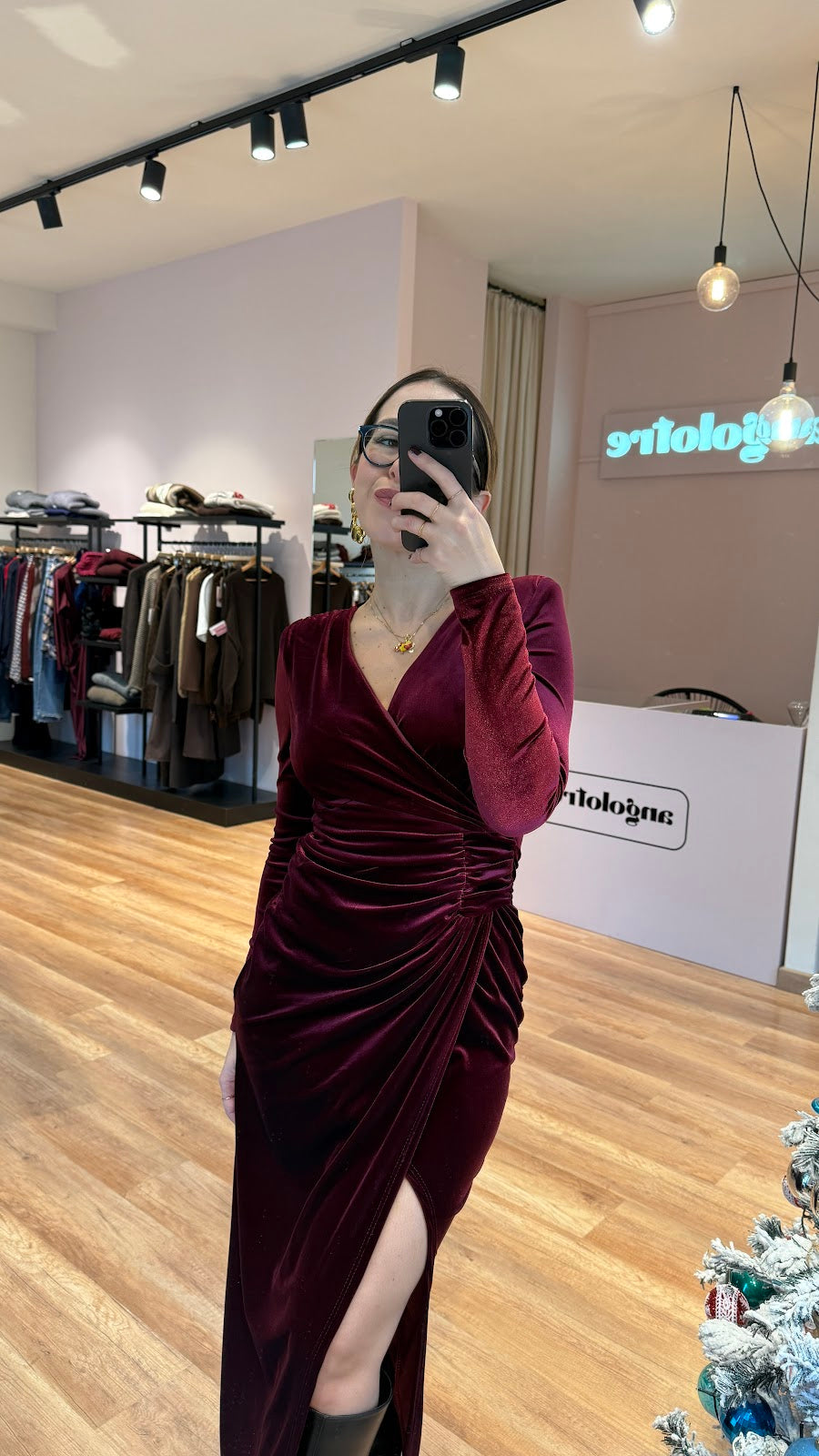Abito lunghezza midi in ciniglia con spalline, incrociato sul davanti con drappeggio laterale e spacco. Greta veste una taglia 40/42.