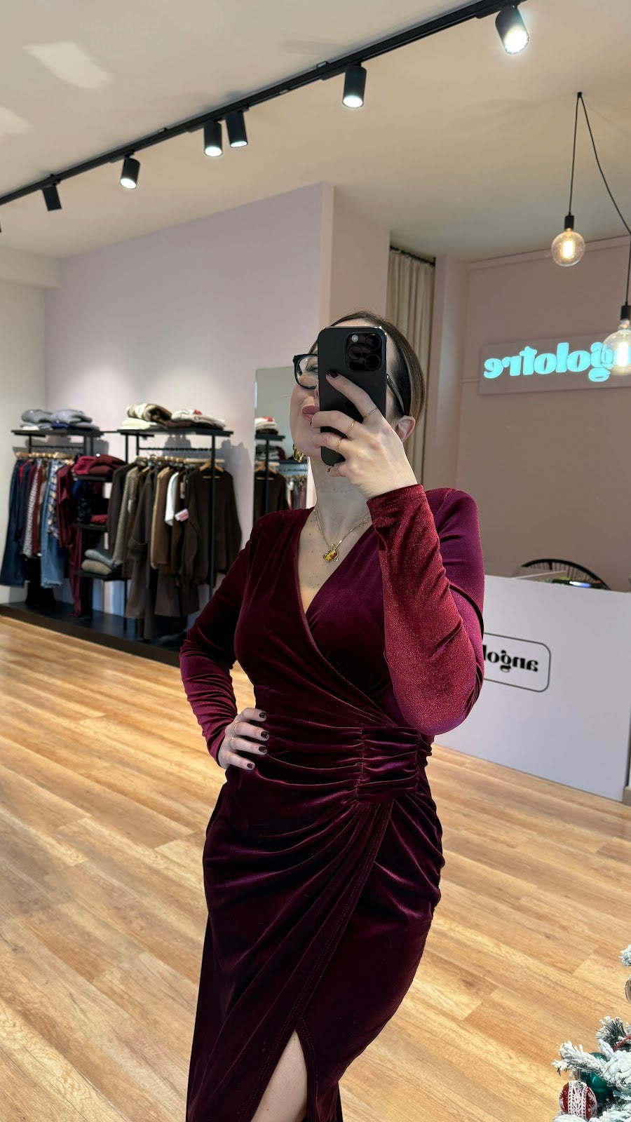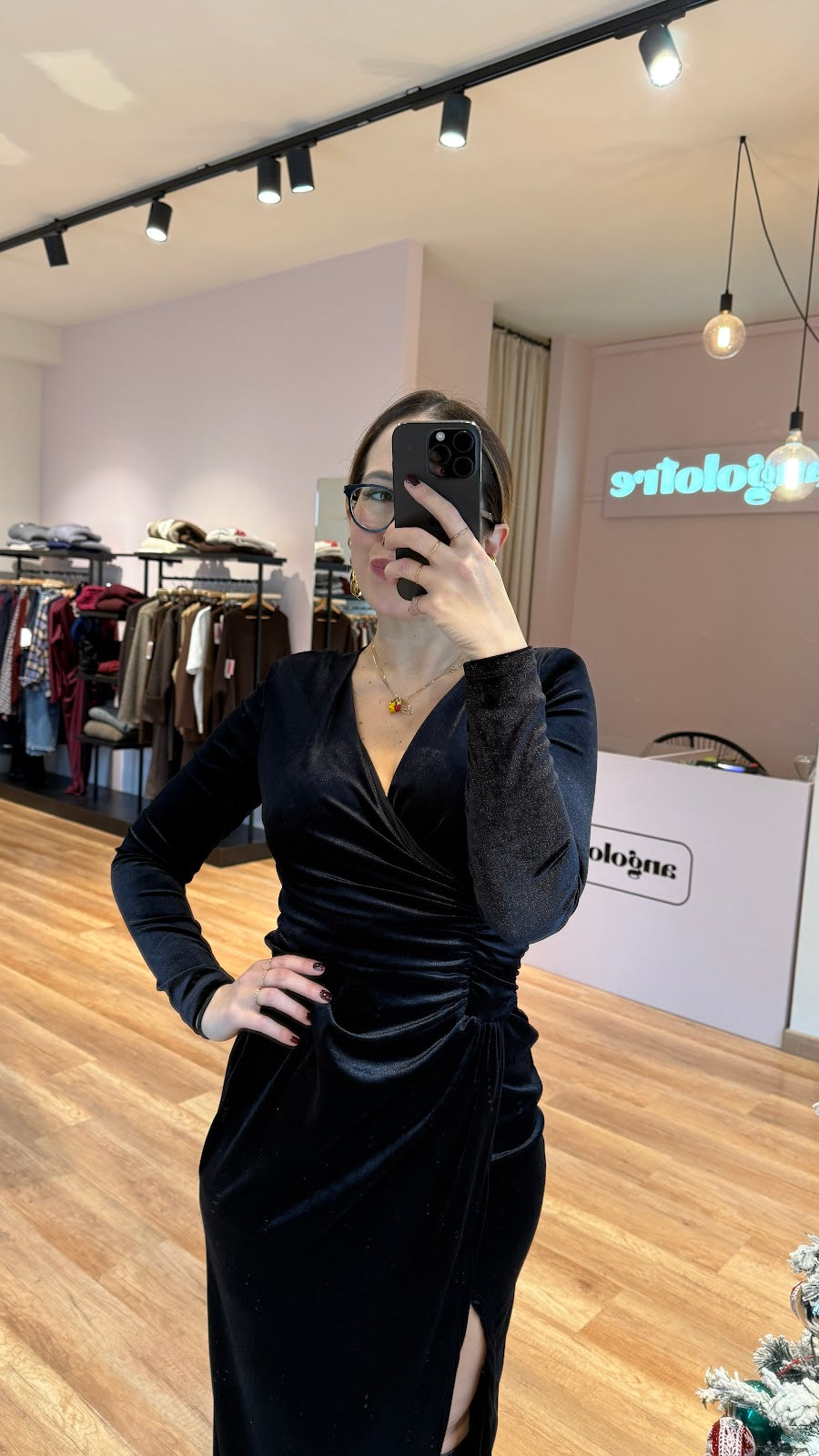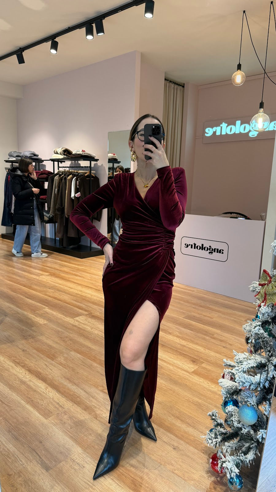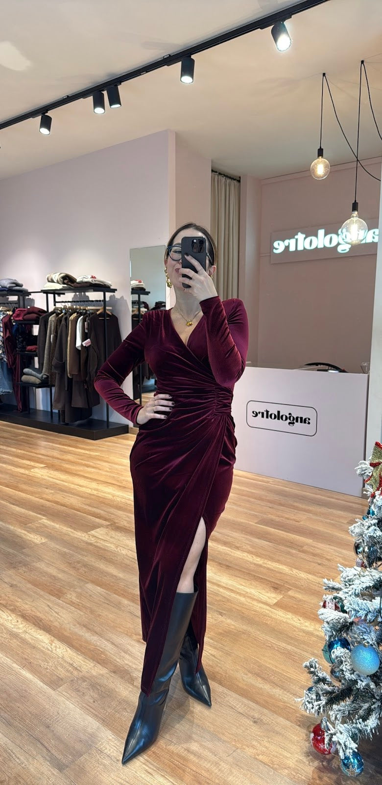 Abito lunghezza midi in ciniglia con spalline, incrociato sul davanti con drappeggio laterale e spacco. Greta veste una taglia 40/42.