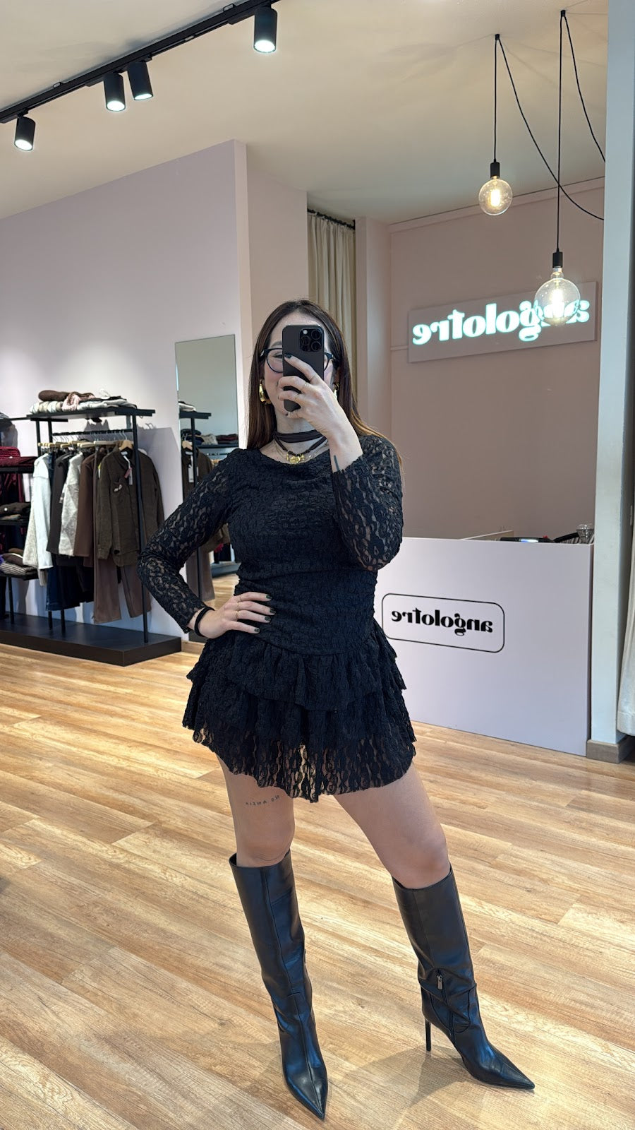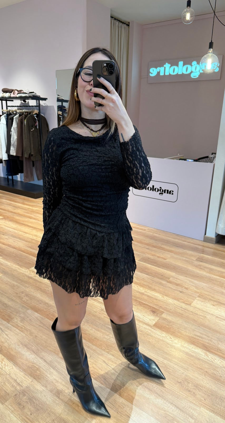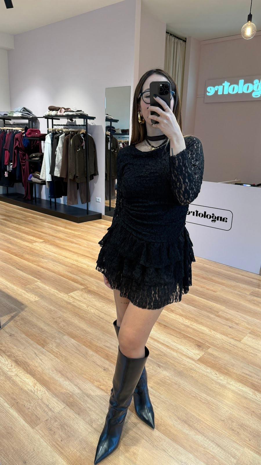Mini abito in pizzo, gonnellina a balze, drappeggio laterale. Greta veste una taglia 40/42.