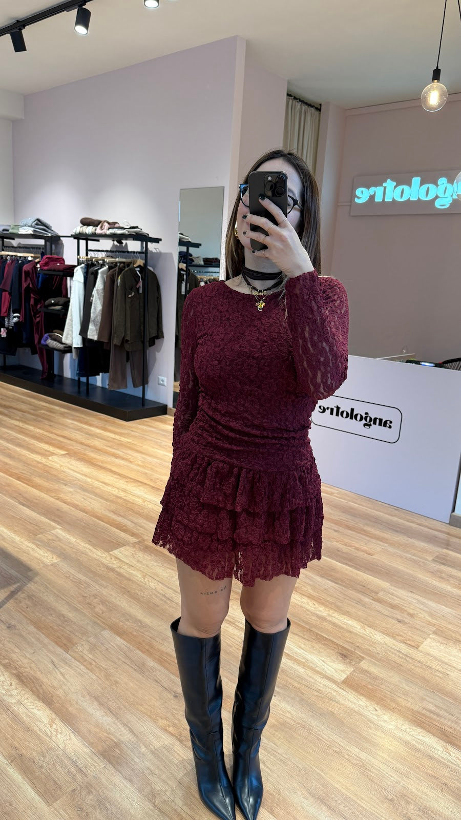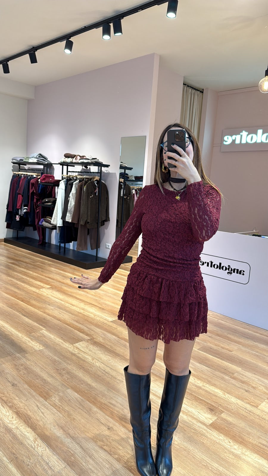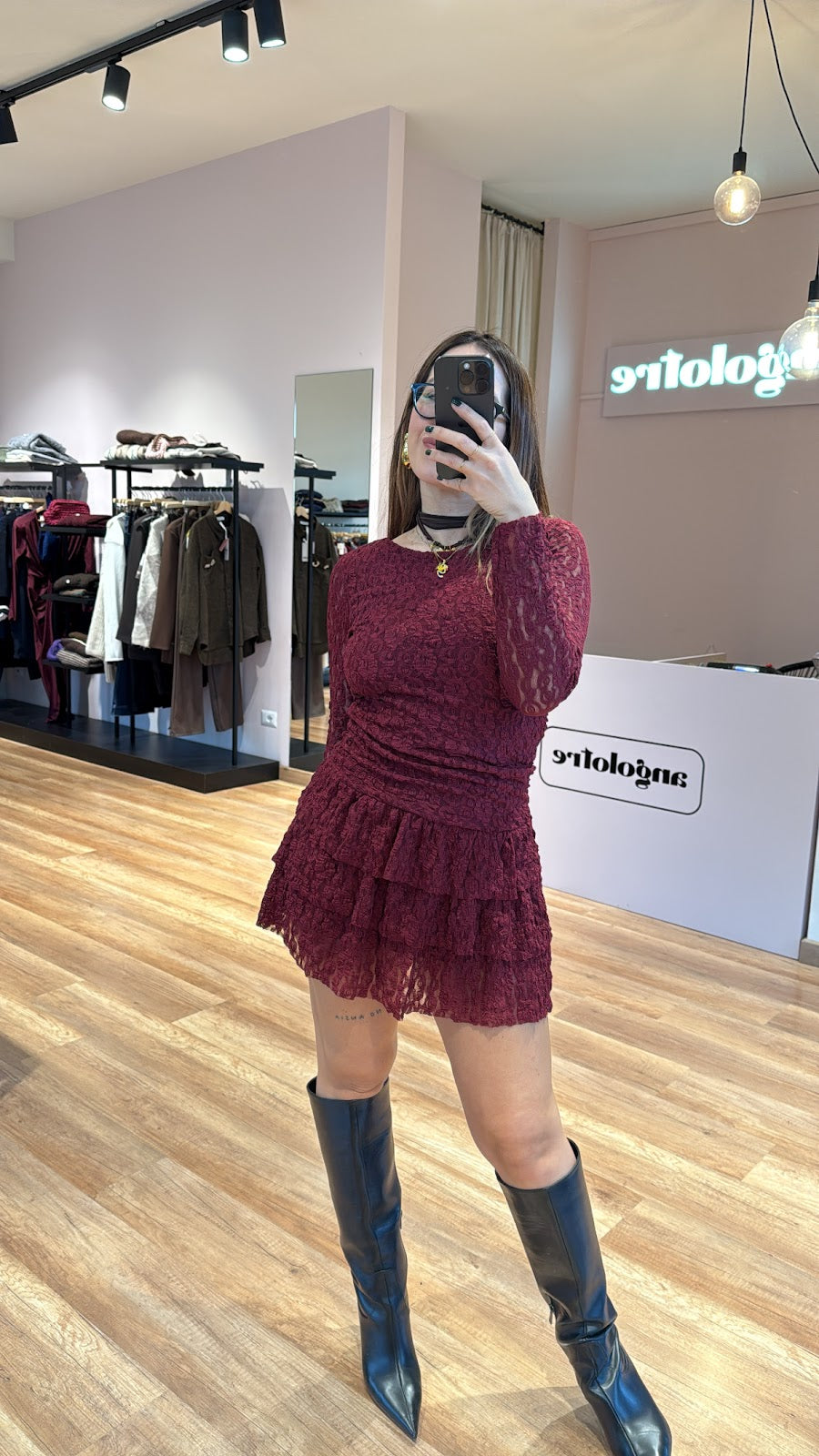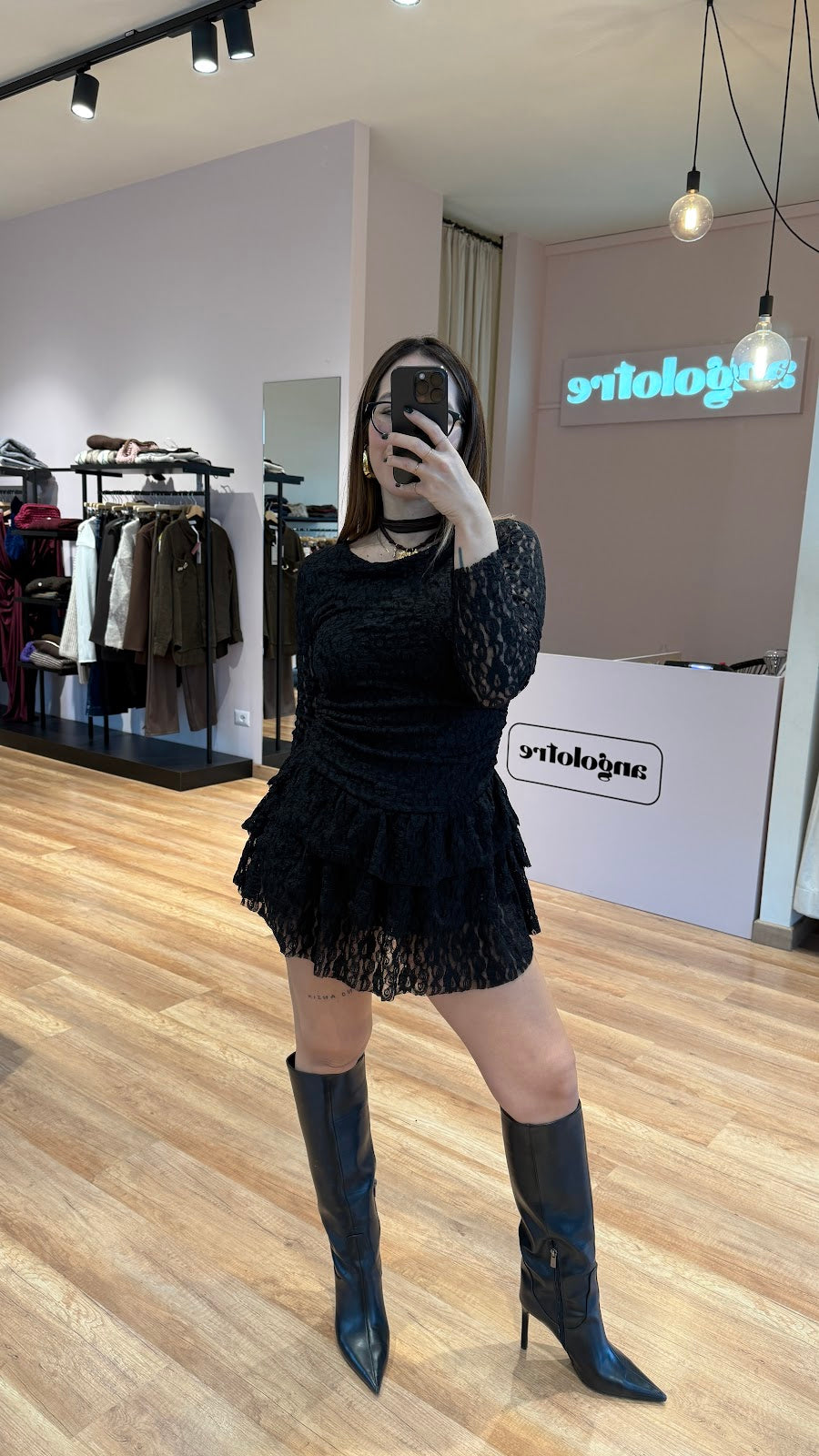 Mini abito in pizzo, gonnellina a balze, drappeggio laterale. Greta veste una taglia 40/42.