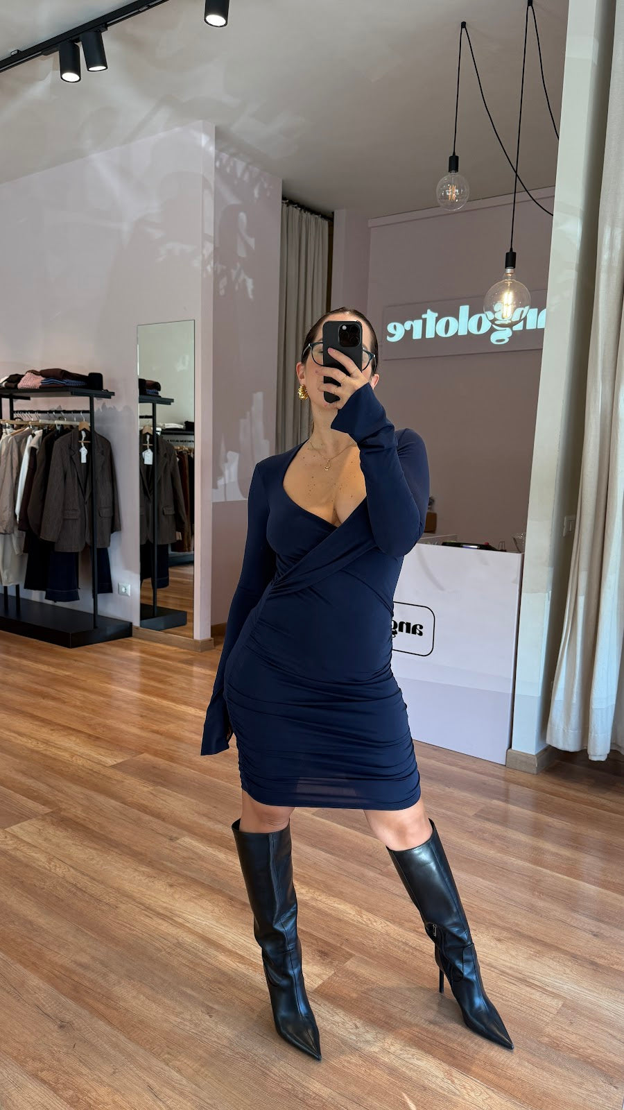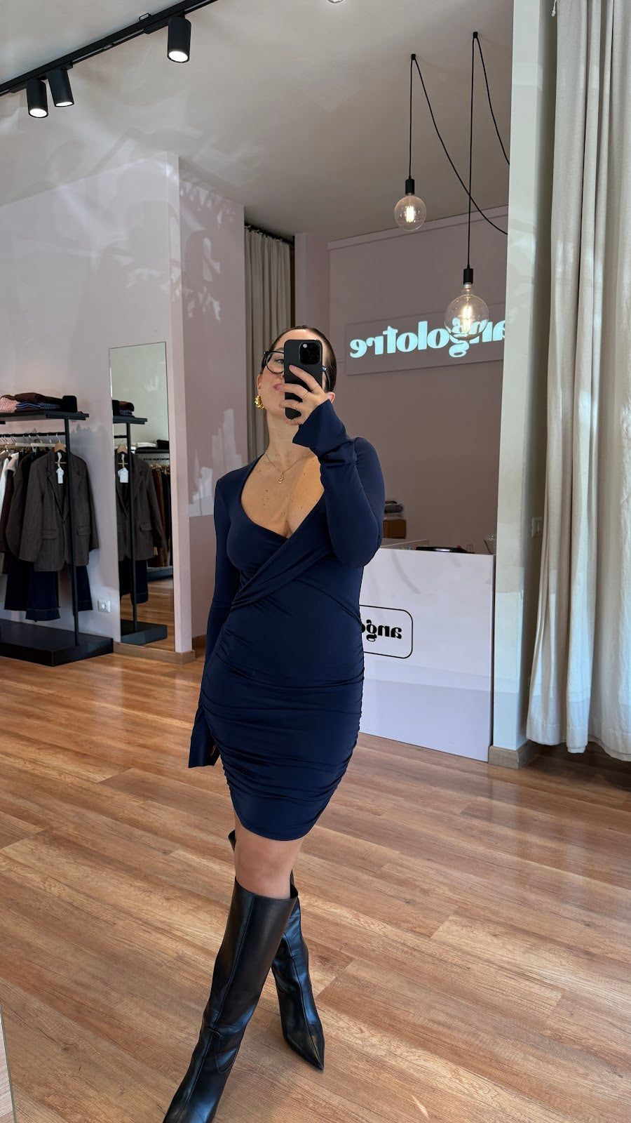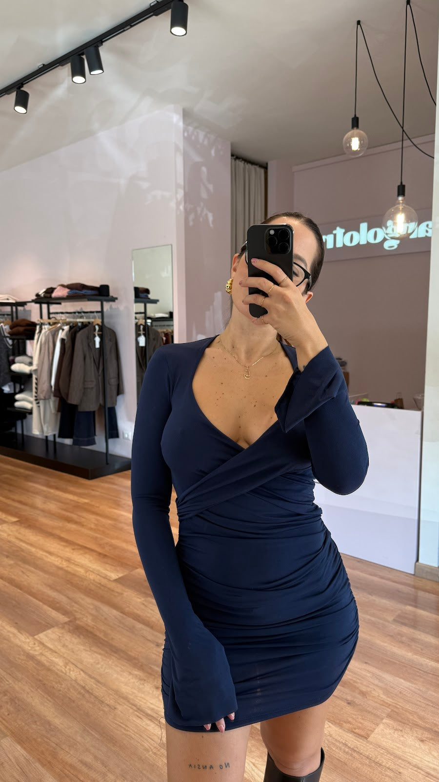 Abito in tessuto elasticizzato, incrociato sul davanti con drappeggio laterale. Manica leggermente a campana. Greta veste una taglia 40/42.