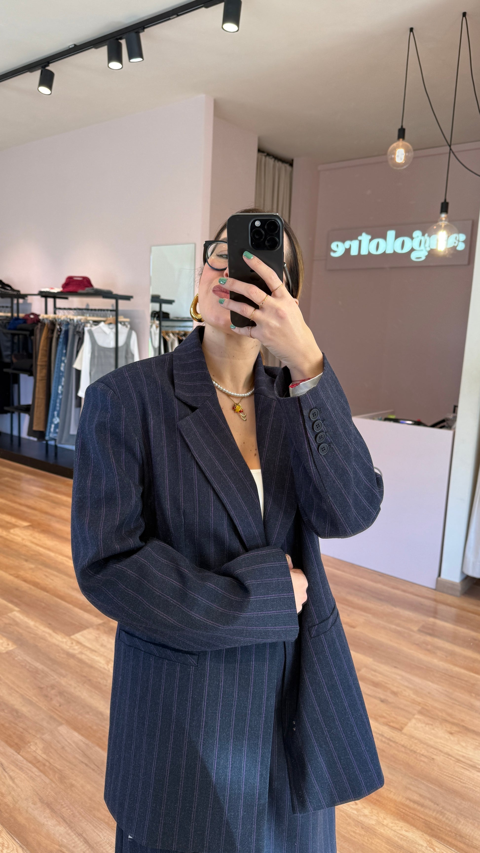 Blazer Lumina gessato monopetto, con tasche a filo sul davanti. Vestibilità oversize. Greta indossa la taglia S/M.
