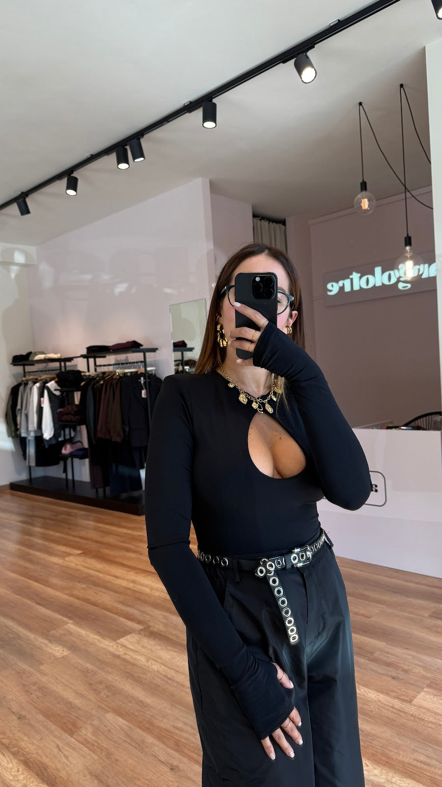 Body manica a guanto in tessuto elasticizzato, spalline e oblò sul davanti. Greta veste una taglia 40/42.