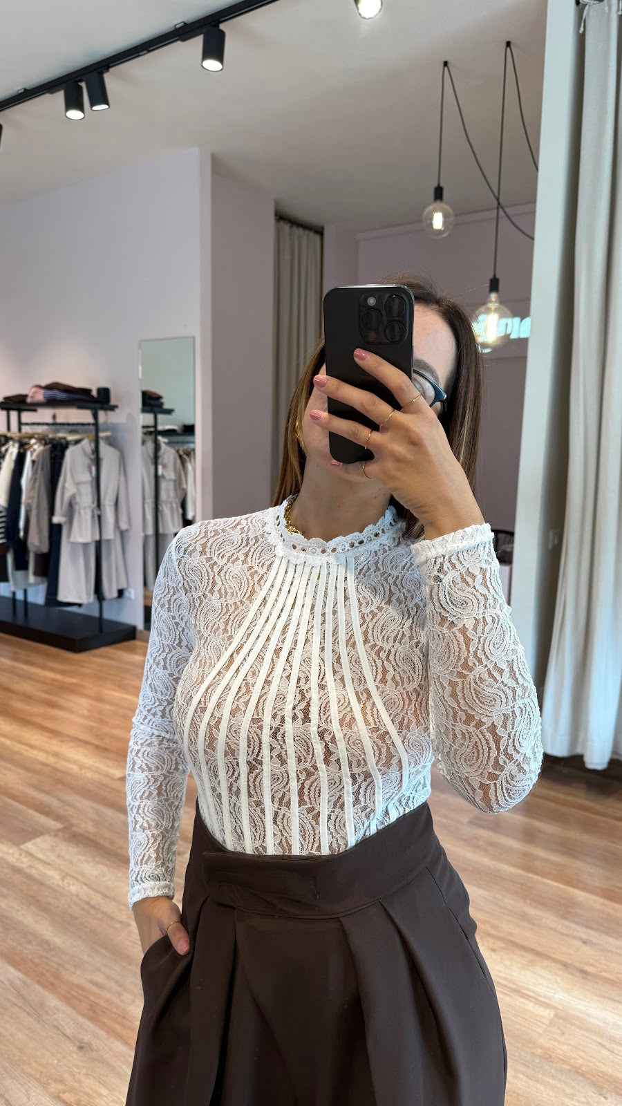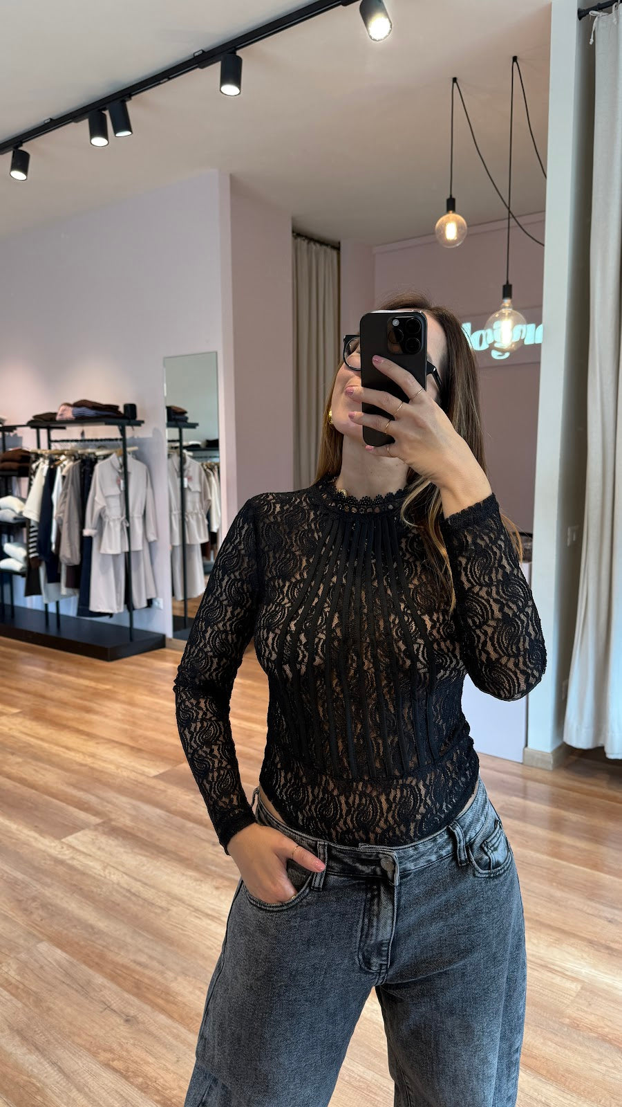 Body in pizzo, con particolare sul davanti. Greta indossa una taglia S/M.
