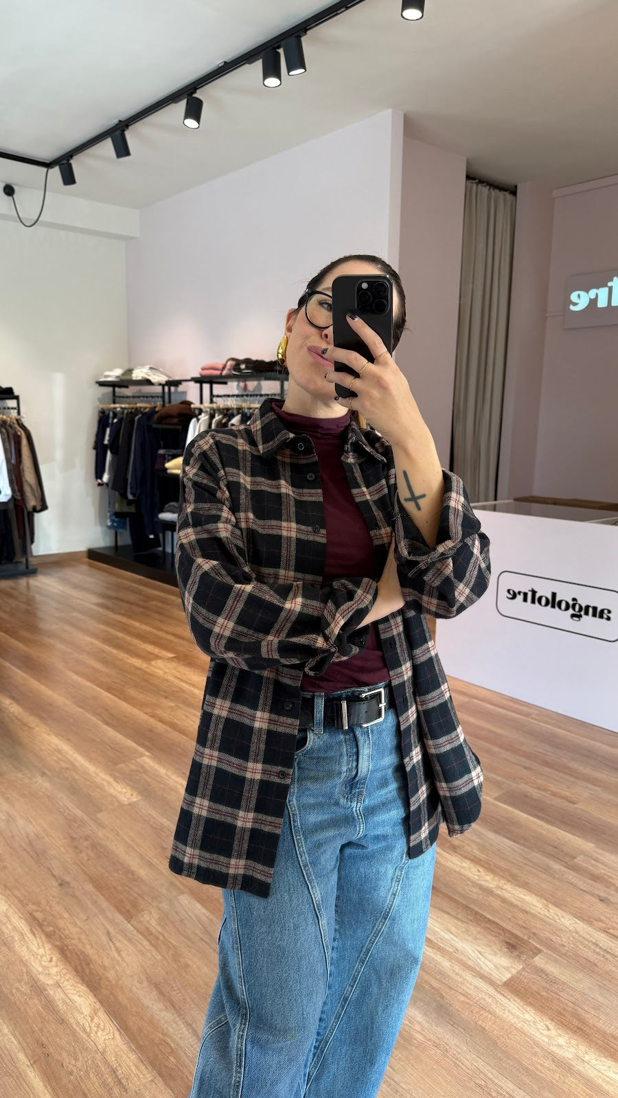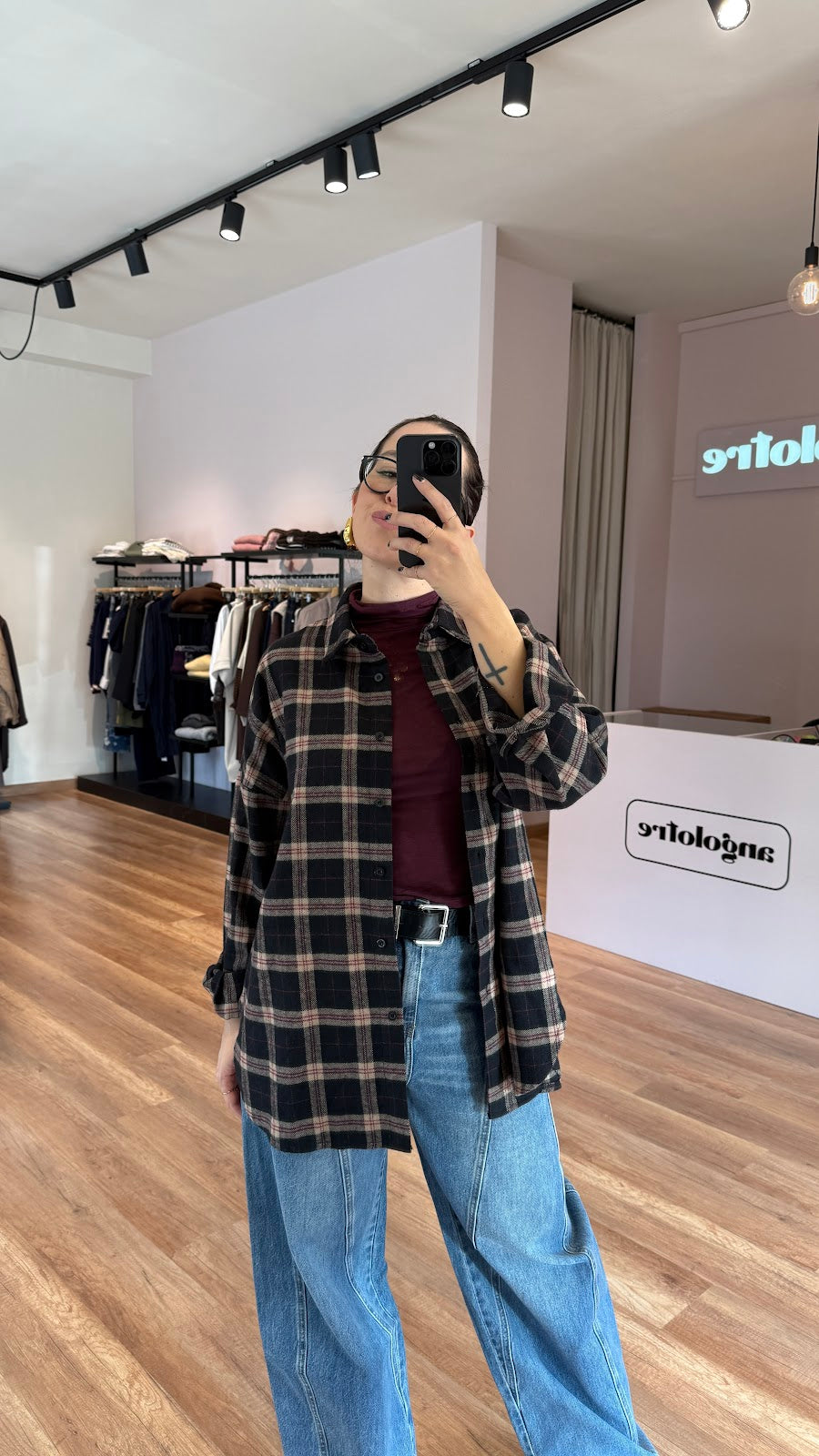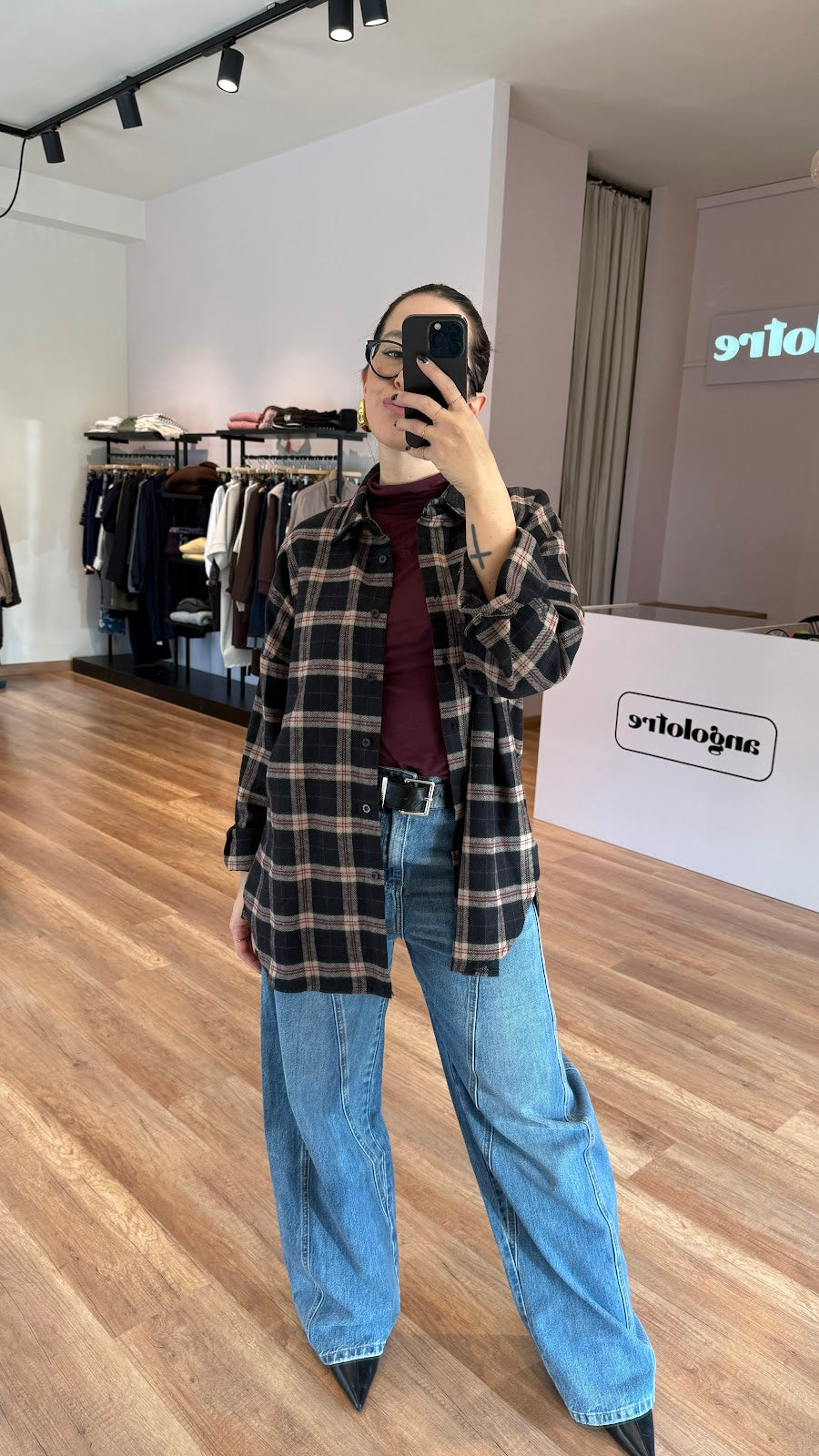 Camicia in panno a scacchi. vestibilità over. Soffietto dietro. Greta veste una taglia 40/42.