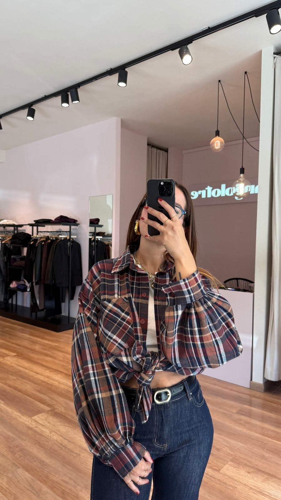 Camicia over scacco con taschina, parte posteriore con fondo stondato. 95% cotone, 5%lana. Greta veste una taglia 40/42.