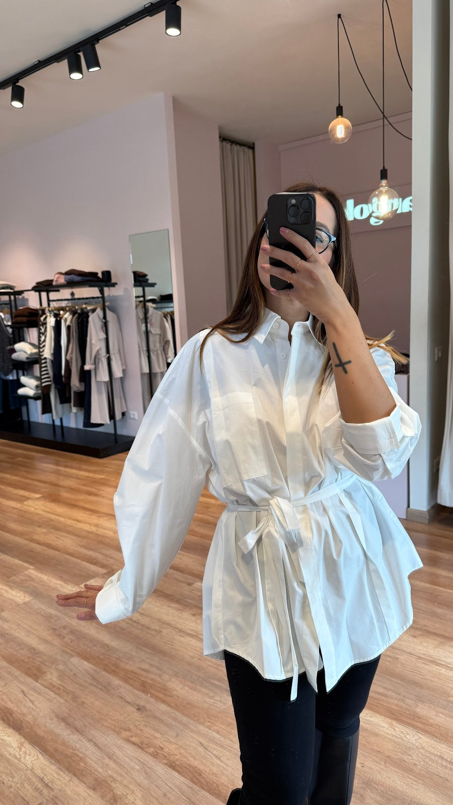 Camicia in cotone, fondo stondato, con cintina in tessuto in vita, bottoni a scomparsa. Spalla scesa, taschina laterale e doppio soffietto dietro. Greta veste una tagia 40/42.