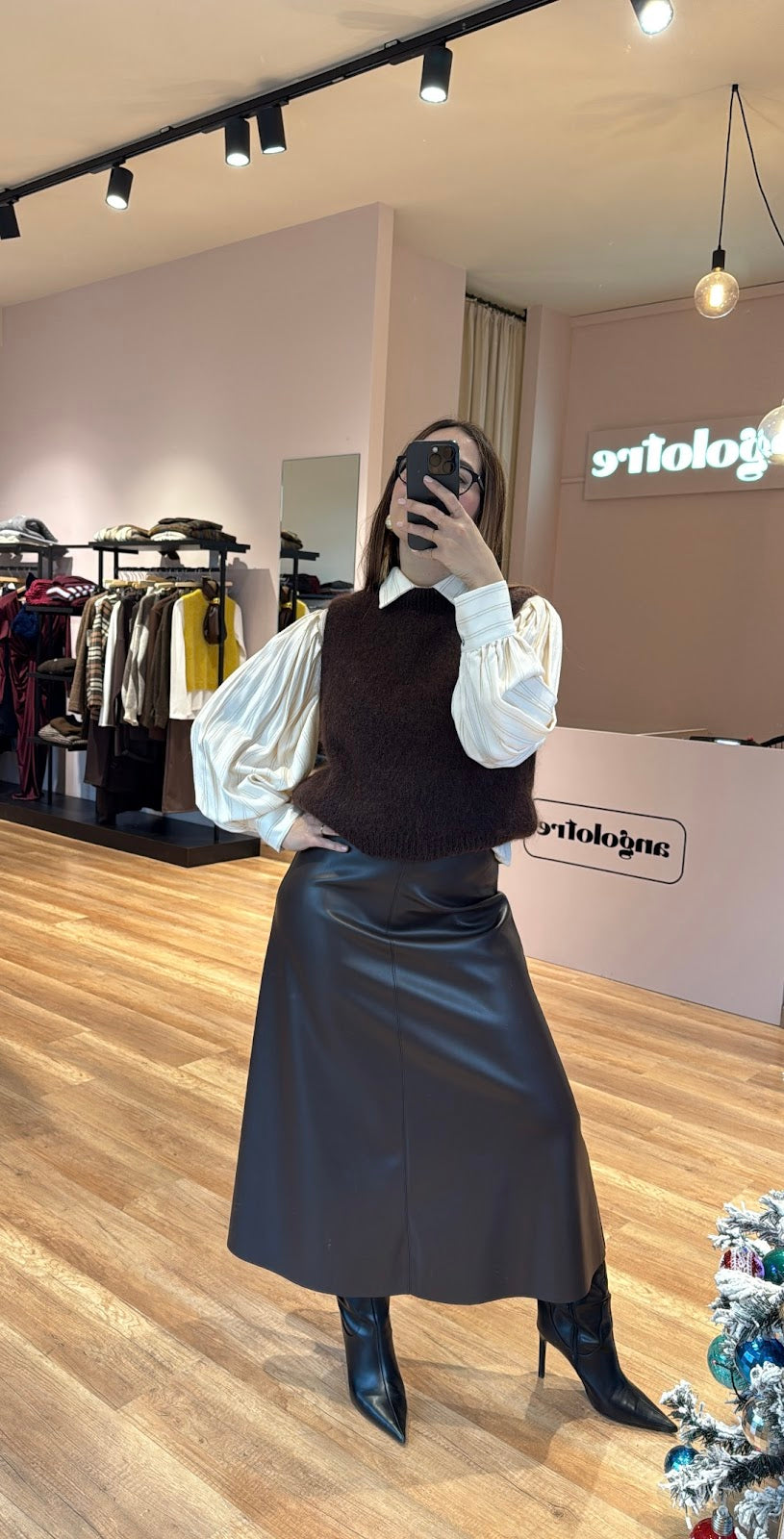 Camicia in viscosa, gessata con taschino laterale e manica a palloncino. Greta indossa la taglia S.