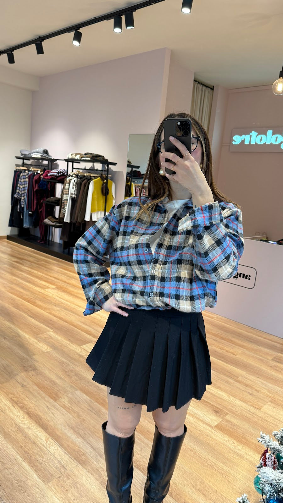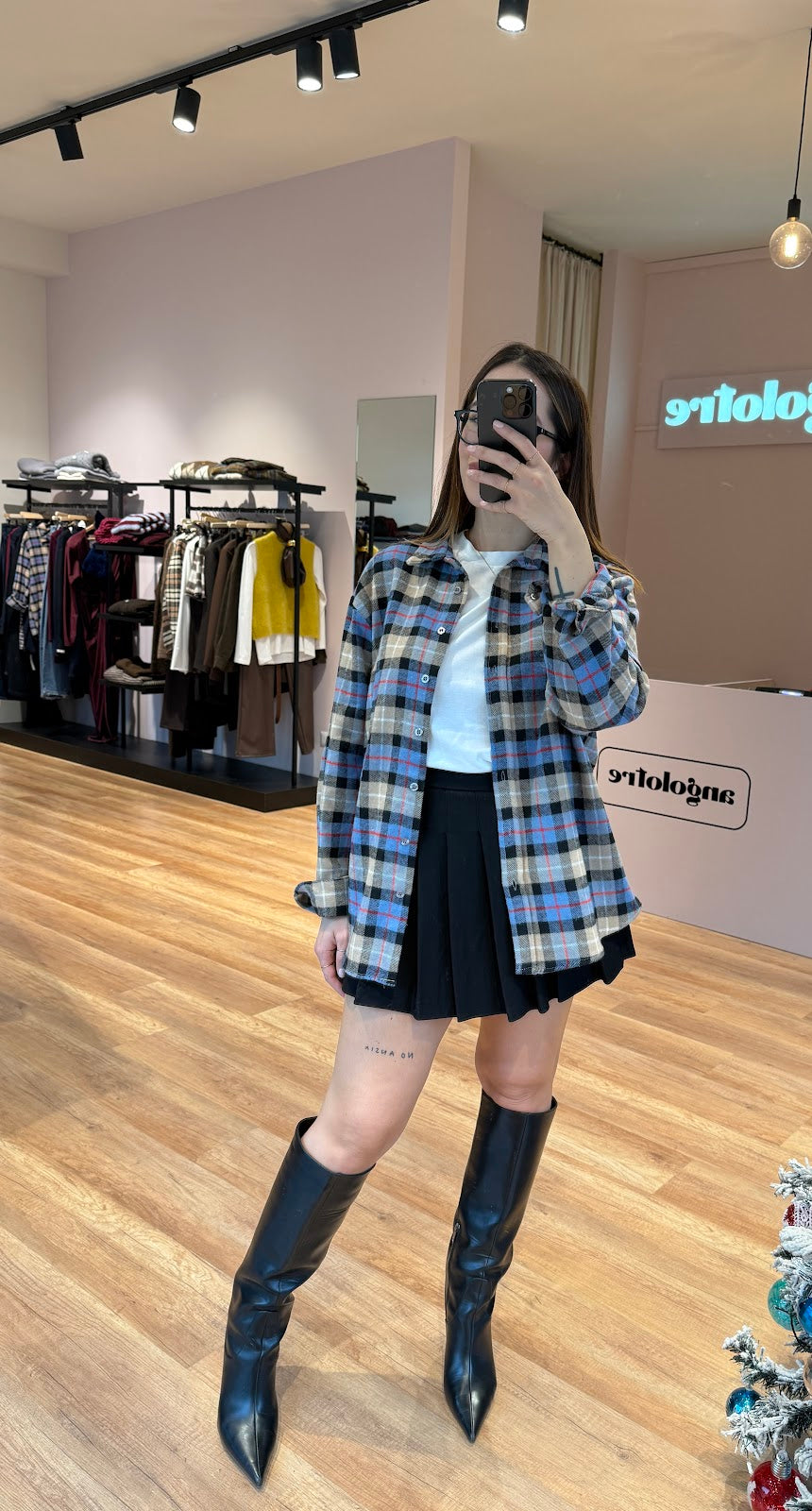Camicia in panno fantasia scacco, spalla scesa, soffietto parte posteriore. Greta veste una taglia 40/42.