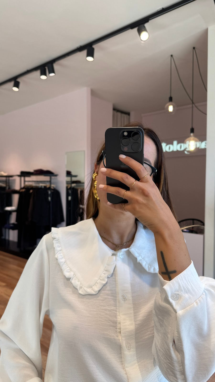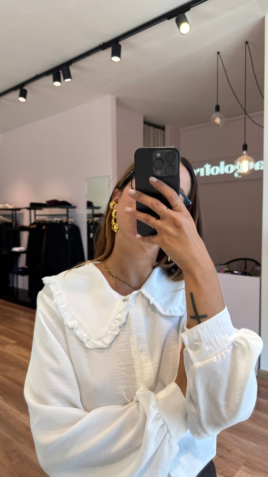Camicia con ampio colletto rifinito da rouches effetto bon ton, manica a palloncino. Greta veste una taglia 40/42.
