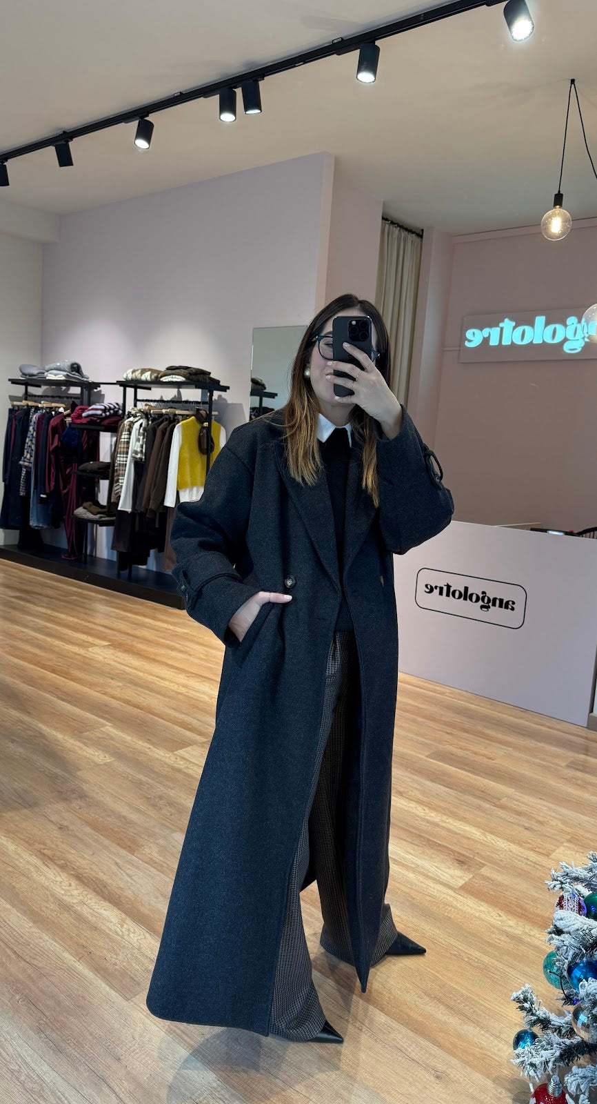 Cappotto lungo doppiopetto con cintina sul polso, taschine a filo. Taglia unica, veste fino a una 46. Greta veste una taglia 40/42.