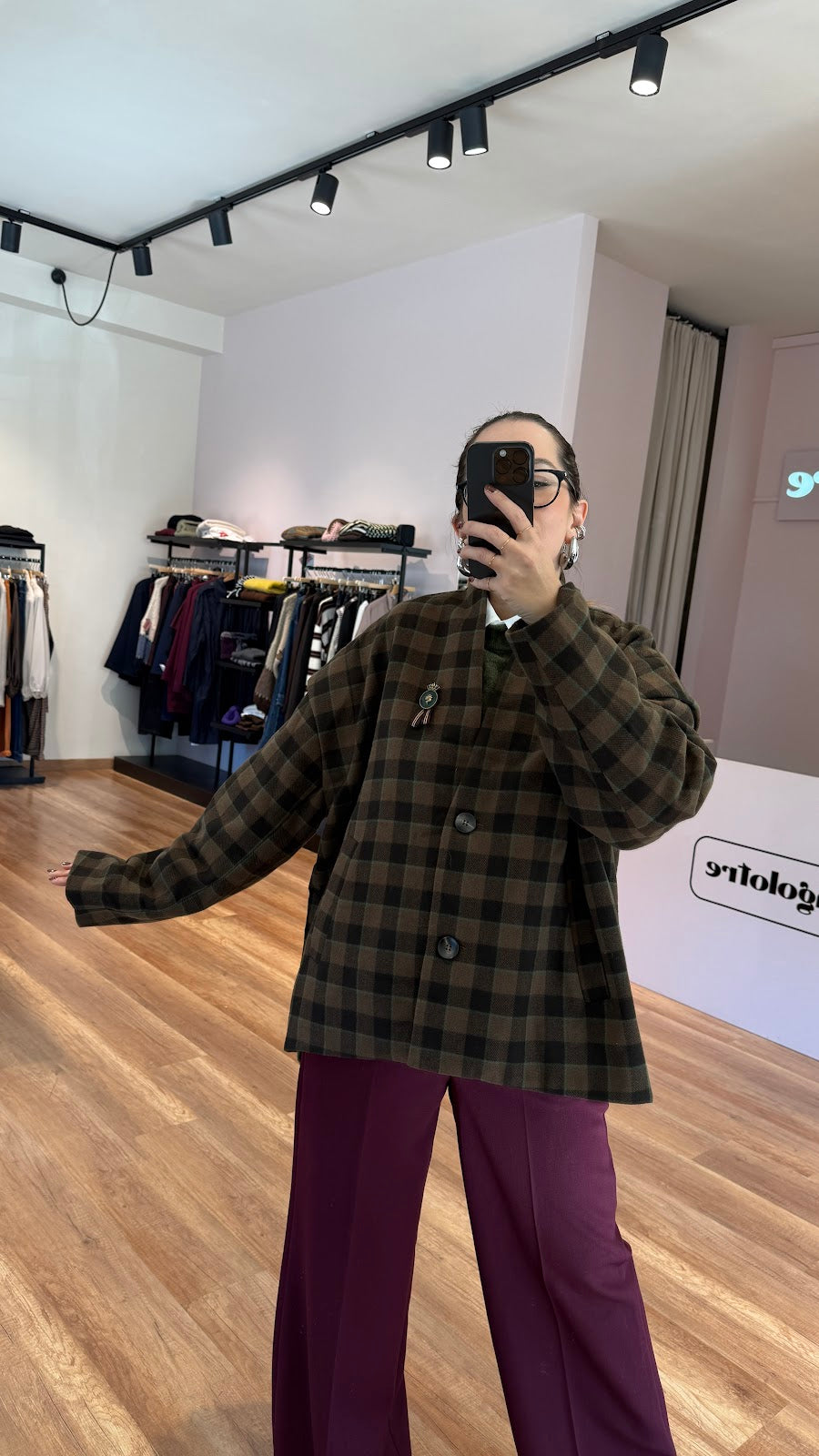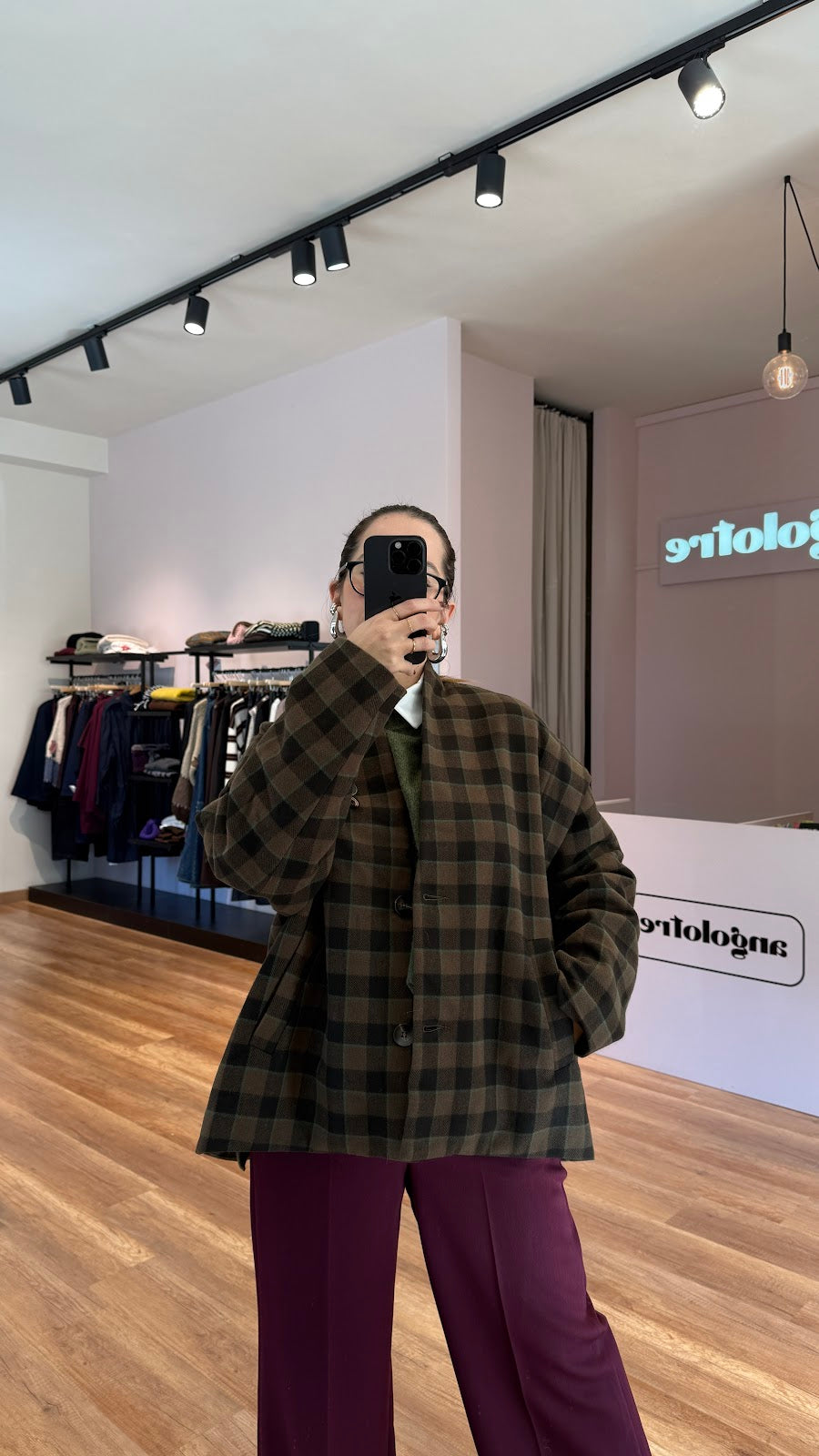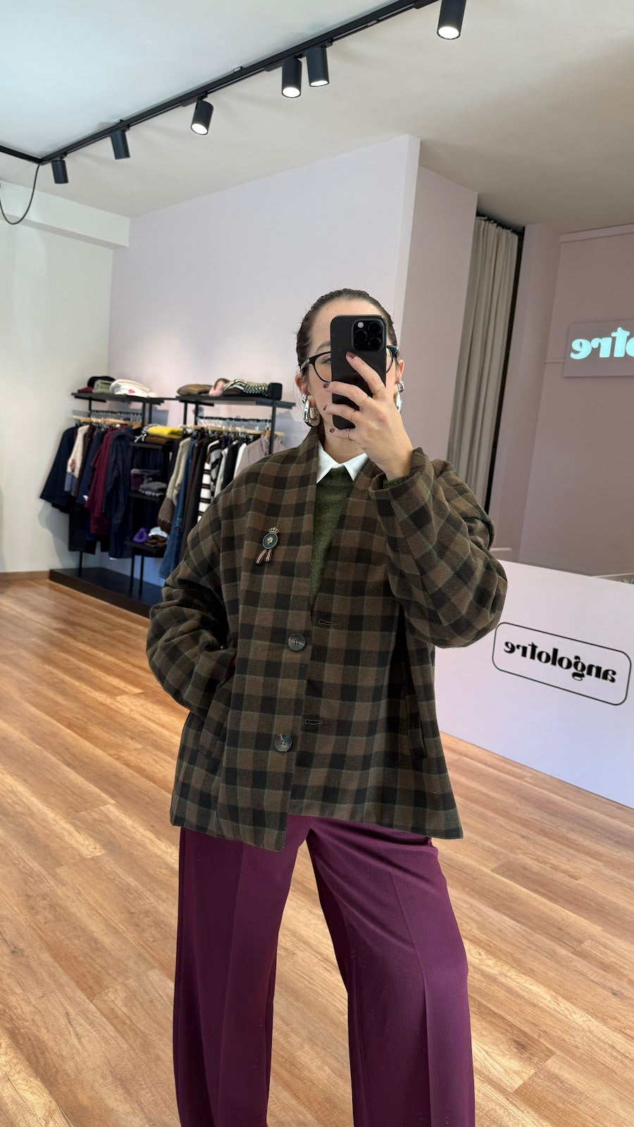 Cappottino corto a quadri, con particolare sulla manica, collo sciallato, Spilla sul davanti. Greta veste una taglia 40/42.