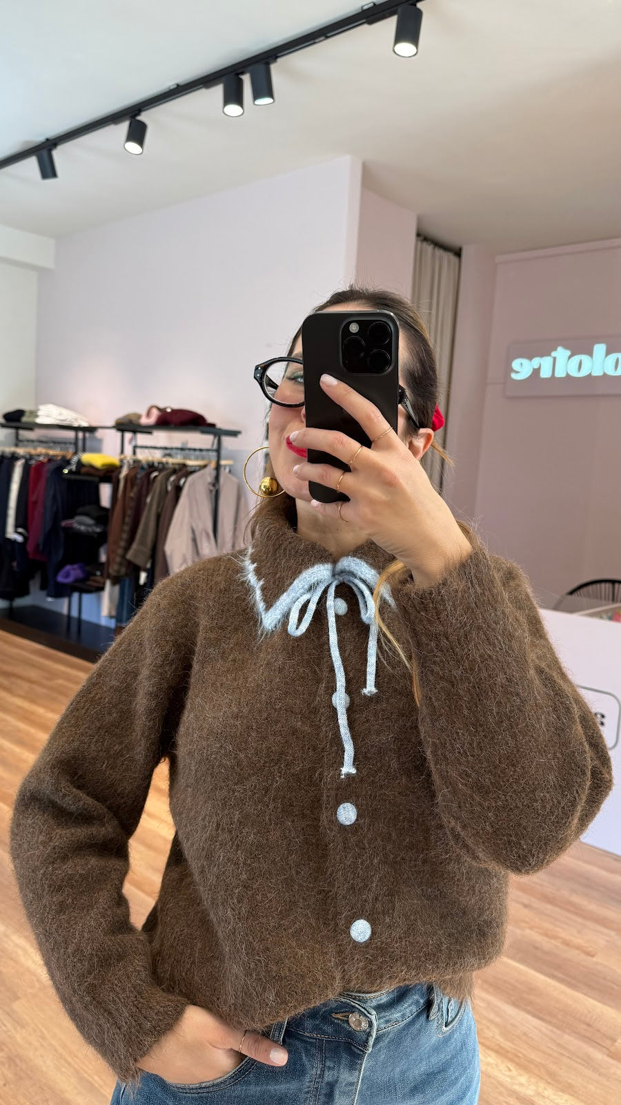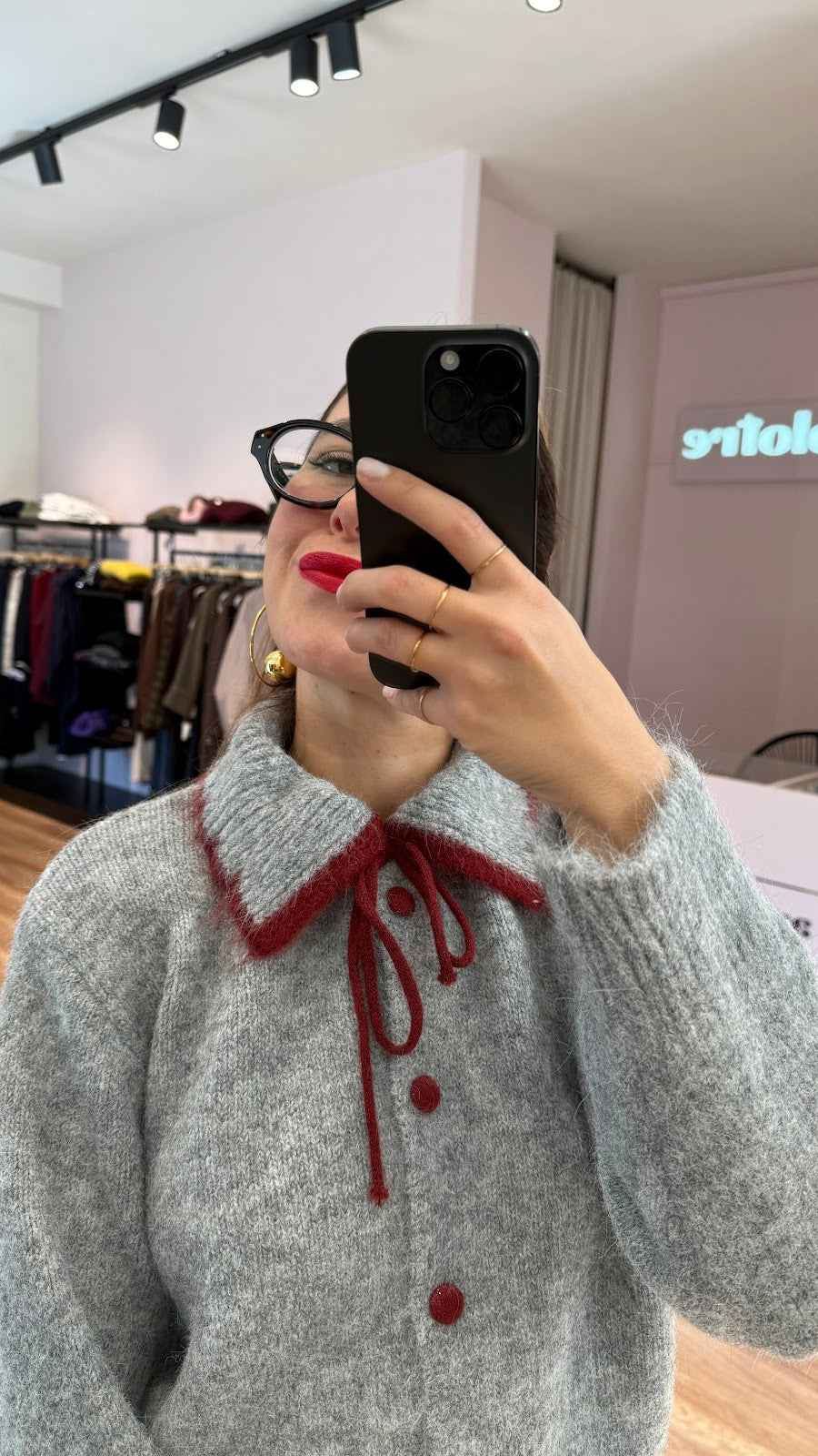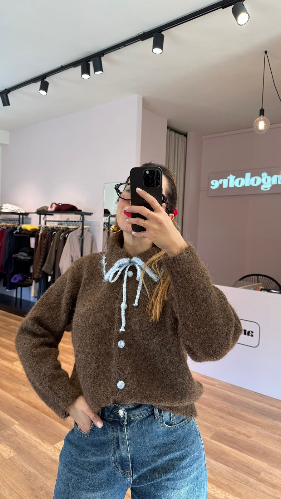 Cardigan con collo a polo, laccetti sul davanti, bottoni ricoperti. Vestibilità morbida, taglia unica, veste fino a una taglia L. Greta veste una taglia 40/42.