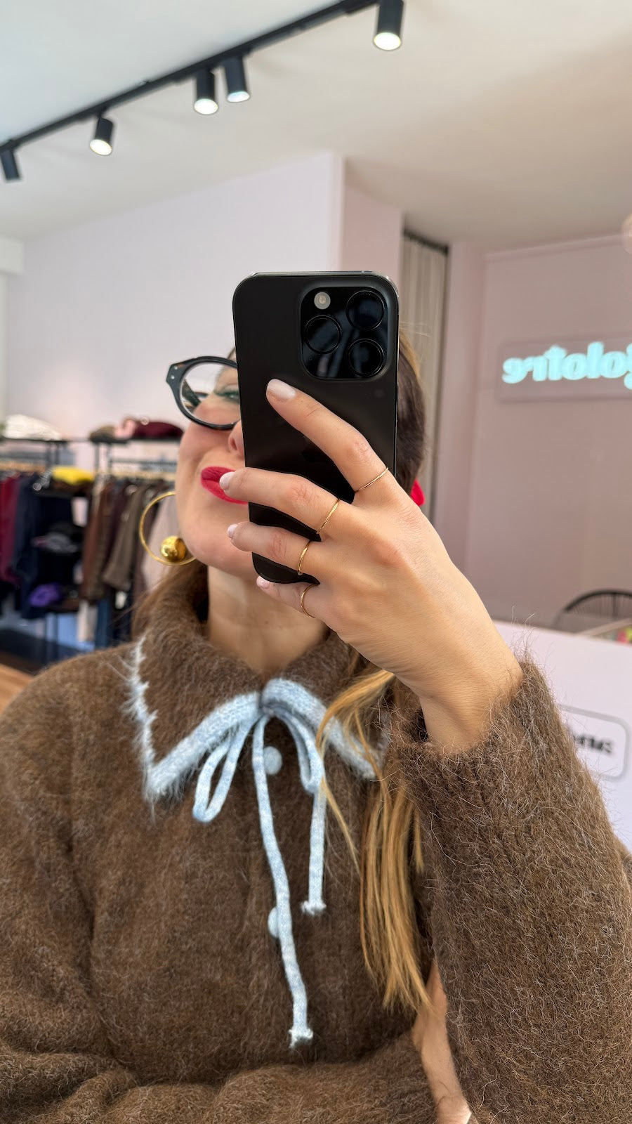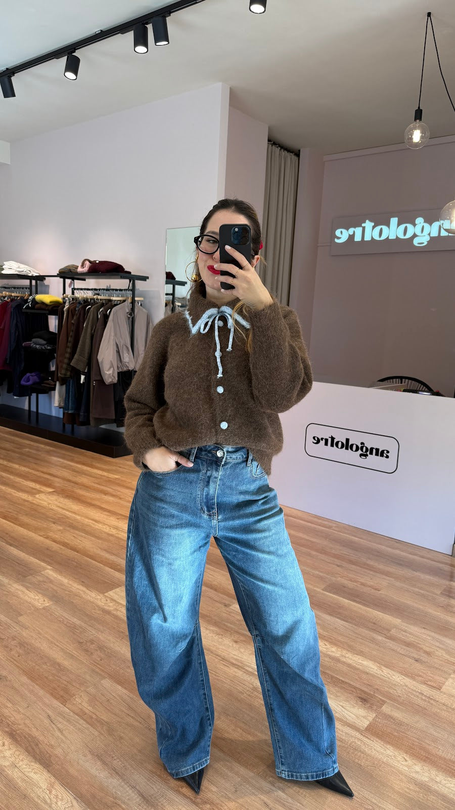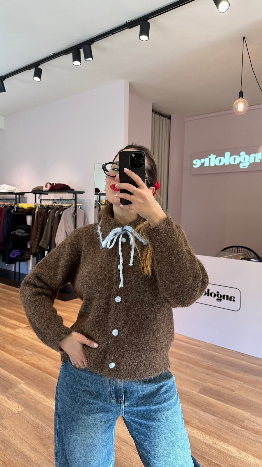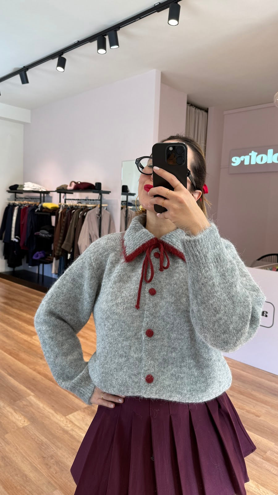 Cardigan con collo a polo, laccetti sul davanti, bottoni ricoperti. Vestibilità morbida, taglia unica, veste fino a una taglia L. Greta veste una taglia 40/42.