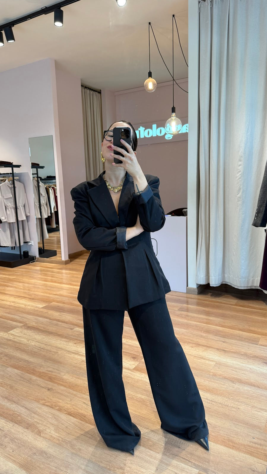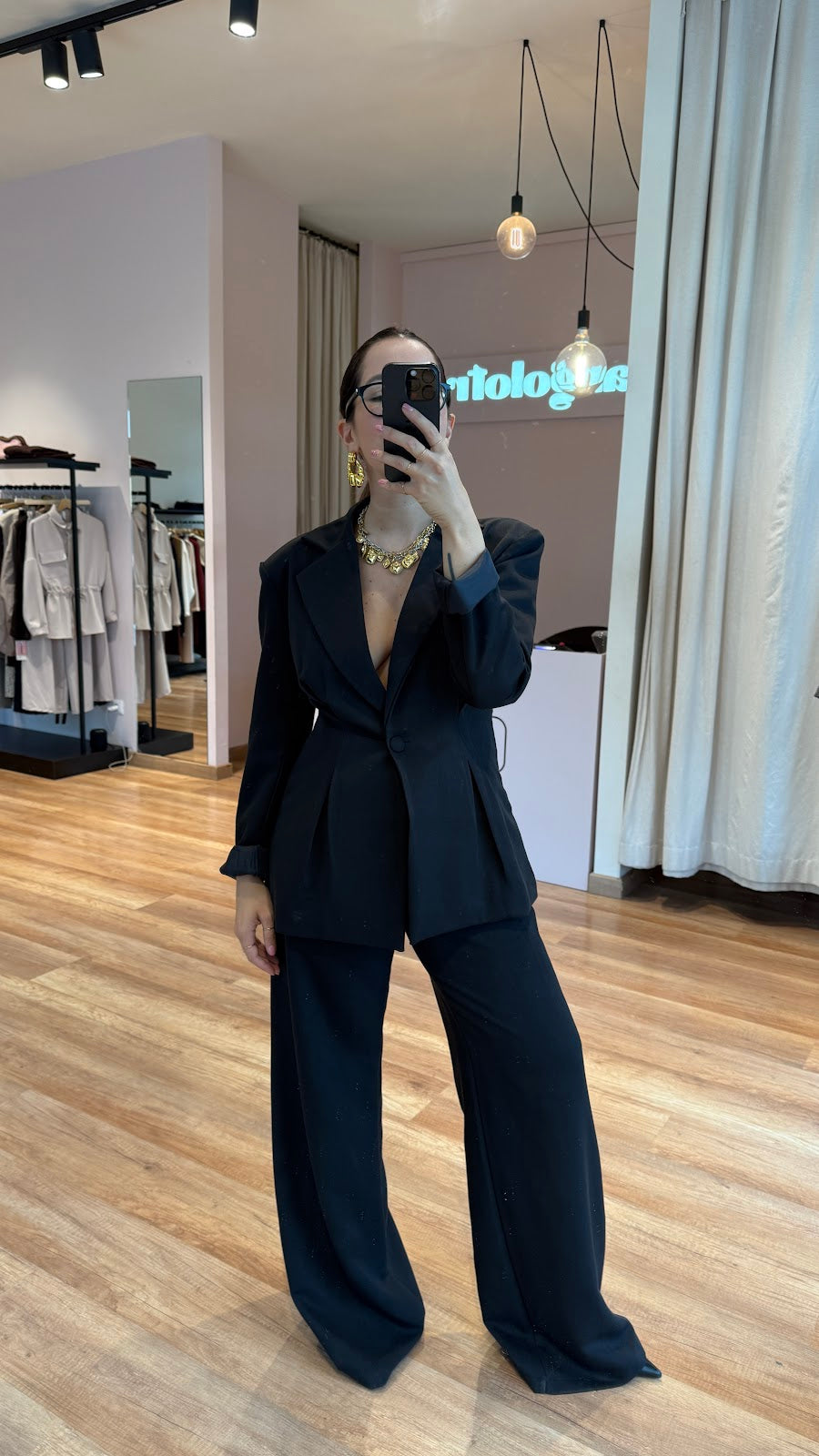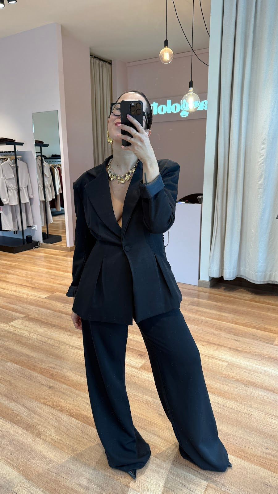 Completo composto da blazer avvitato monopetto con bottone ricoperto, pinces avanti e dietro e spalline più pantalone palazzo con elastico dietro, pinces e tasche laterali. Greta veste una taglia S/M.