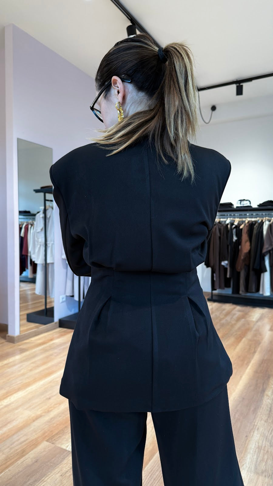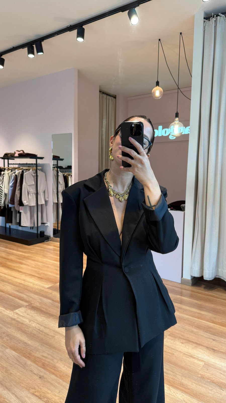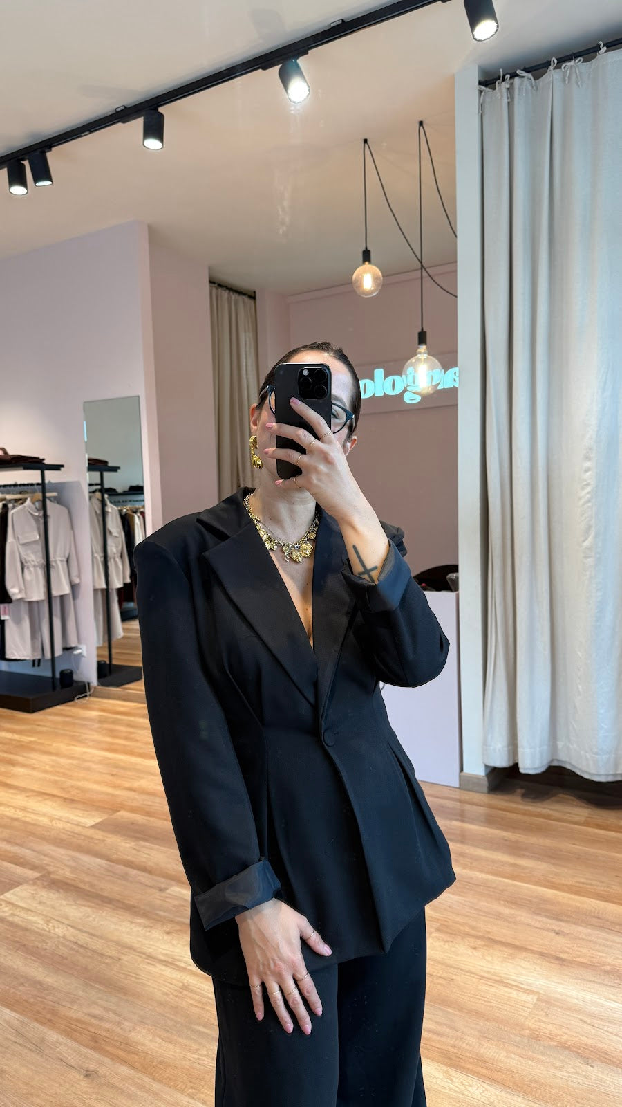 Completo composto da blazer avvitato monopetto con bottone ricoperto, pinces avanti e dietro e spalline più pantalone palazzo con elastico dietro, pinces e tasche laterali. Greta veste una taglia S/M.