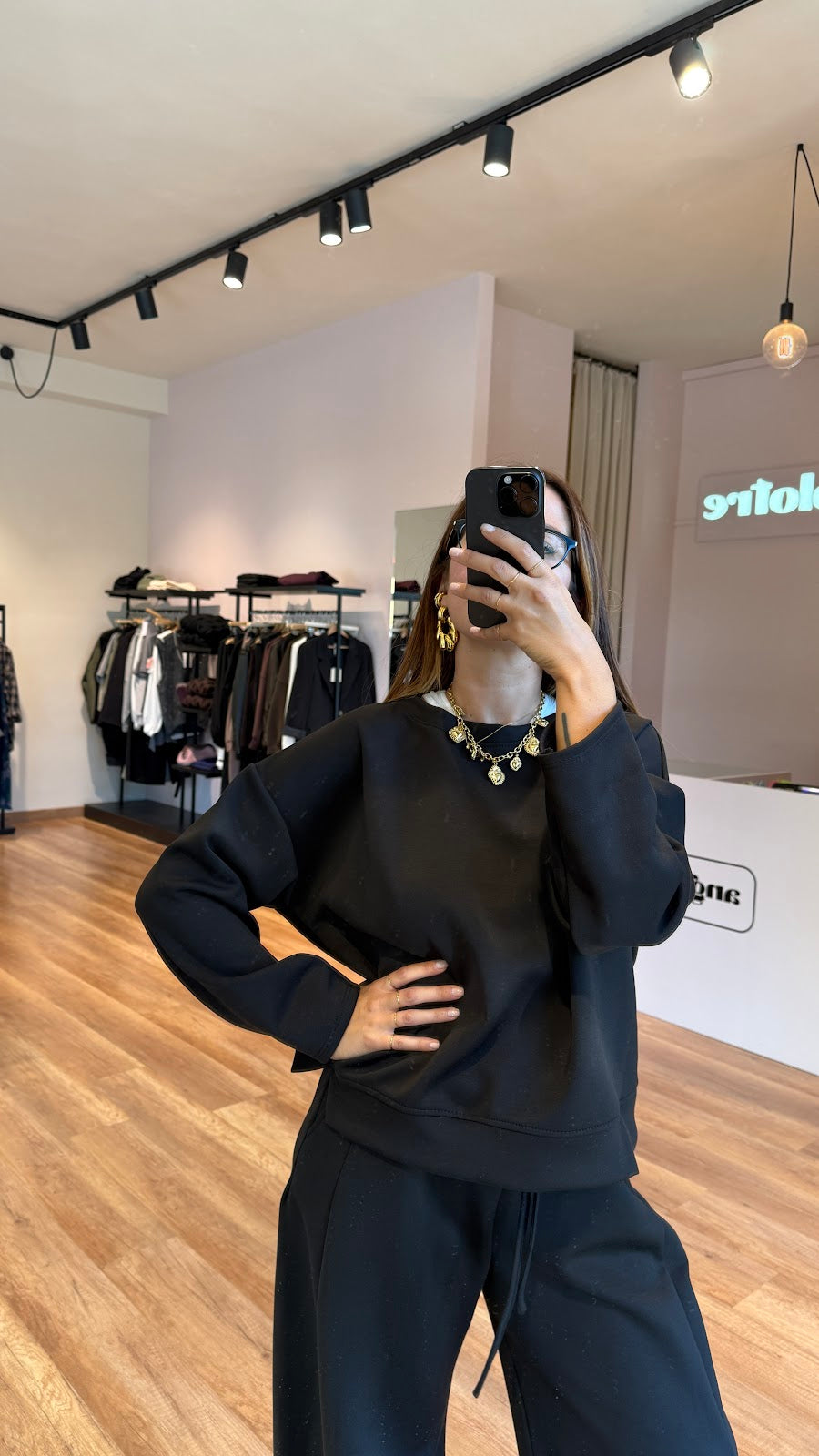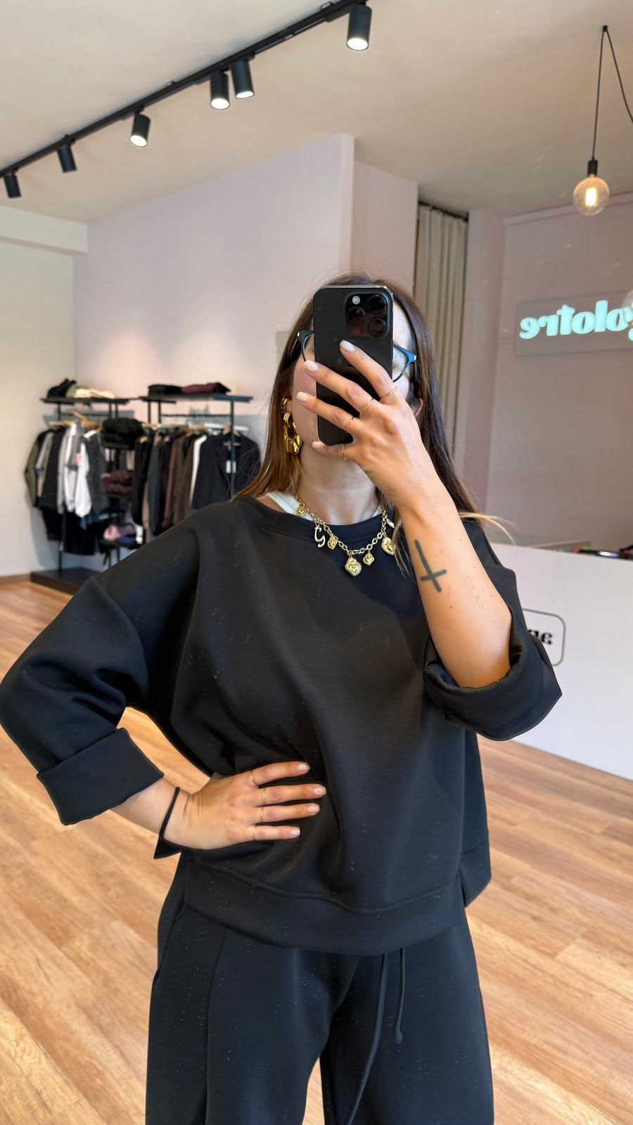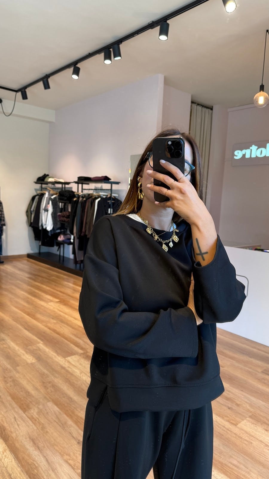 Felpa girocollo a scatolina in tessuto scuba, spacchetti frontali. Spalla scesa, vestibilità over. Greta veste una taglia 40/42.
