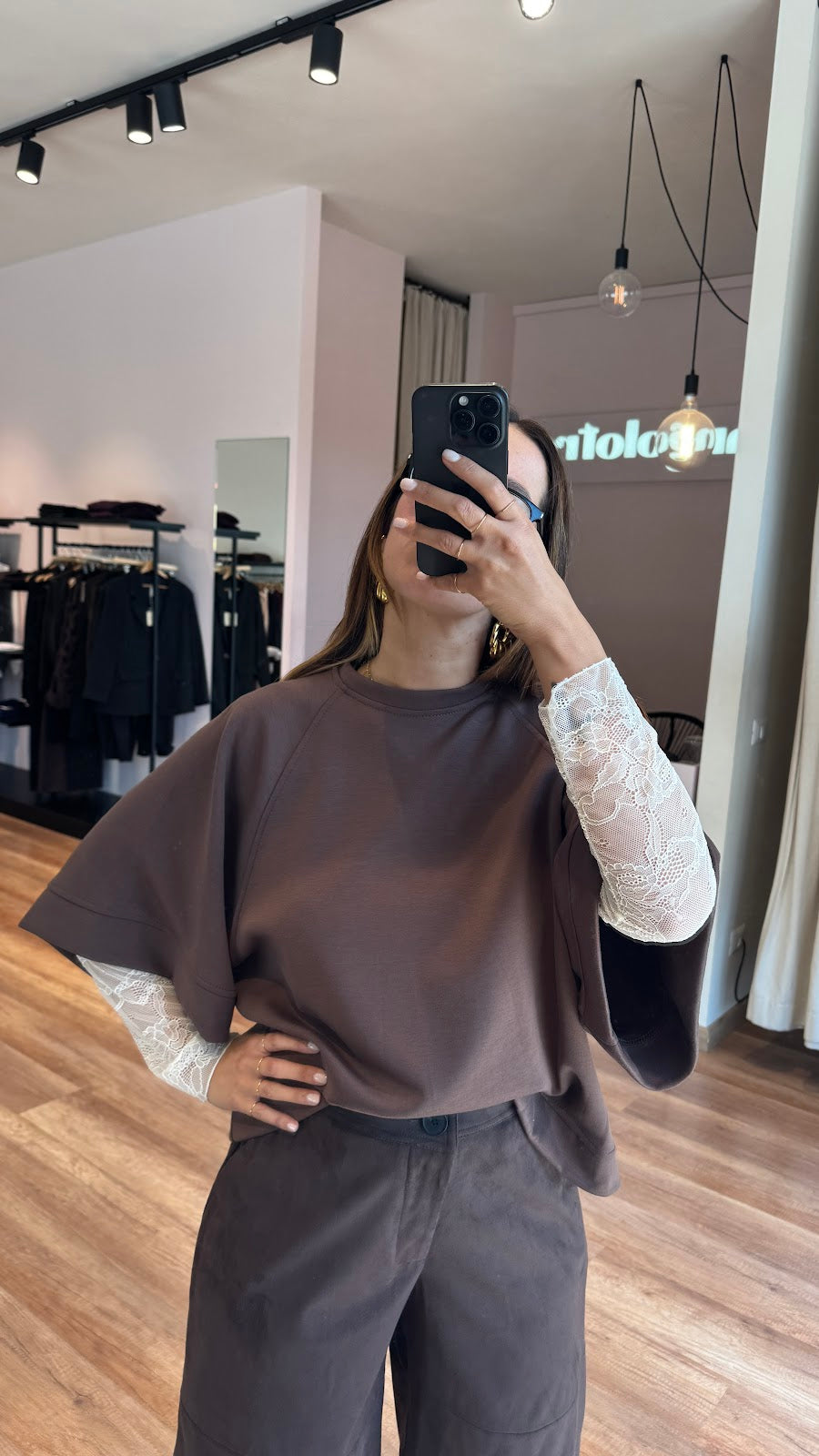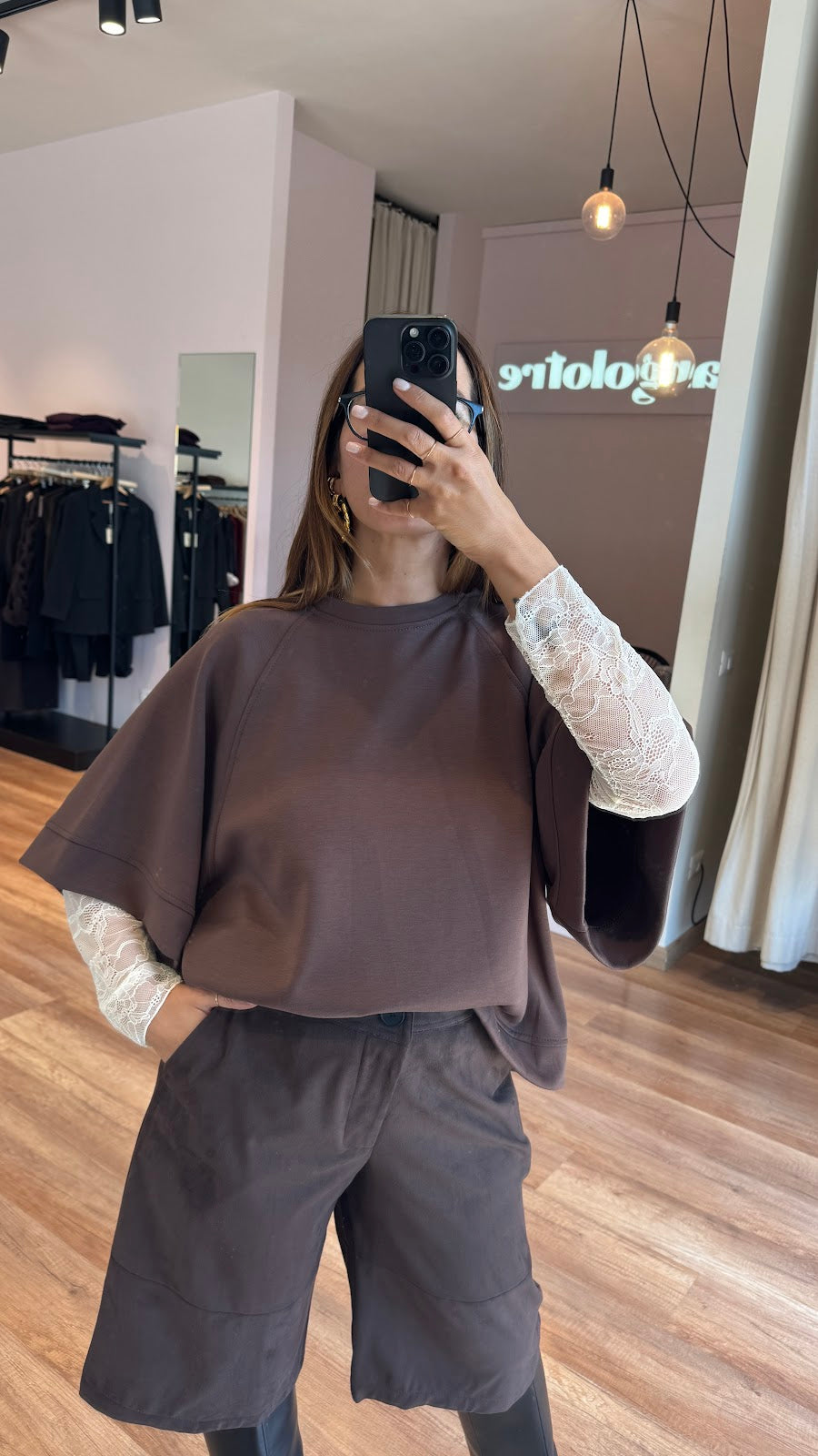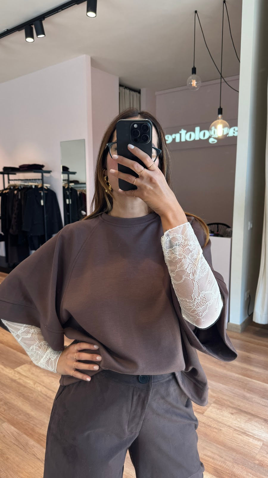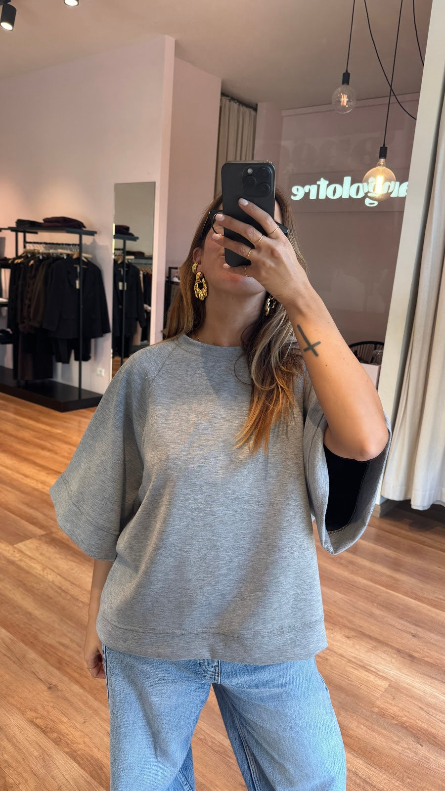 Felpa a scatolina manica a 3/4 raglan in tessuto scuba. Greta veste una taglia 40/42.