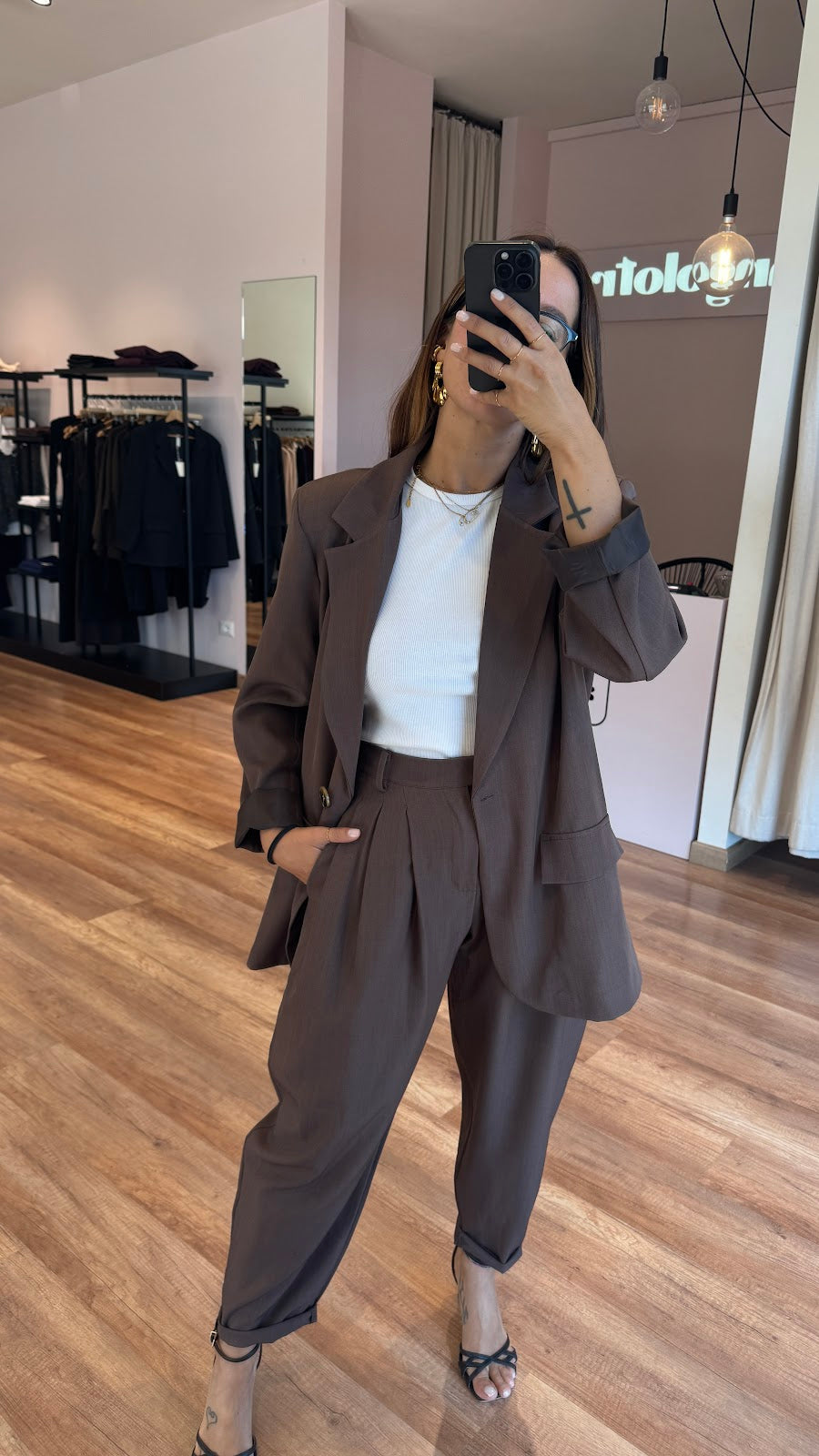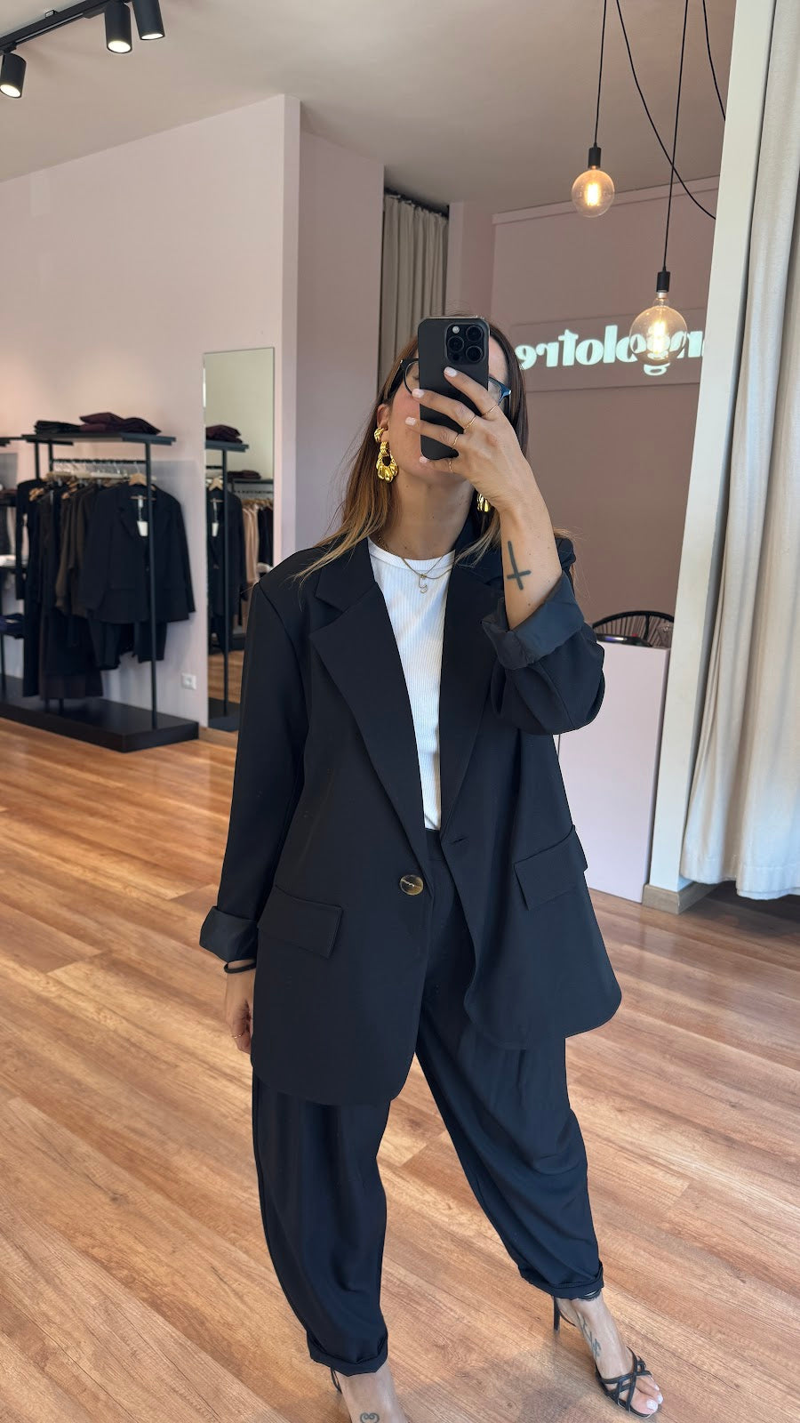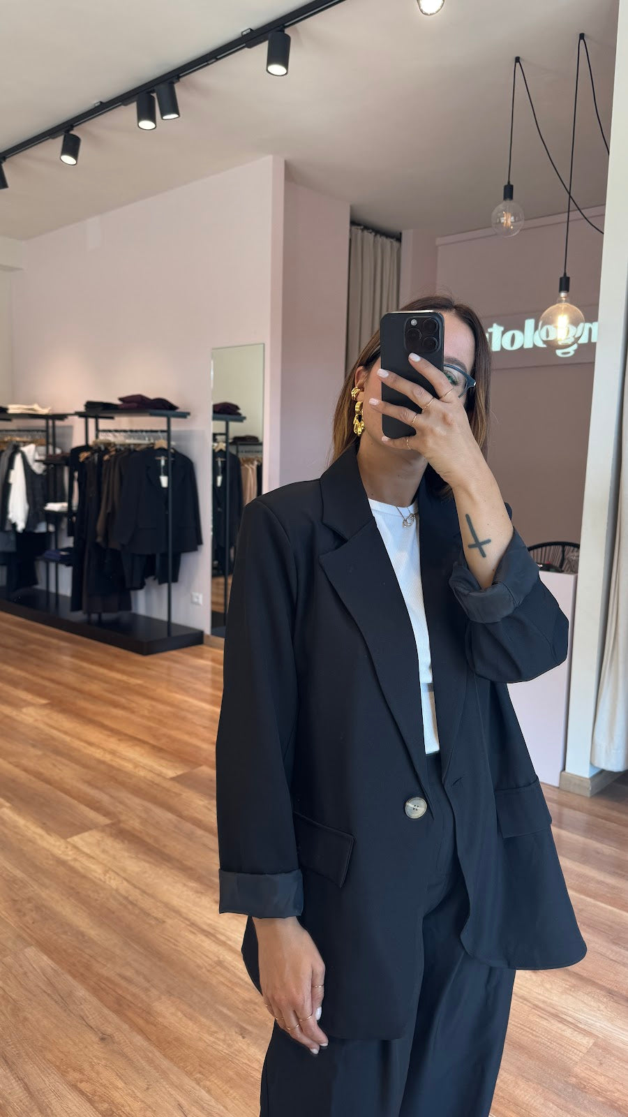 Giacca over monopetto. Tasche frontali non apribili. Greta veste una taglia 40/42
