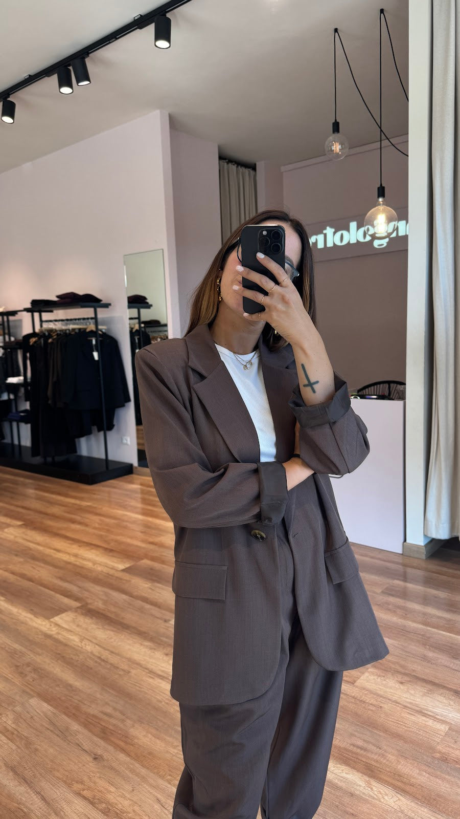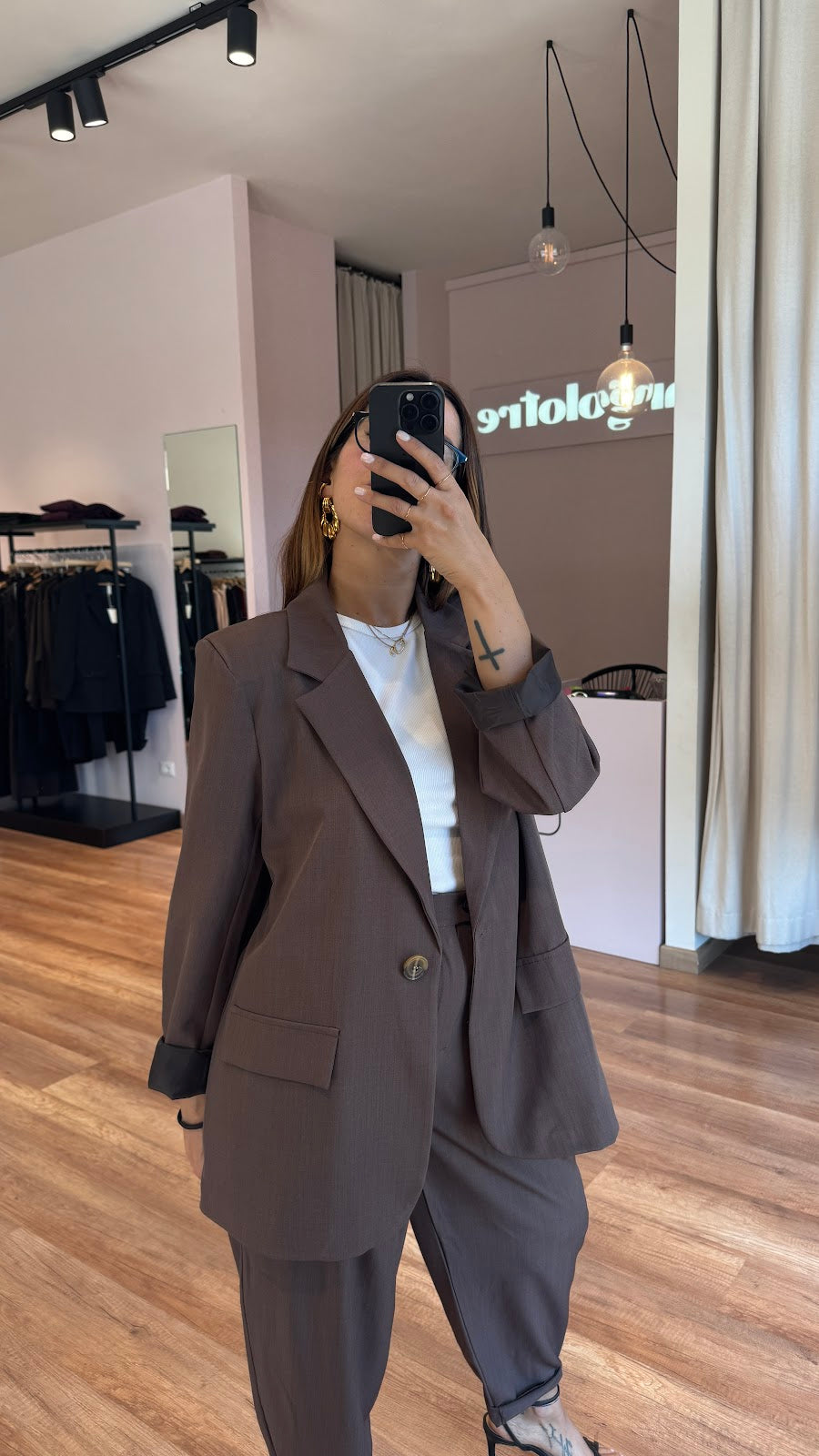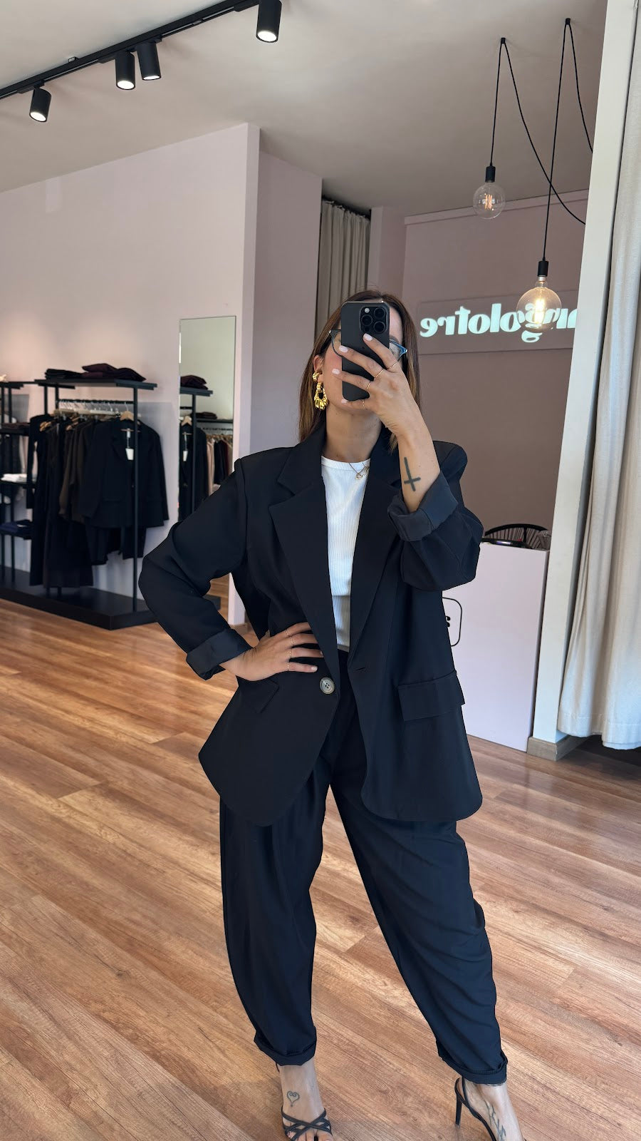 Giacca over monopetto. Tasche frontali non apribili. Greta veste una taglia 40/42