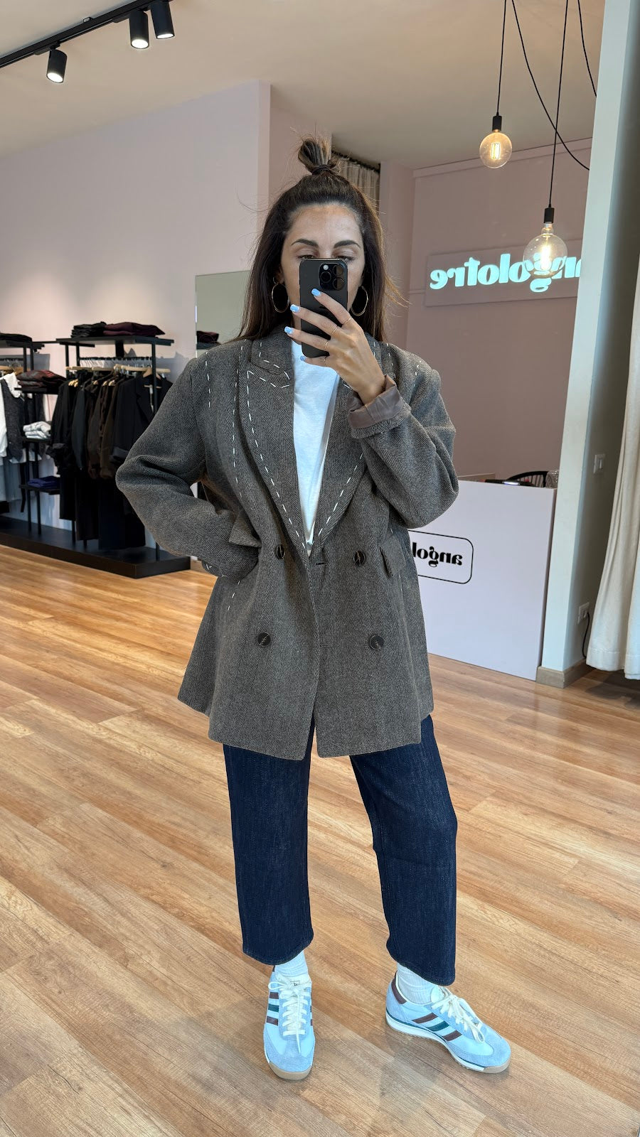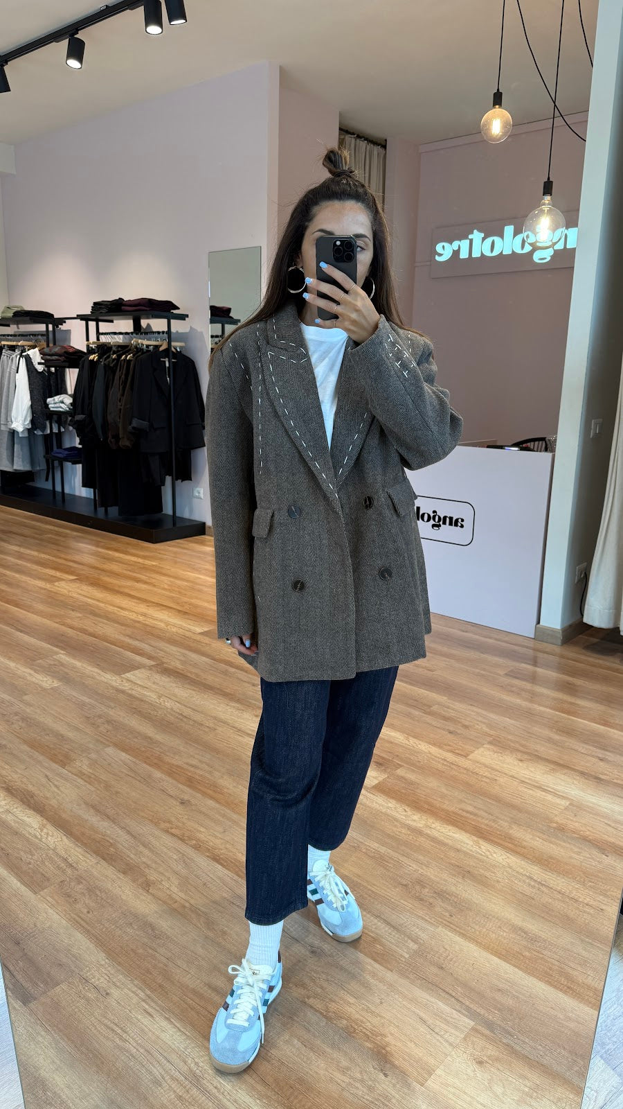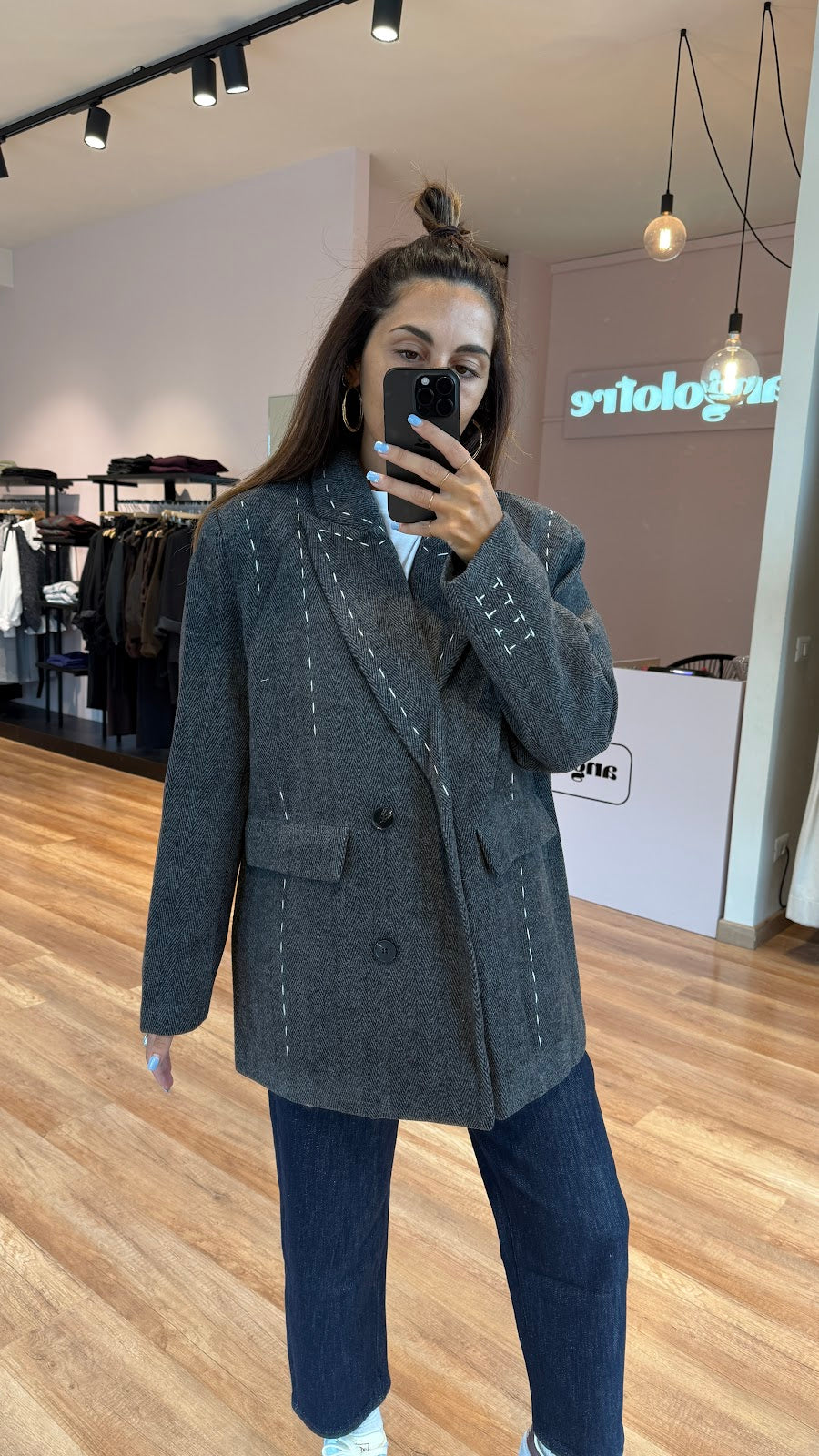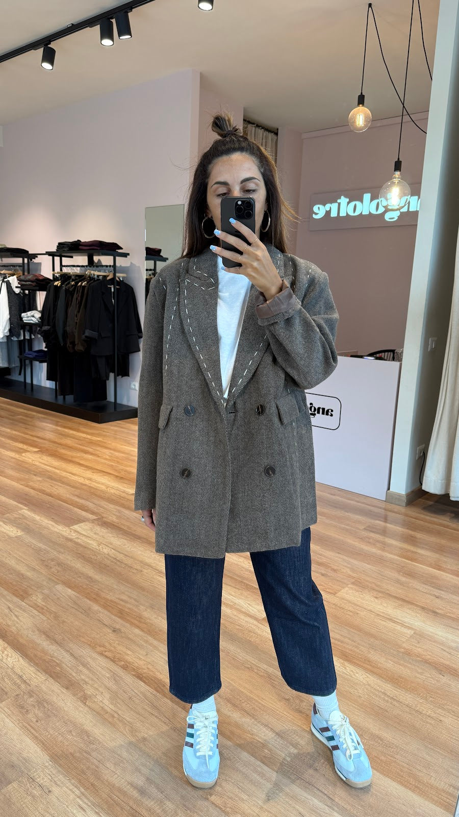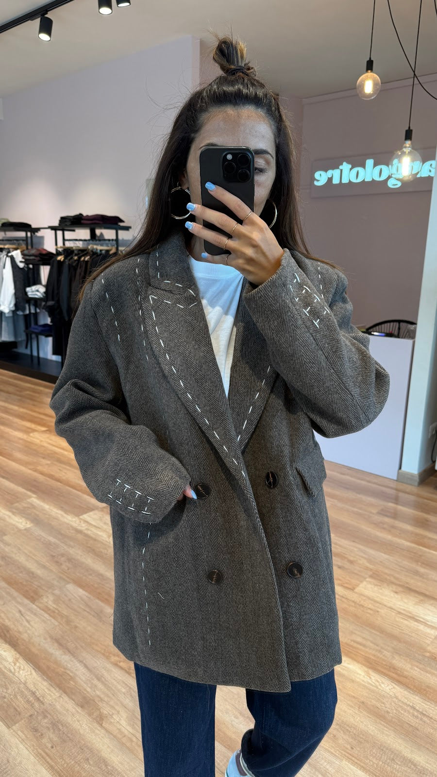 Giacca cappotto doppio petto,vestibilità over,in tessuto spinato con cuciture a vista,tasche con pattina e spalle definite. Jessica indossa la taglia S\M.