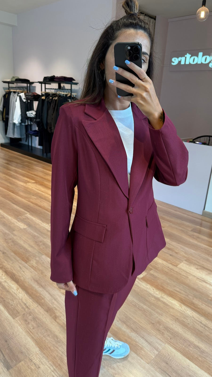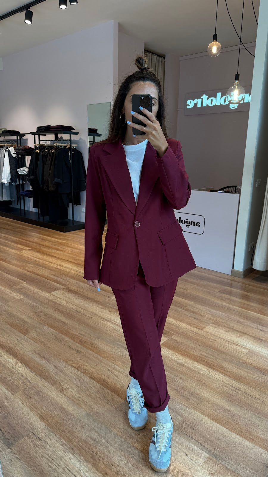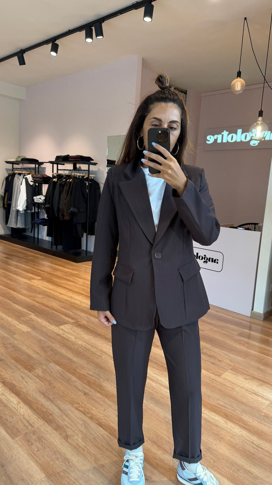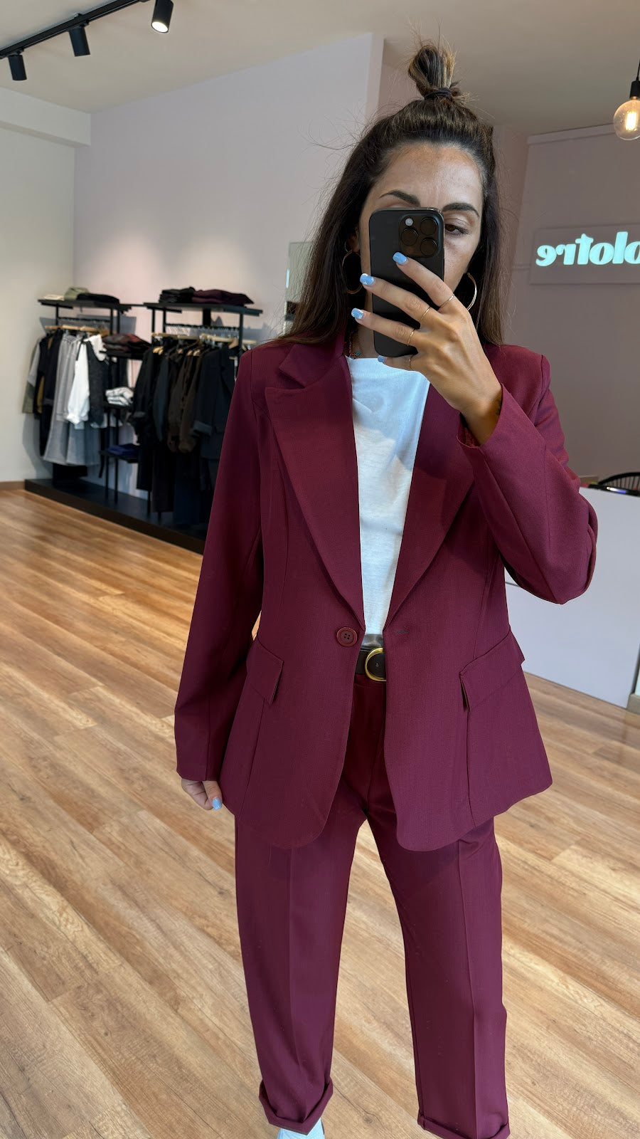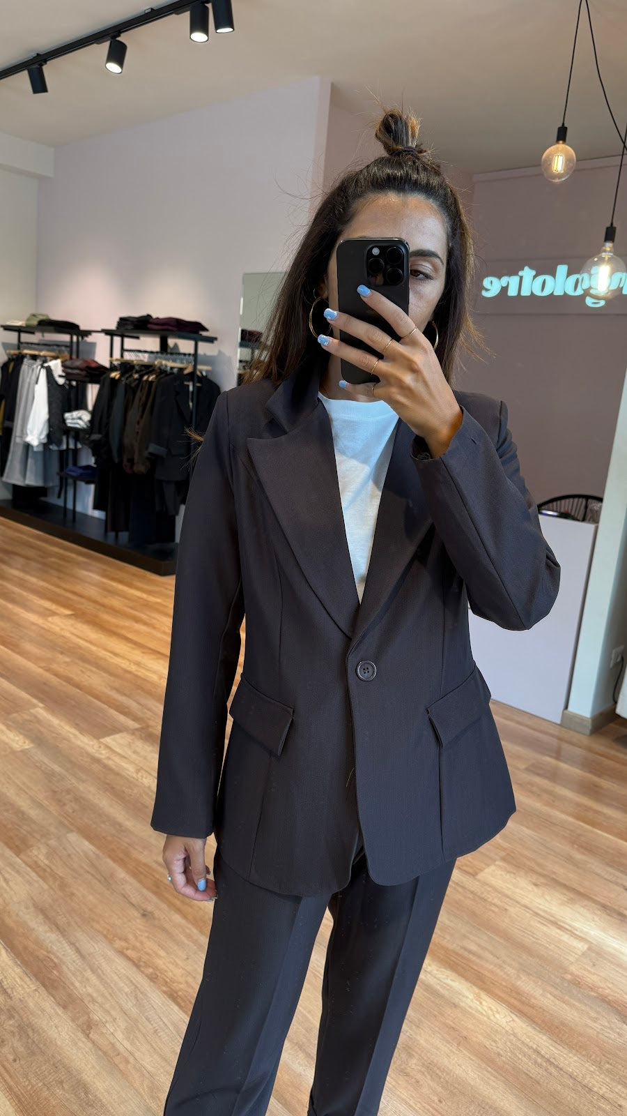 Giacca monopetto leggermente avvitata,taglio classico,con tasche non apribili. Jessica veste una taglia 40