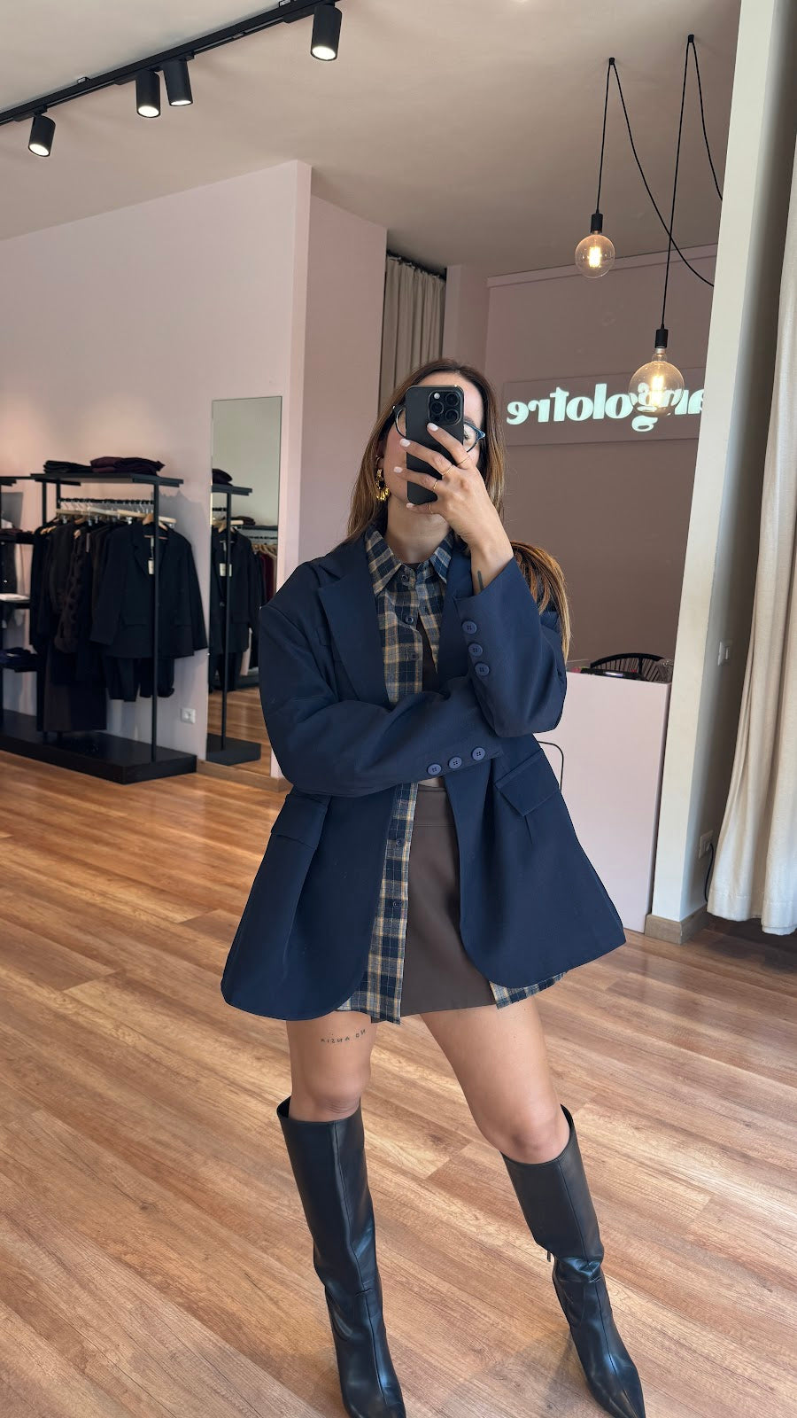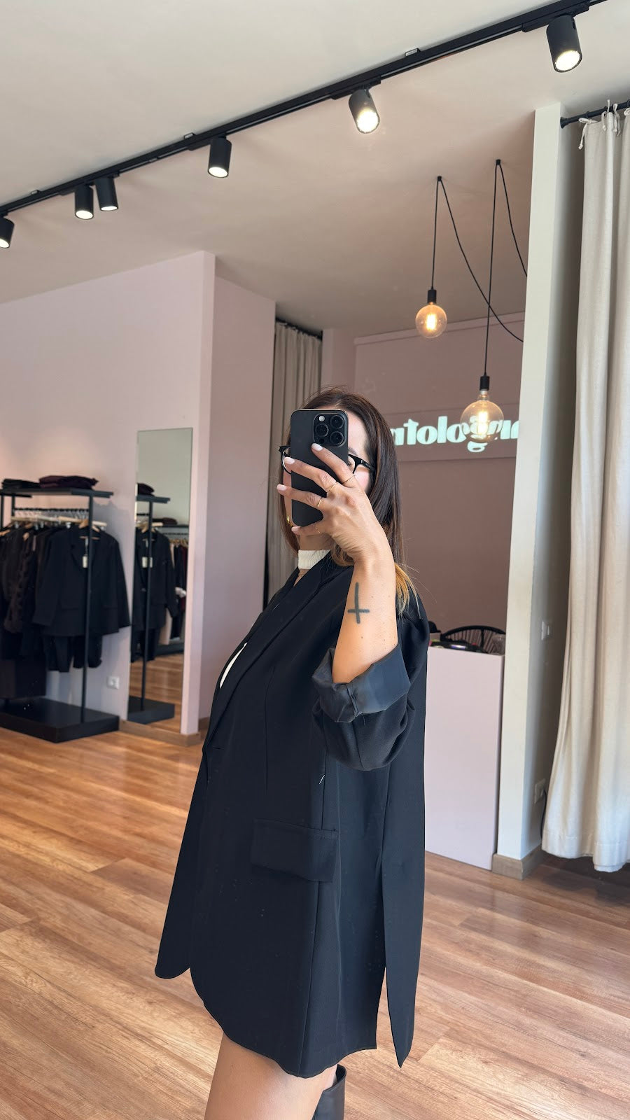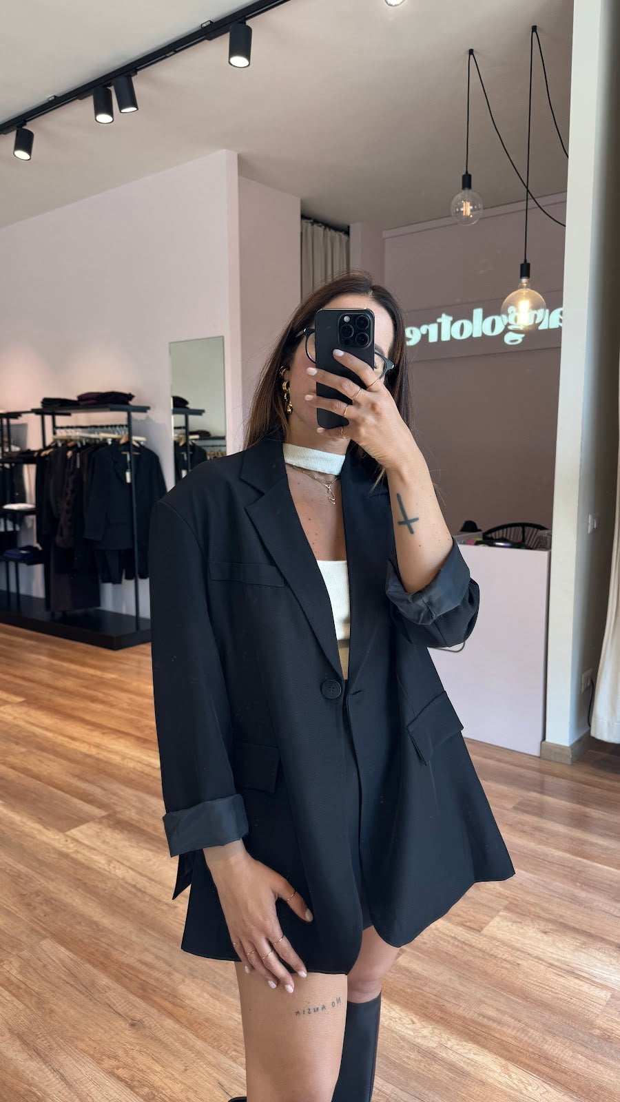 Giacca over monopetto, con spacchetti nella parte posteriore. Tasche non apribili. Greta veste una taglia 40/42.