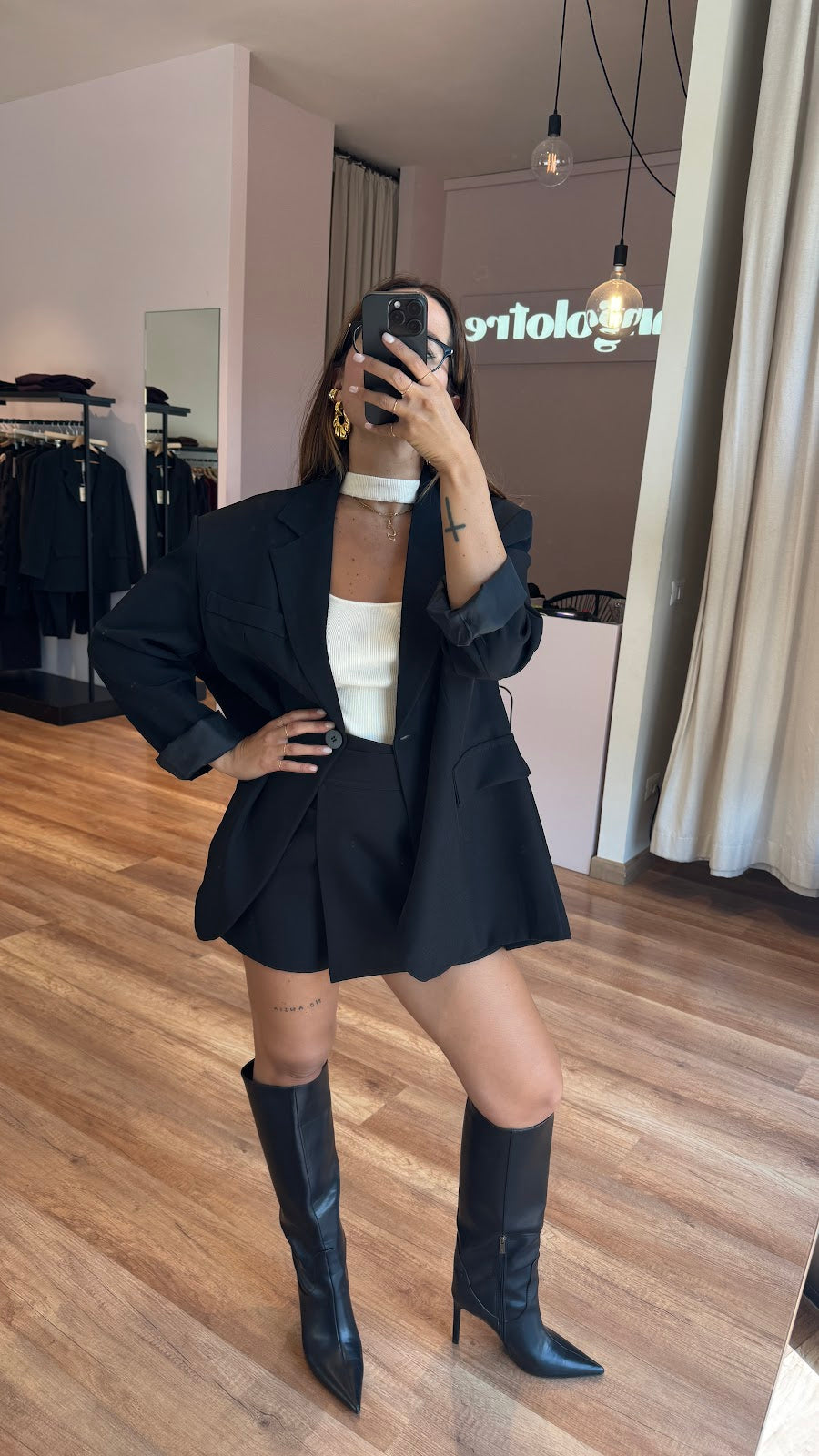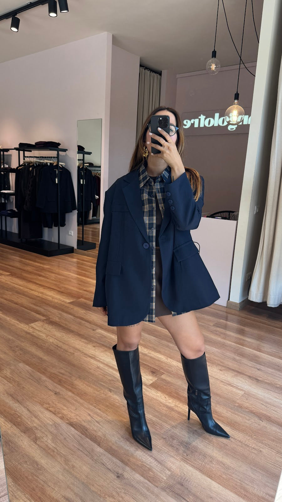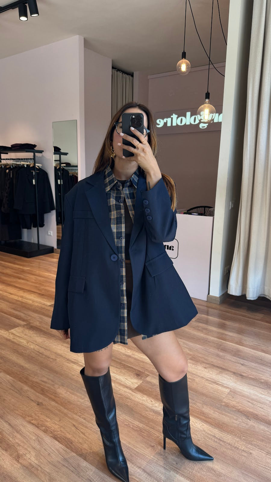 Giacca over monopetto, con spacchetti nella parte posteriore. Tasche non apribili. Greta veste una taglia 40/42.