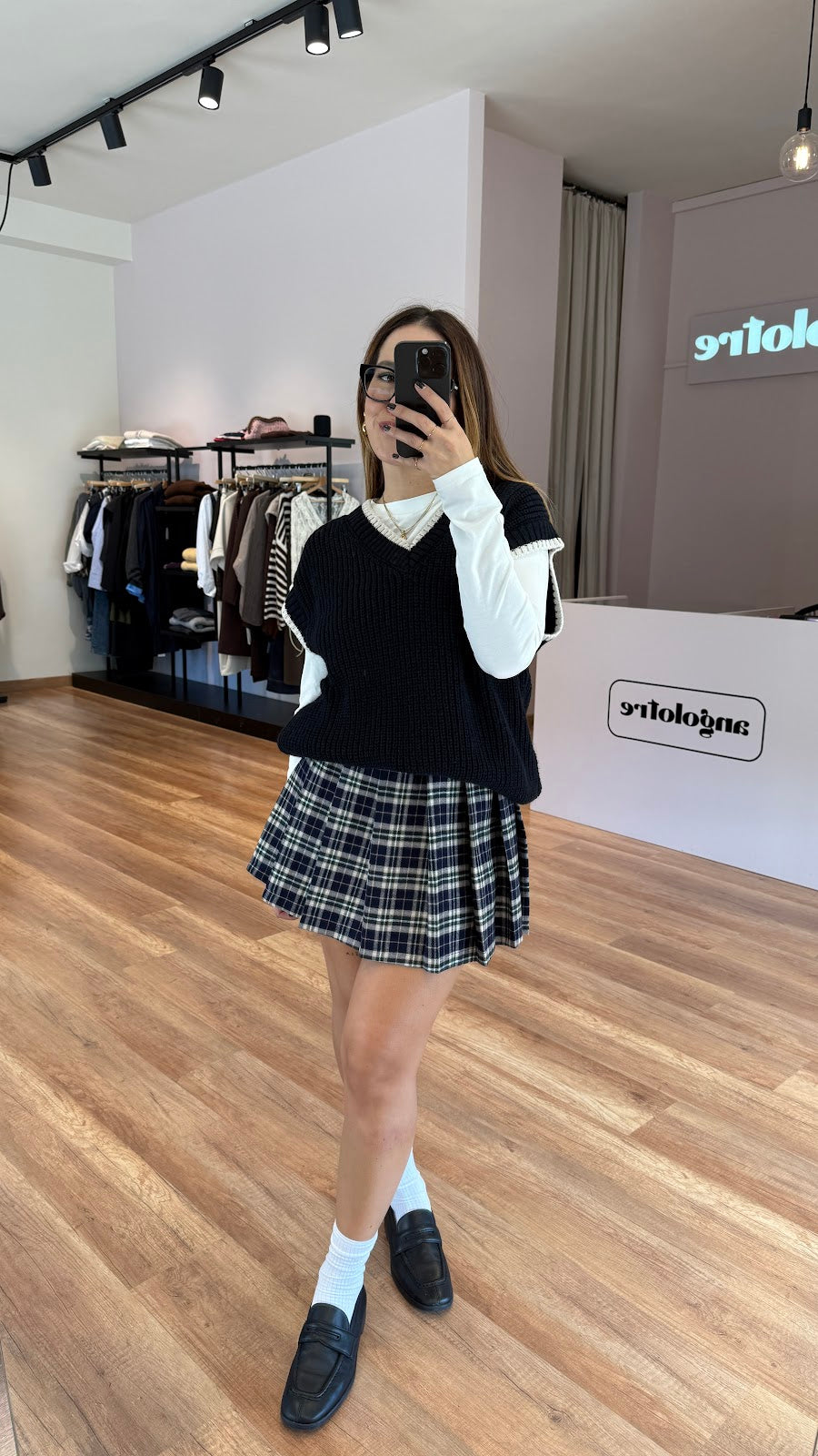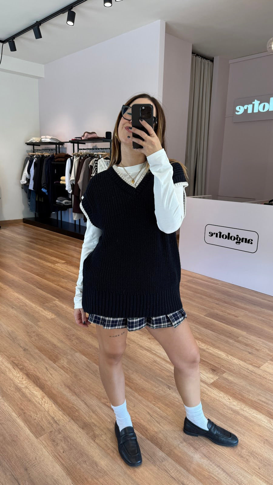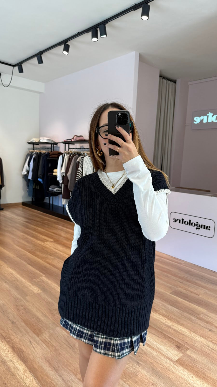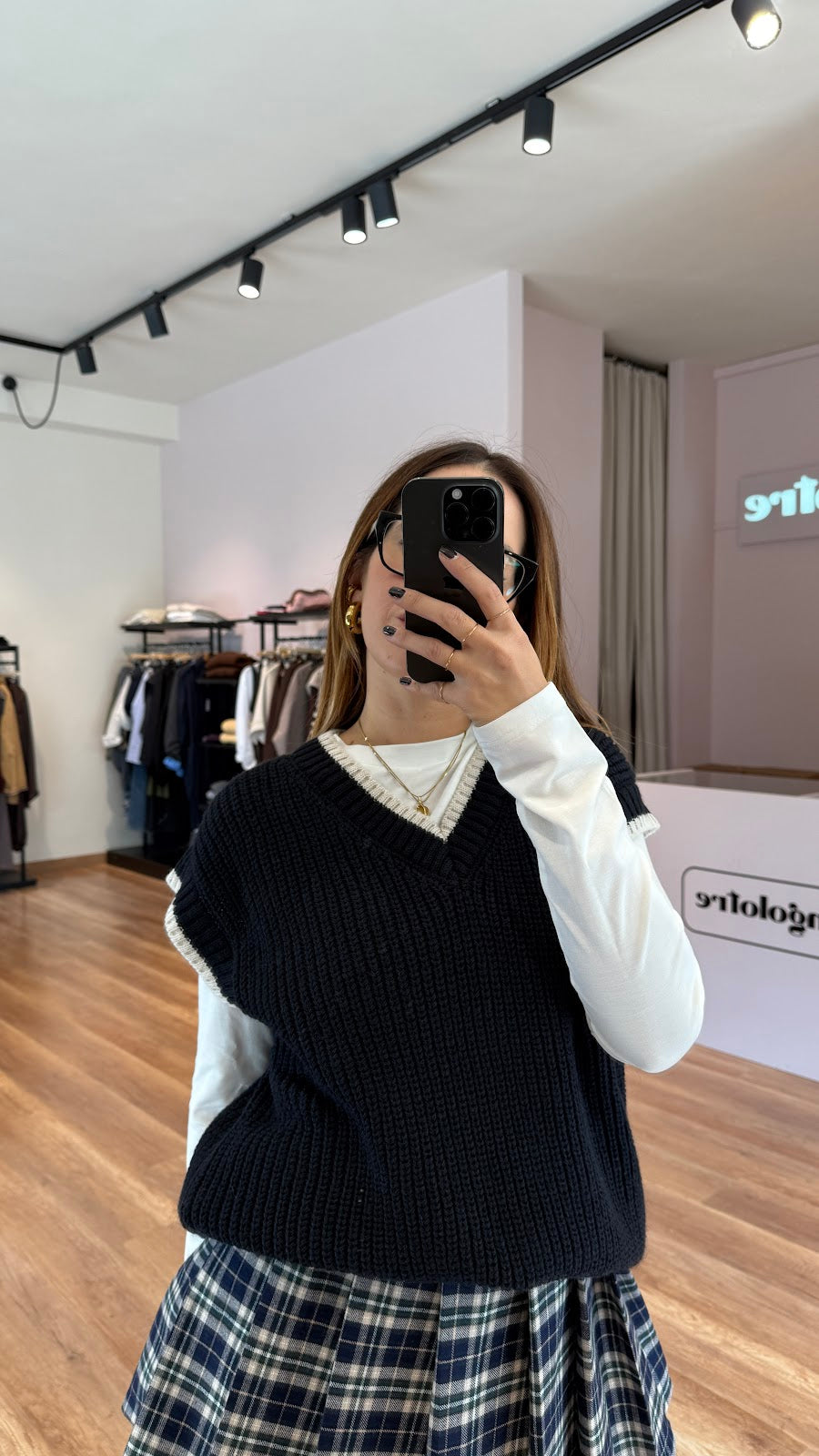 Gilet KikiSix over con scollo a V, bordo a contrasto. Greta veste una taglia 40/42.