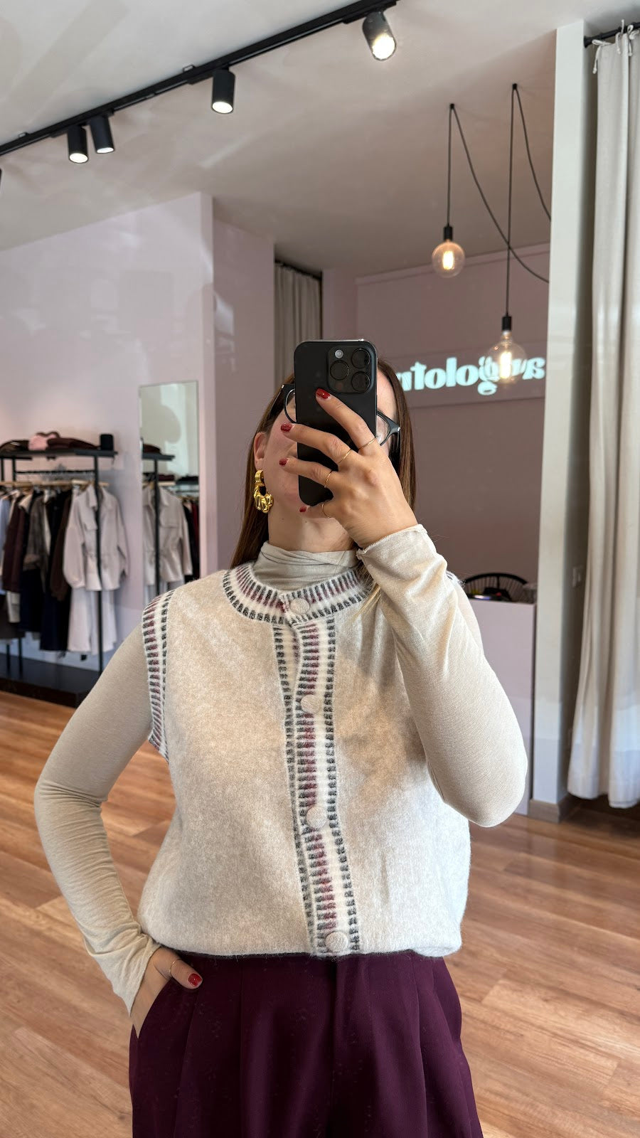 Gilet in maglia morbida, scollo rotondo, bottoni ricoperti e bordi a contrasto. Greta veste una taglia 40/42.