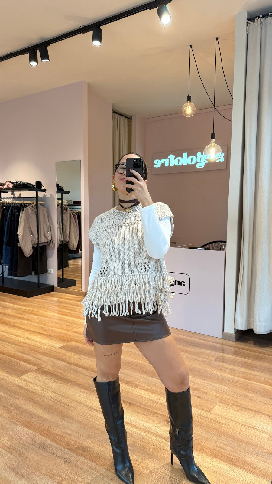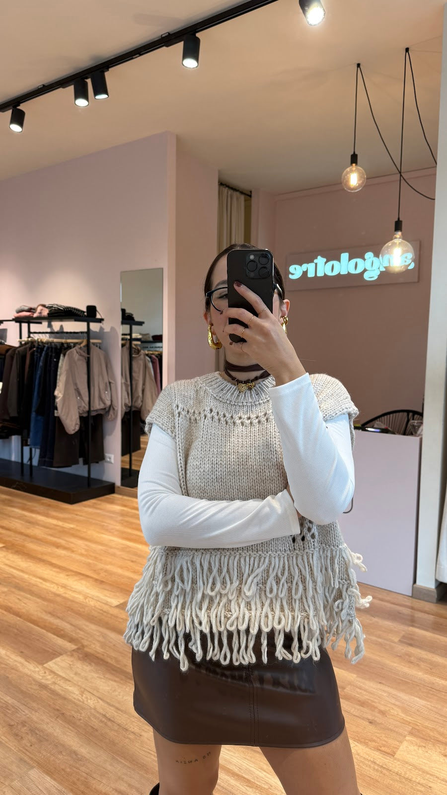 Gilet Kikisix in maglia con frange, vestibilità morbida. 10% lana. Greta veste una taglia 40/42.