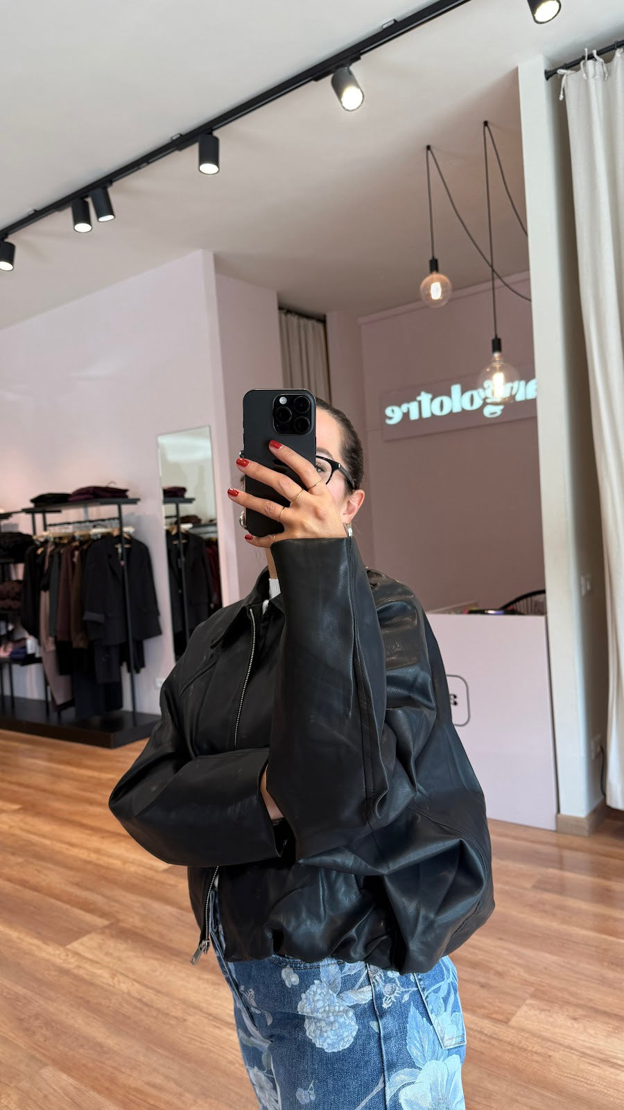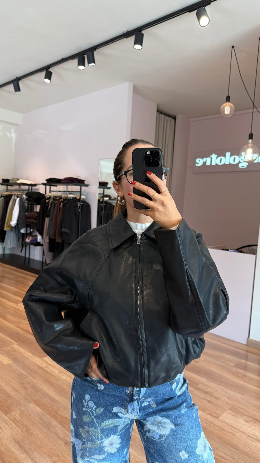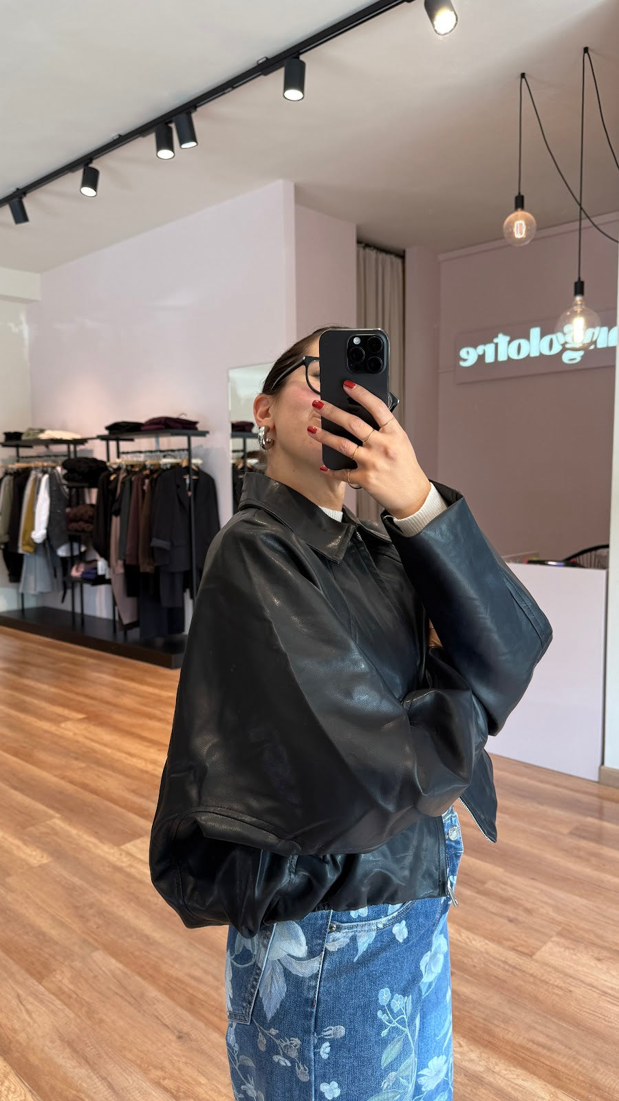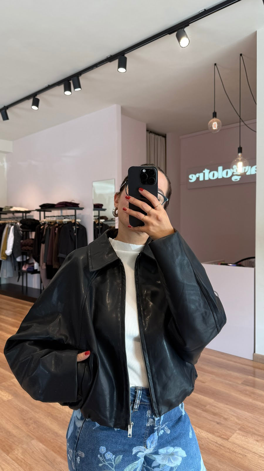 Giubbino con collo a revers in ecopelle. Arricciatura sell'orlo. Vestibilità over. Greta indossa una taglia S/M.
