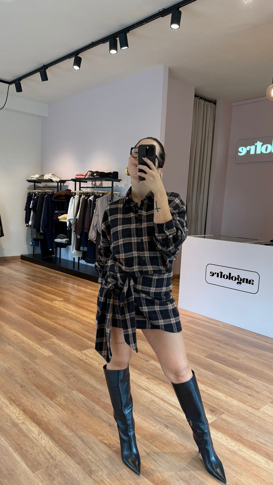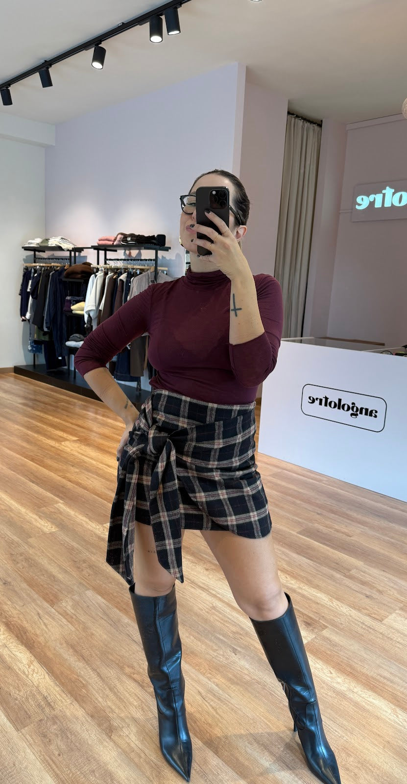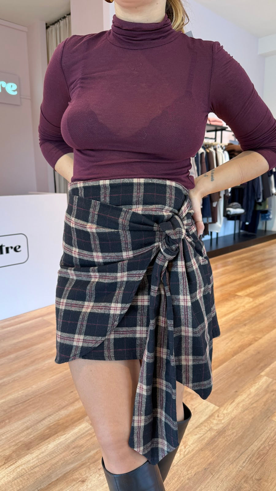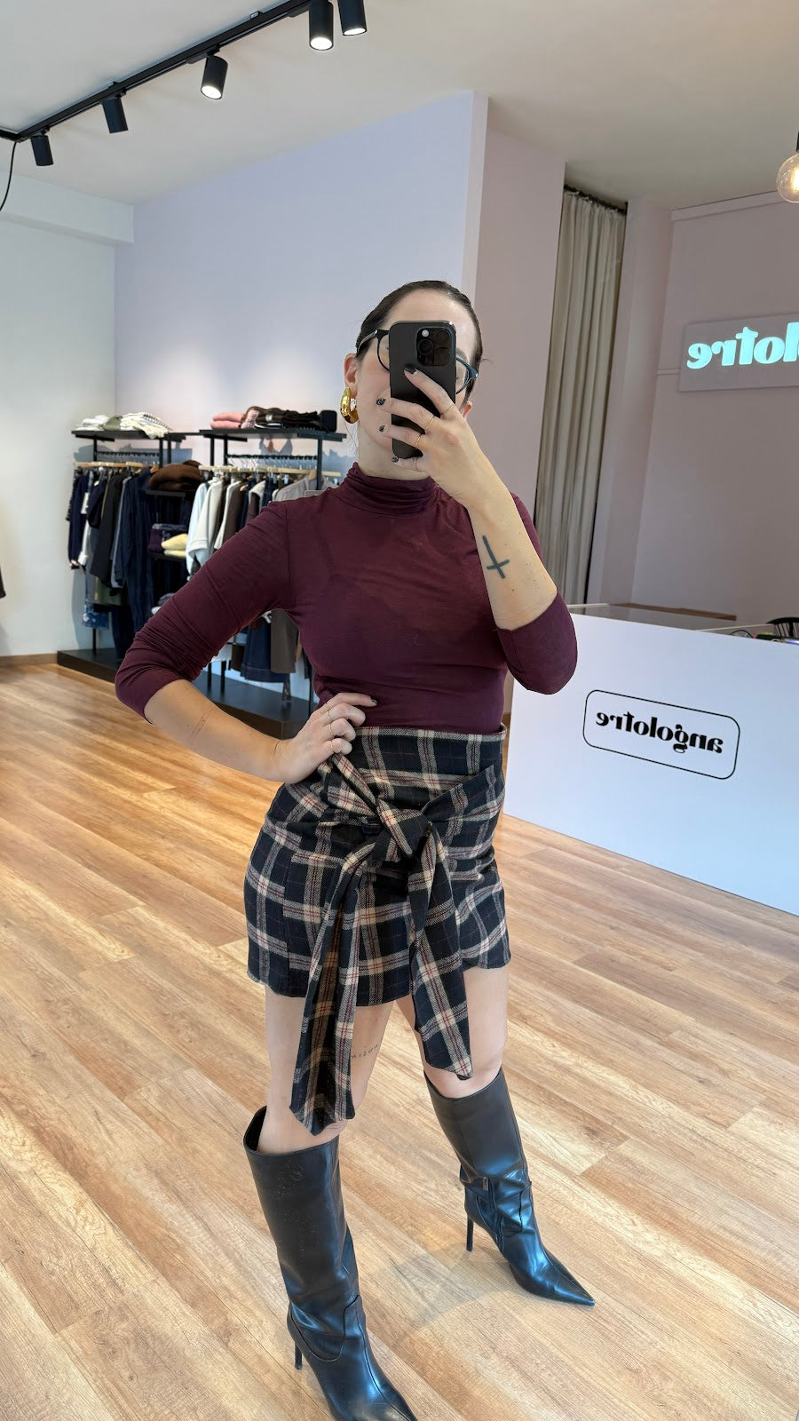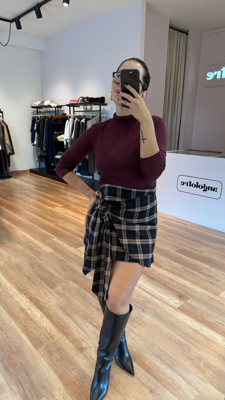 Minigonna in panno a scacchi, con dettaglio fiocco sul lato. Chiusura con zip laterale. Greta indossa una taglia S/M.