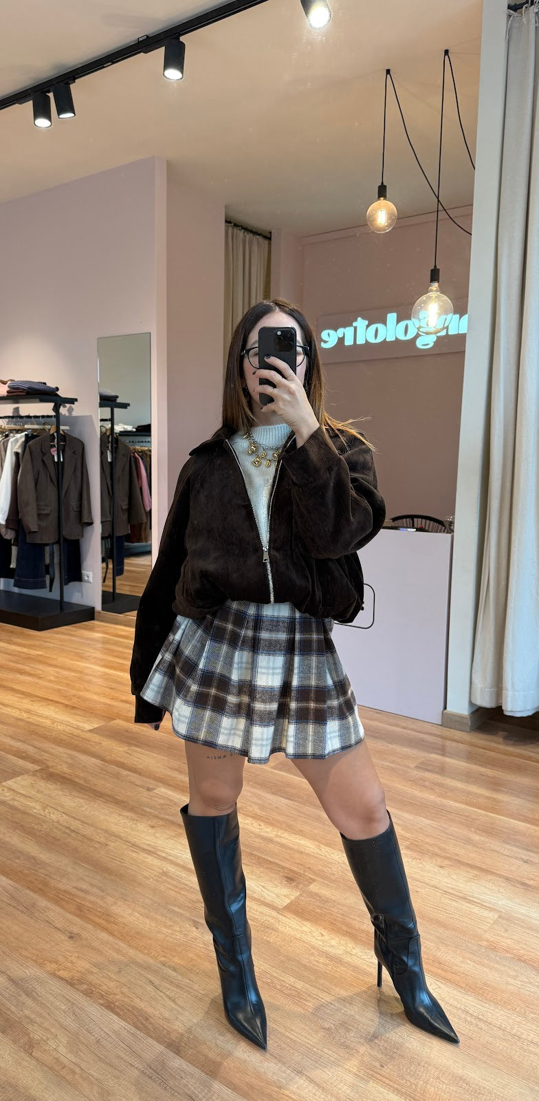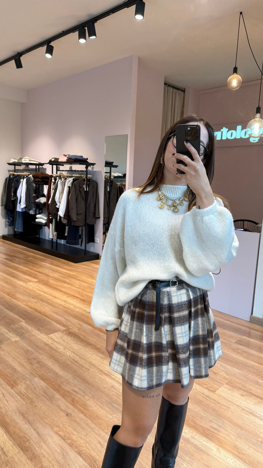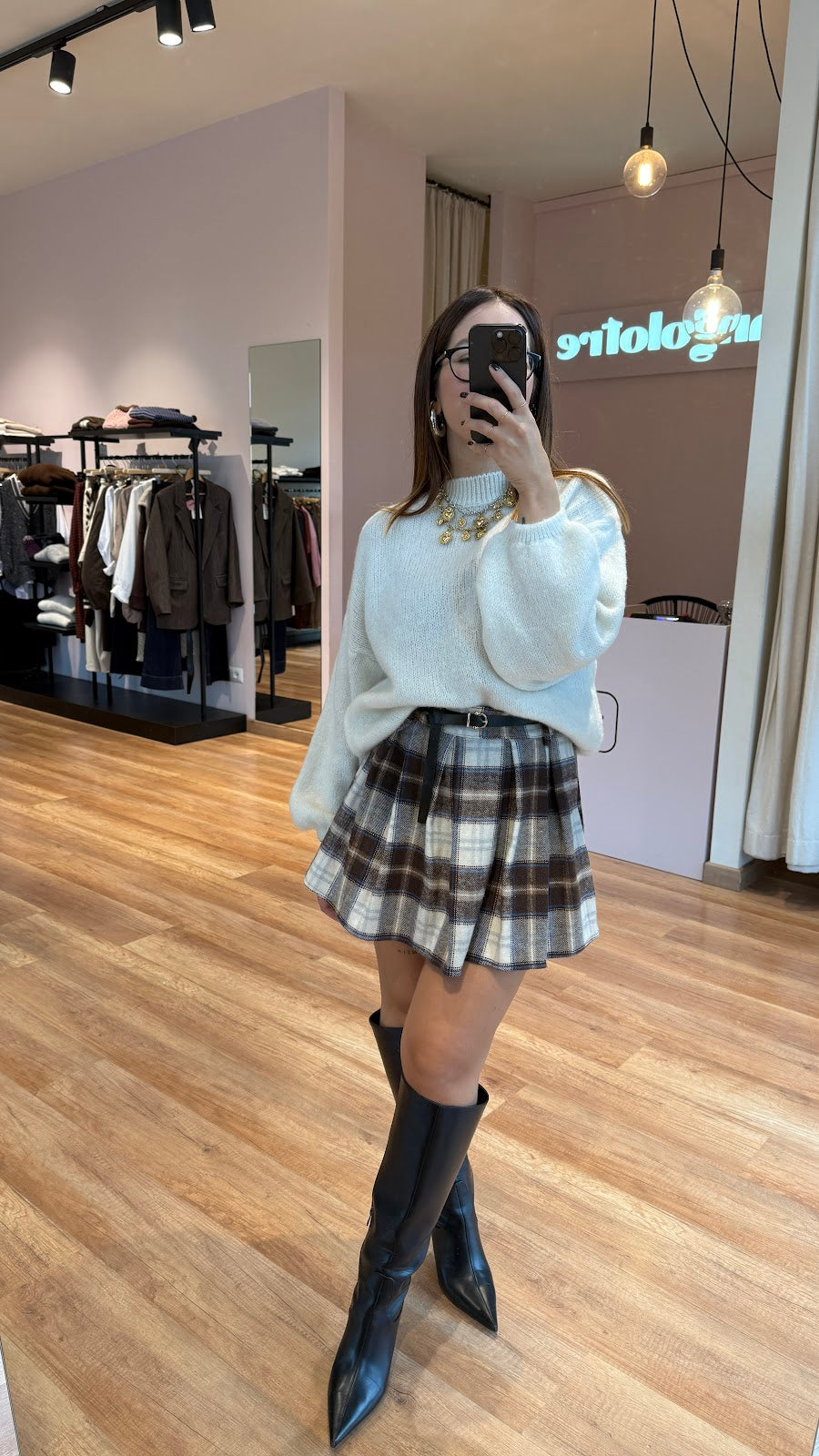 Mini gonna in panno pesante fantasia a scacchi, con plissè solo sul davanti. Elastico dietro e passanti, cintina in ecopelle compresa. Greta veste una taglia 40/42.