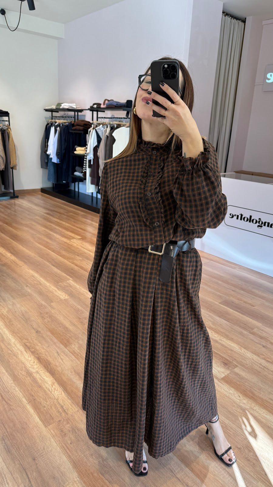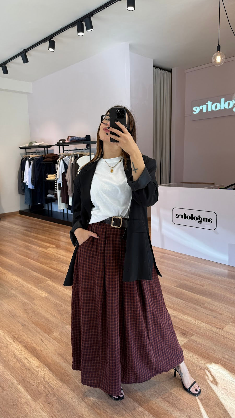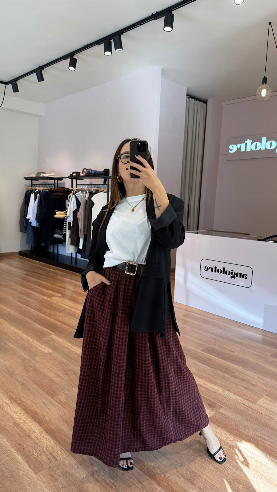 Gonna lunga svasata, fantasia scacco, con pinces avanti ed elastico dietro. Taschine laterali a filo, cinta in dotazione. Greta veste una tagloia 40/42.