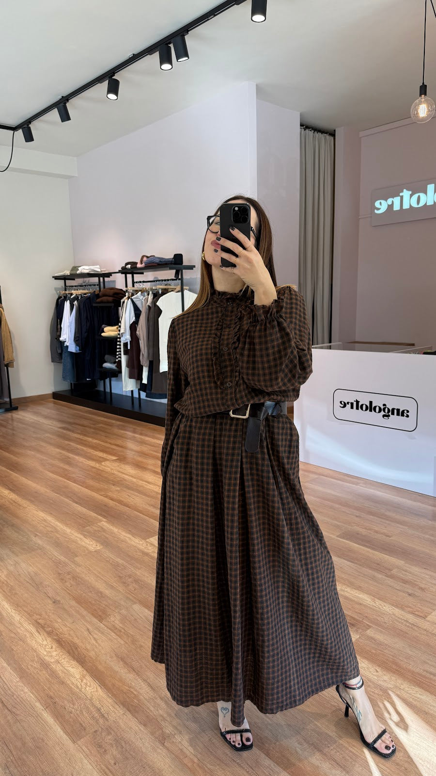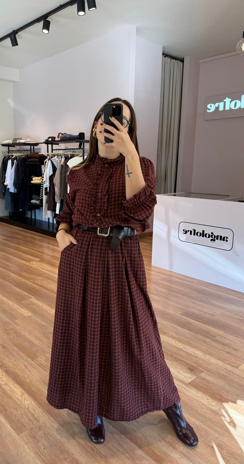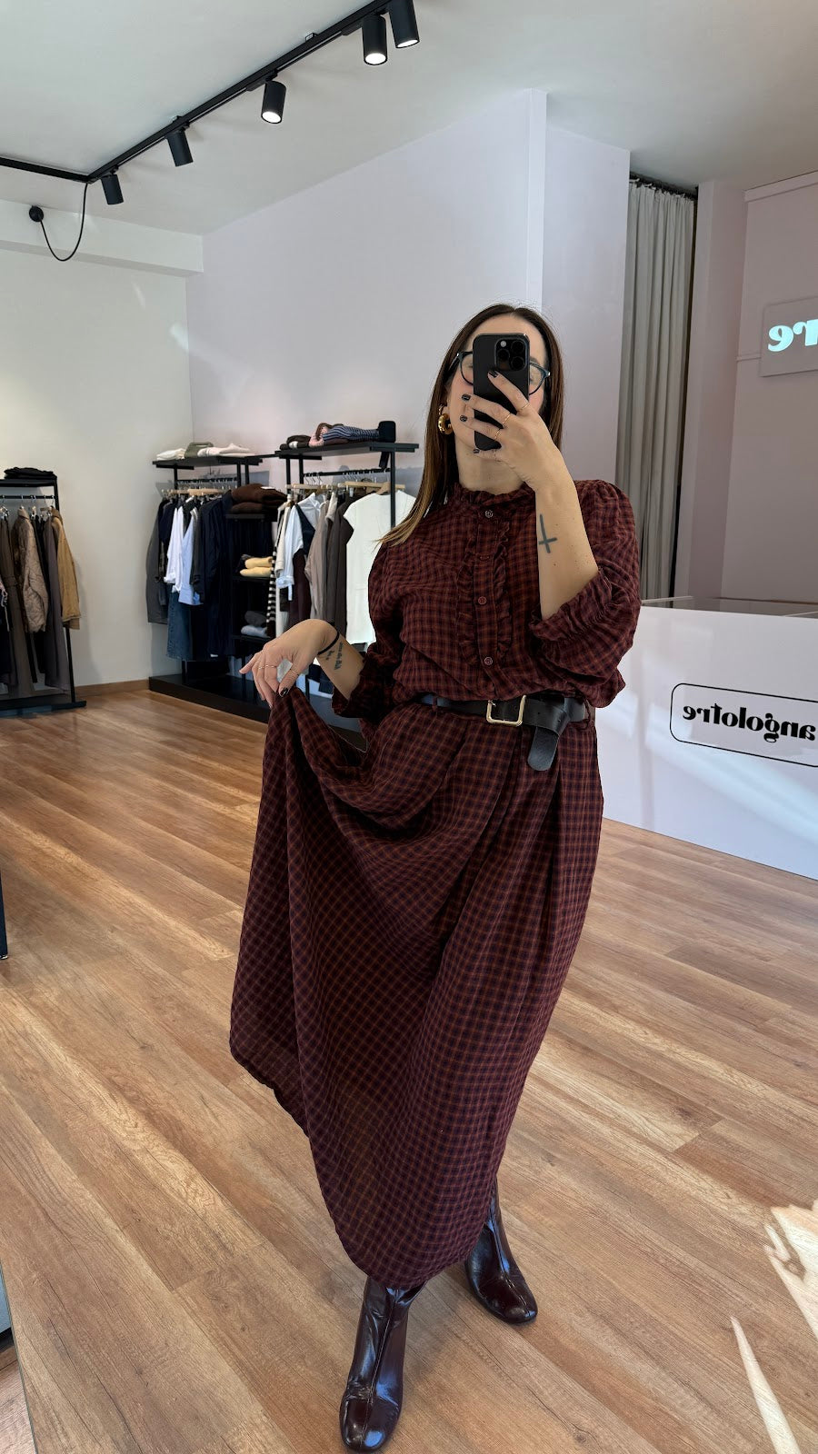 Gonna lunga svasata, fantasia scacco, con pinces avanti ed elastico dietro. Taschine laterali a filo, cinta in dotazione. Greta veste una tagloia 40/42.