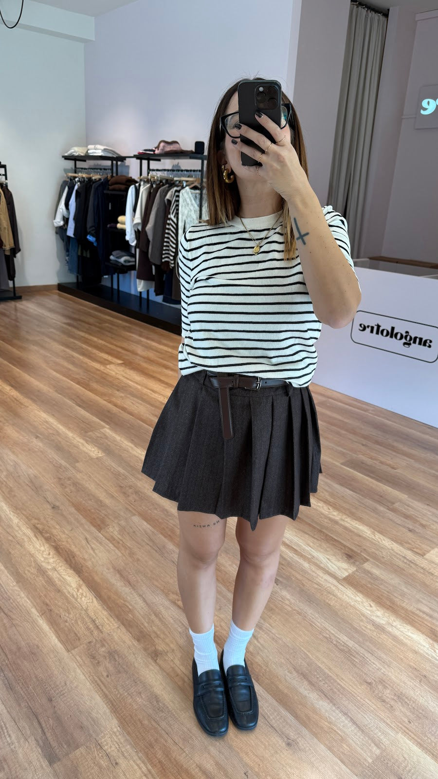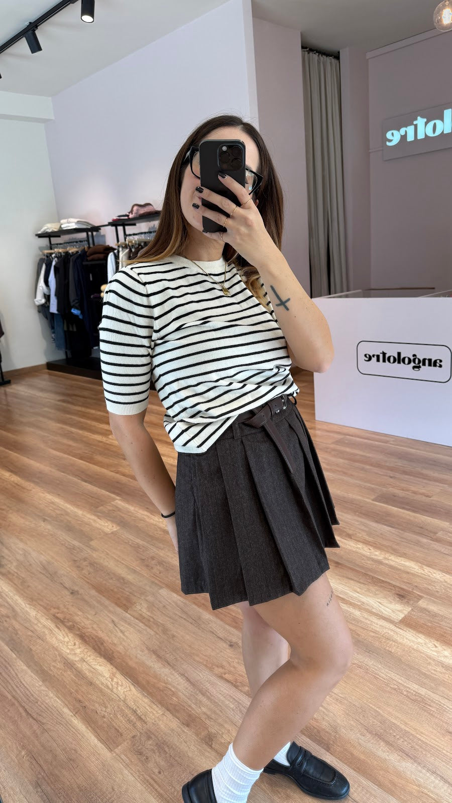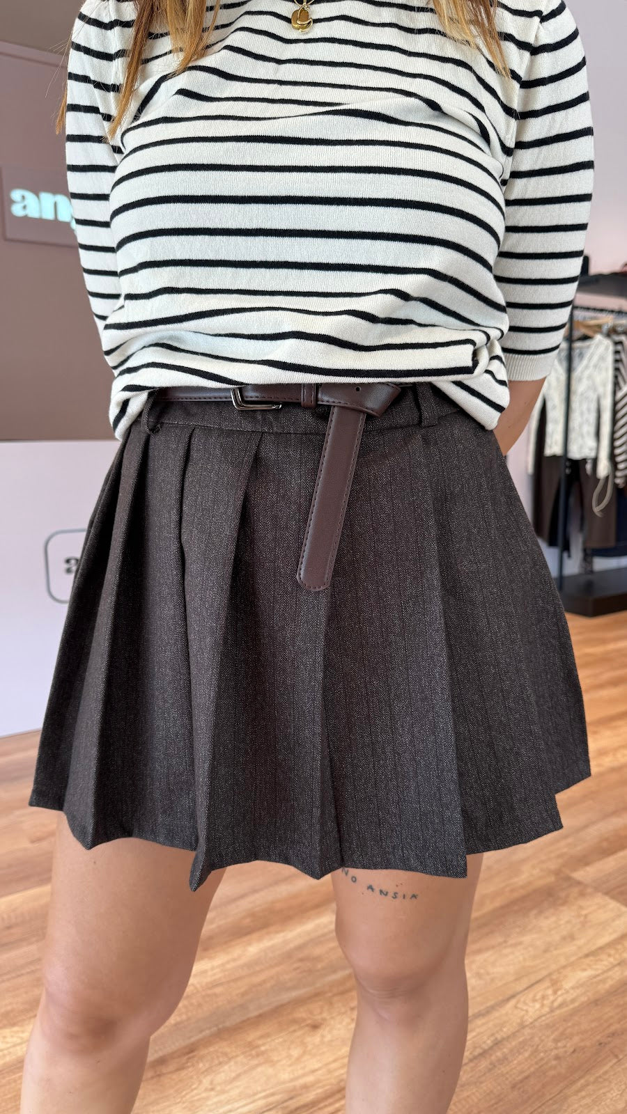 Minigonna Lumina gessata in misto viscosa con cintura in dotazione. Passanti in vita e pieghe. Chiusura laterale con zip, fit regolare. Greta indossa una taglia S.