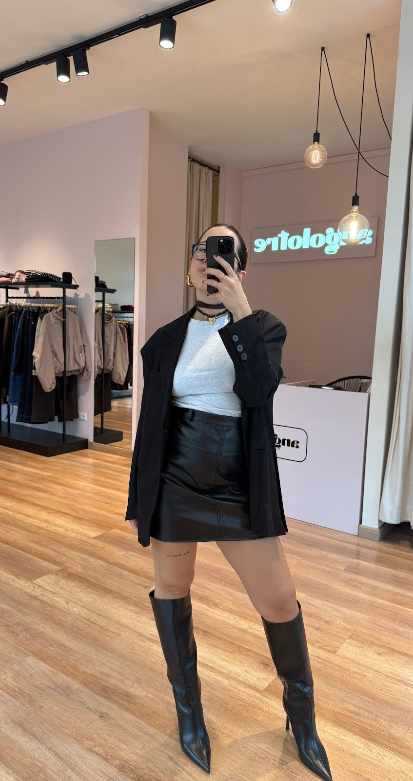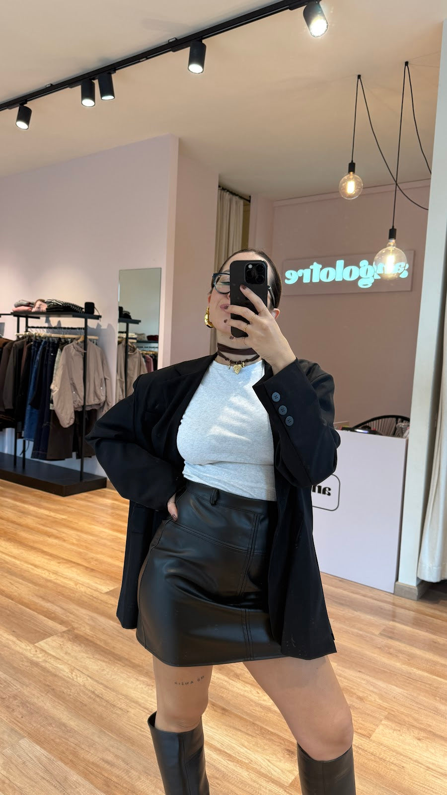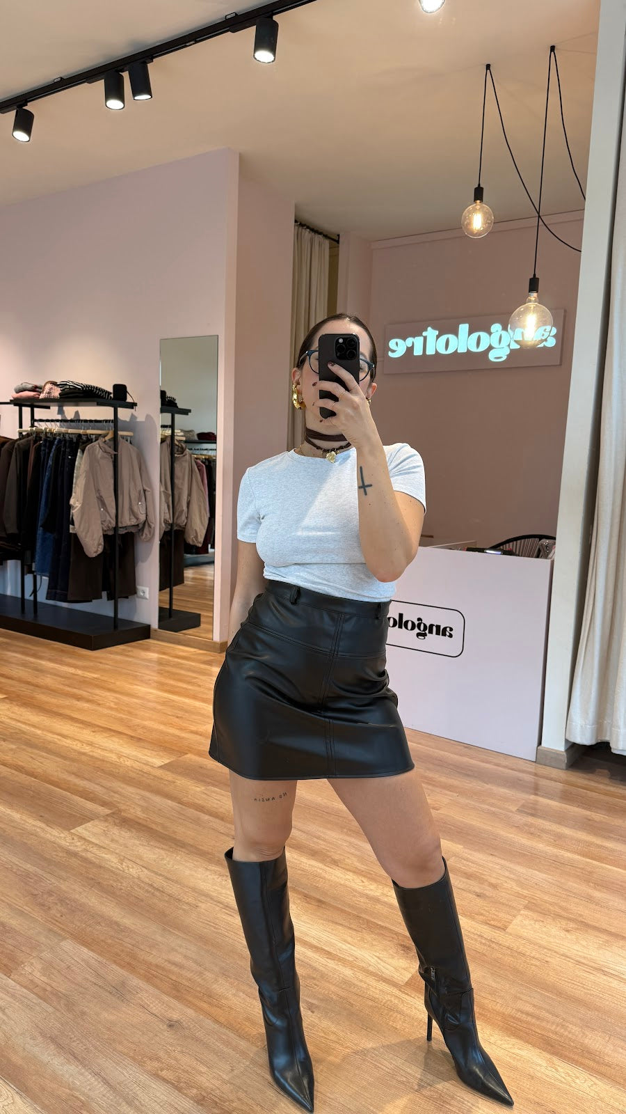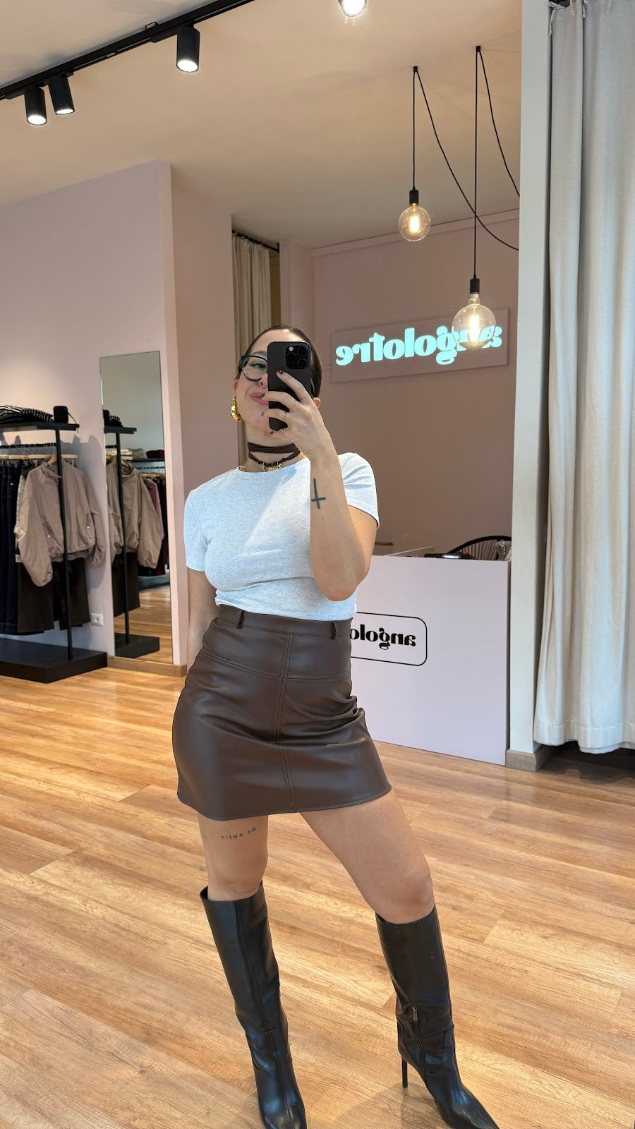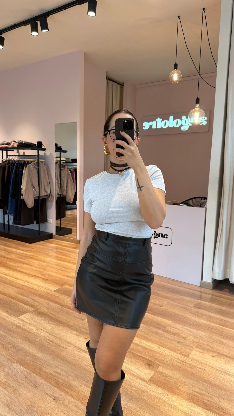 Gonna in ecoppele, chiusura con zip dietro e mini passanti in vita. Greta indossa una taglia M.