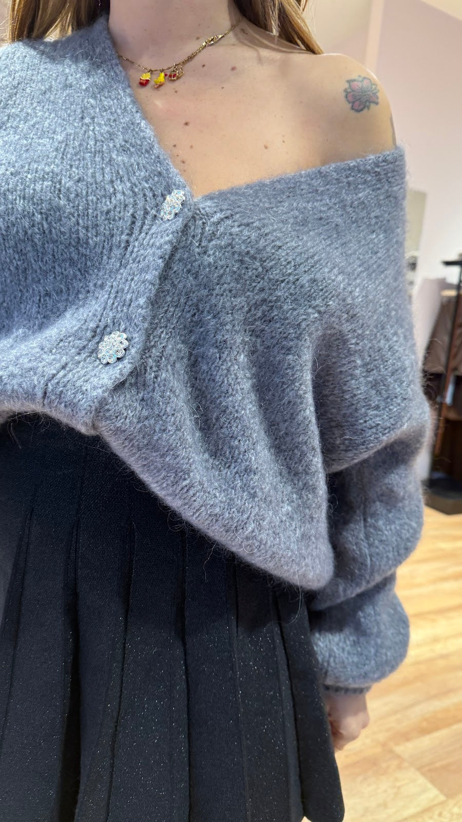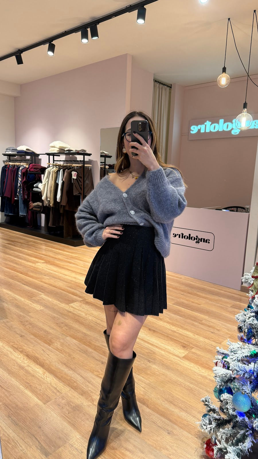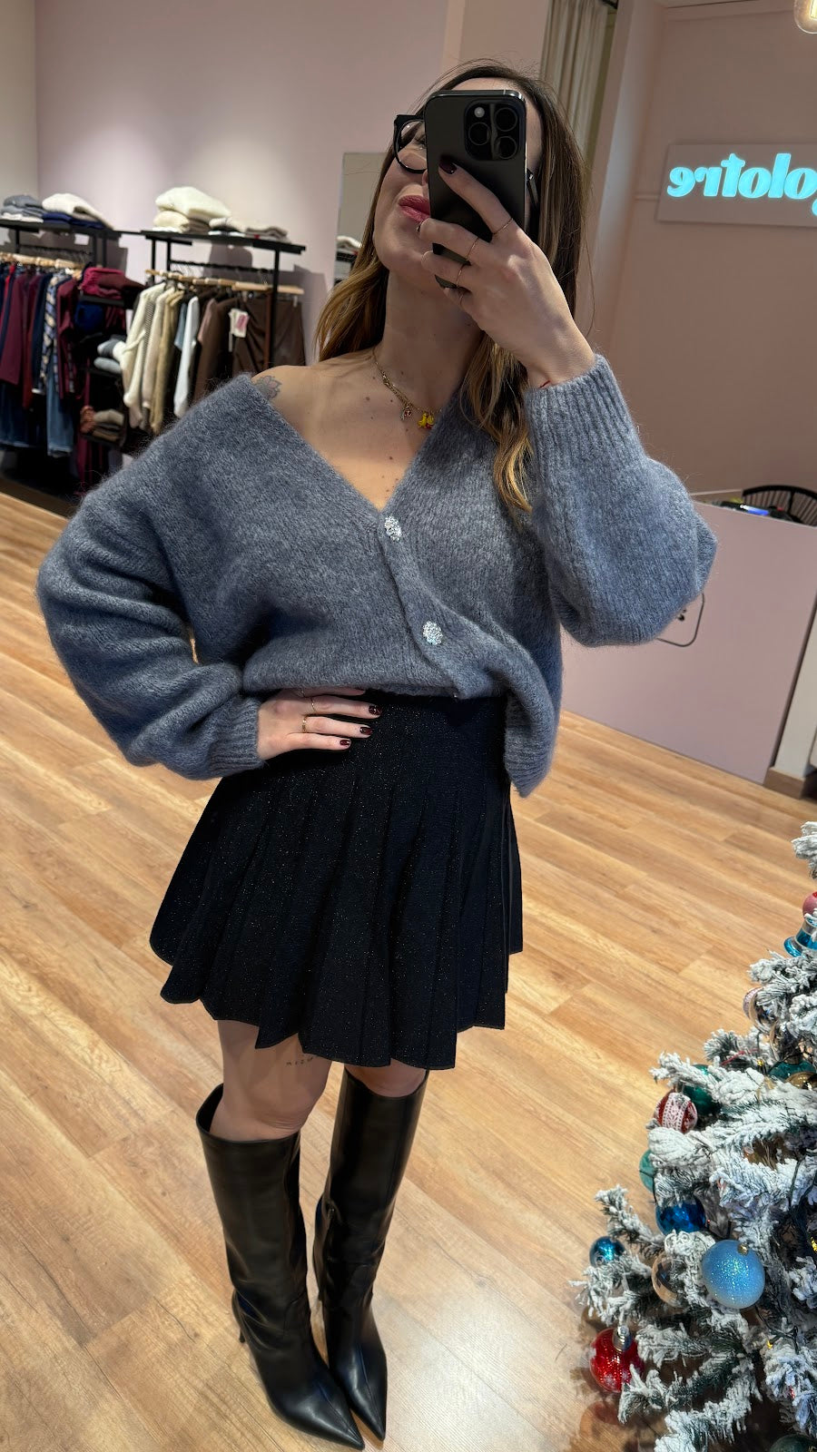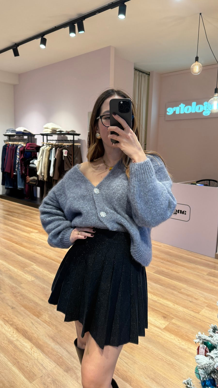Minigonna in lurex, con elastico in vita e plisse. Greta veste una taglia 40/42.
