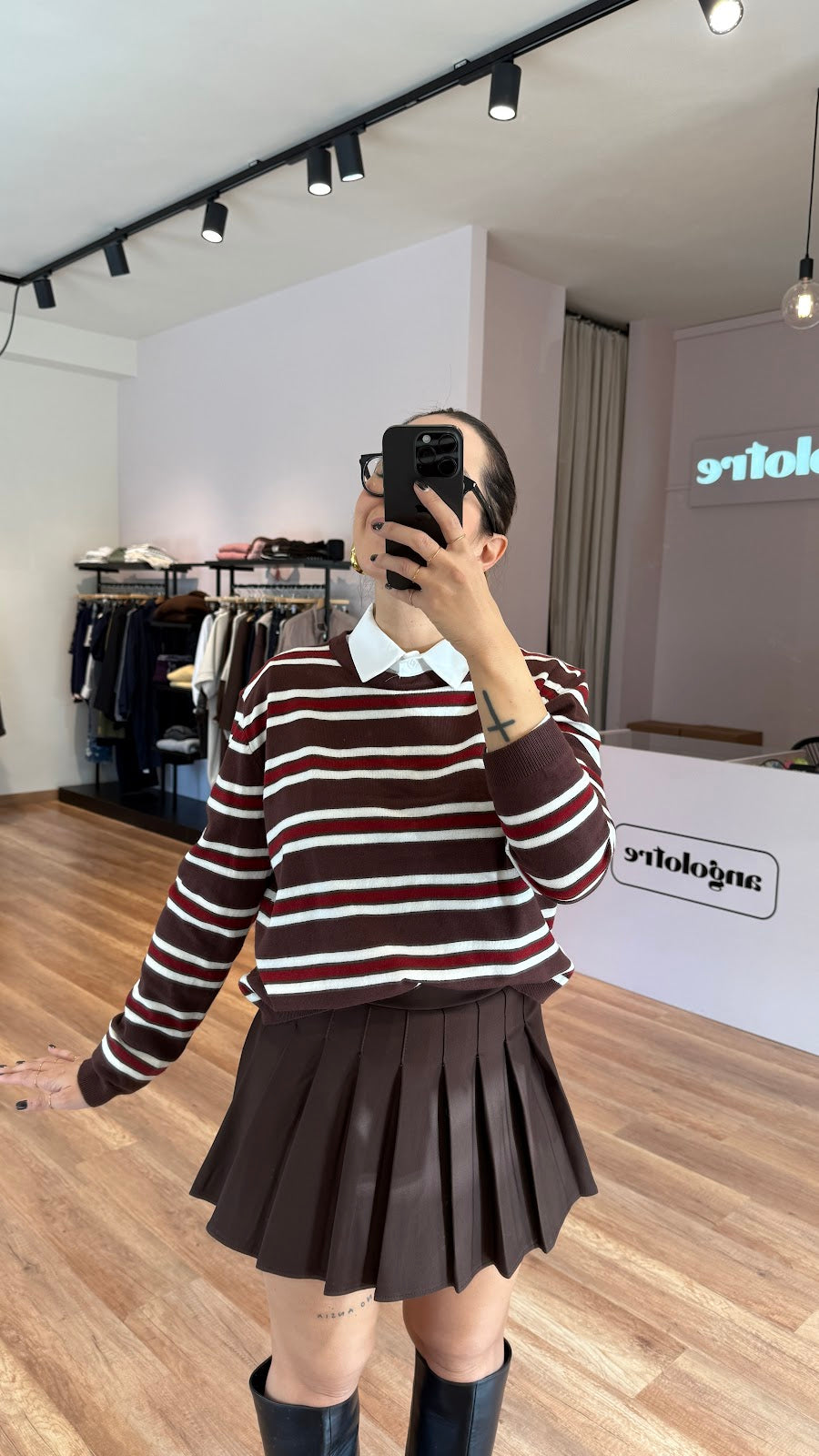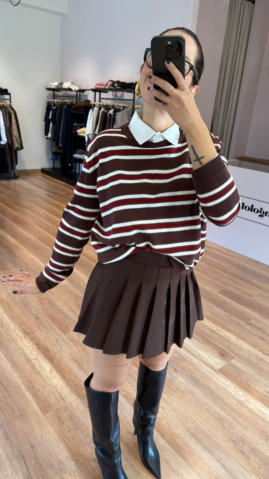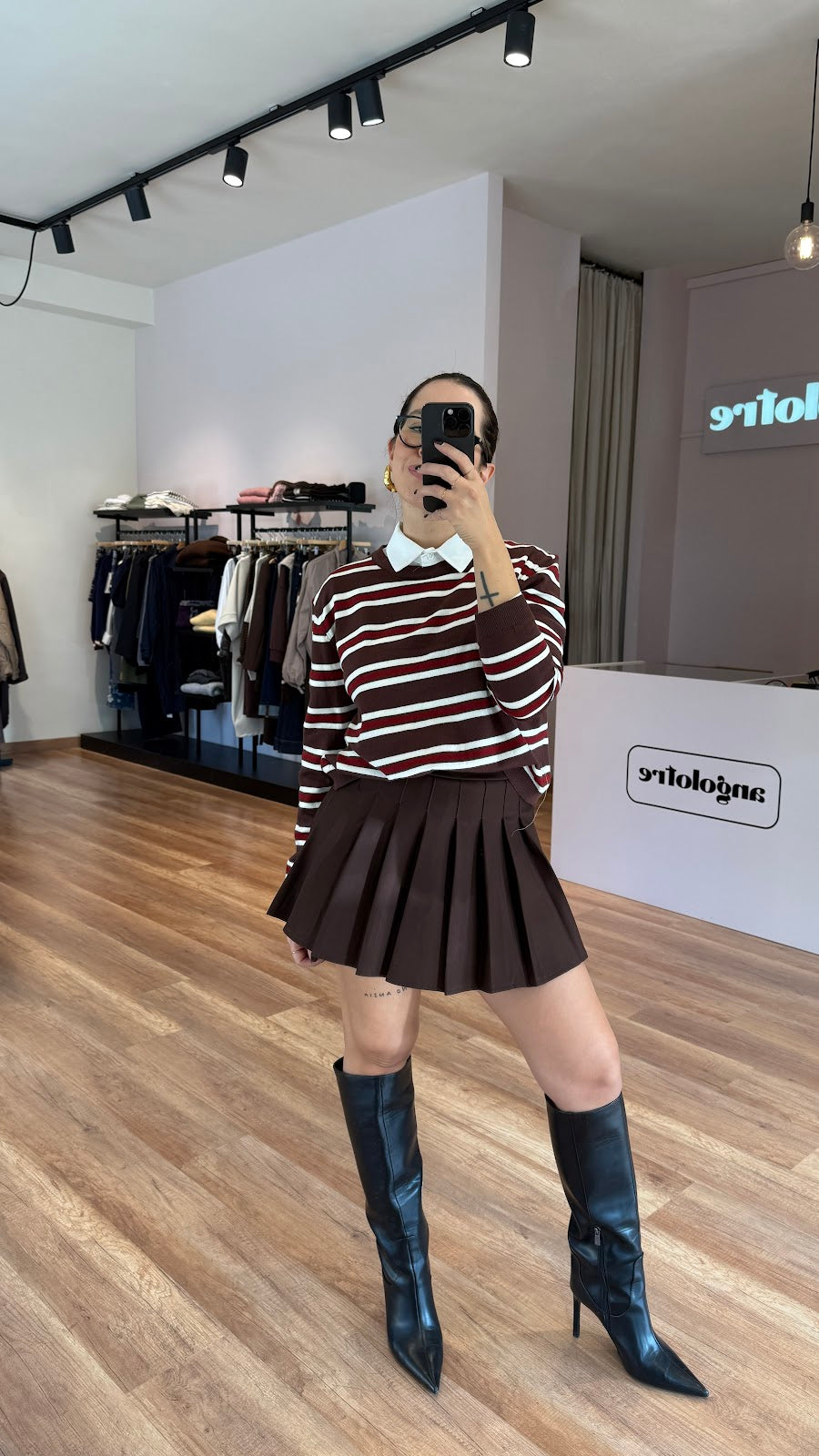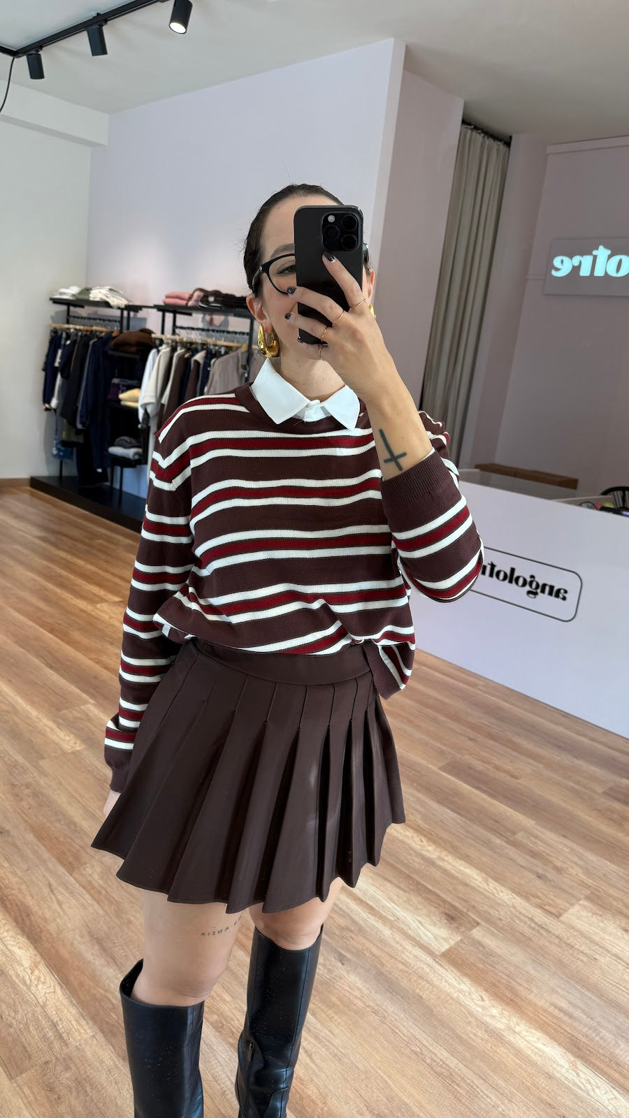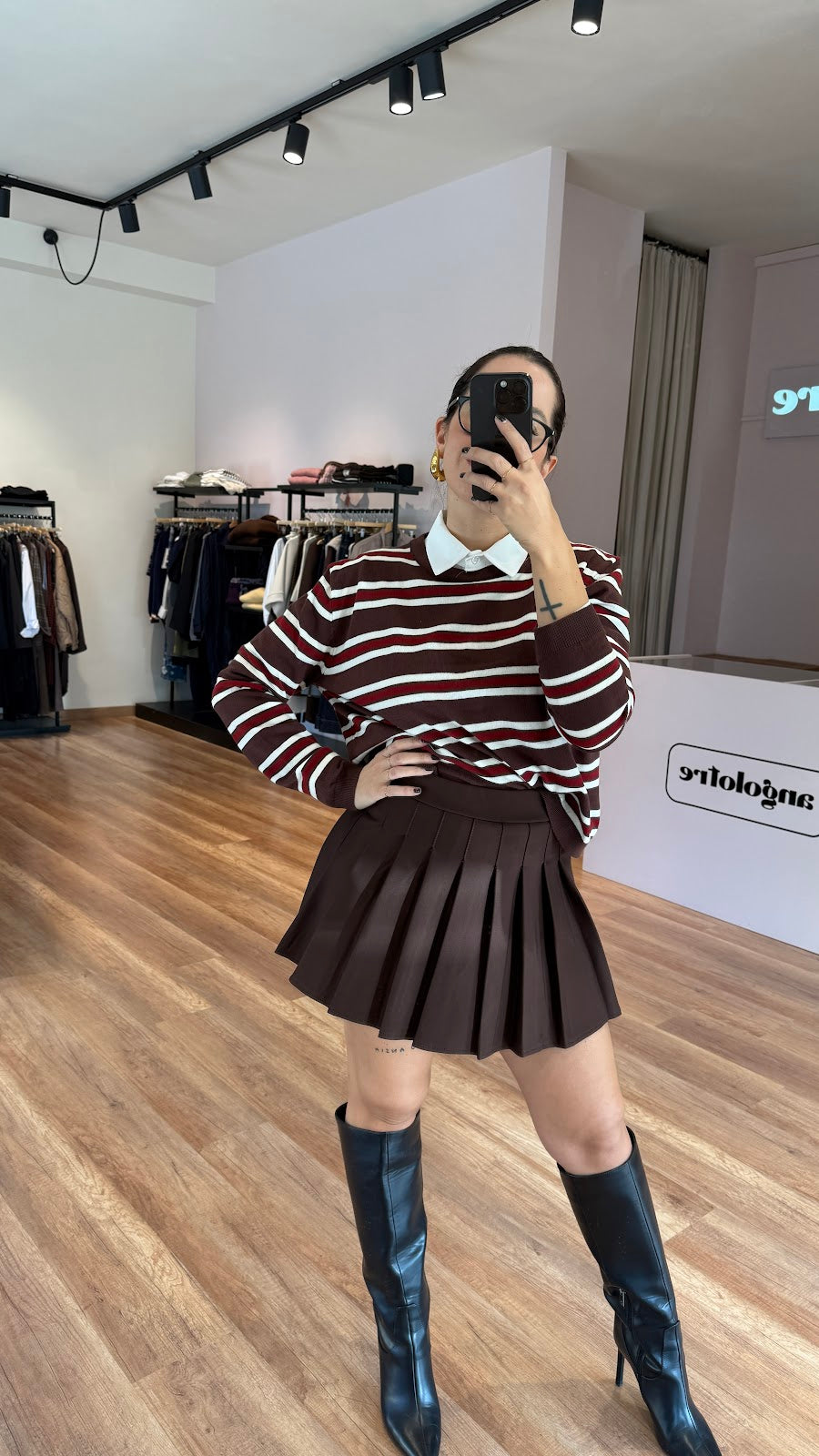Minigonna a pieghe con coulottina interna, elastico in vita. Veste piccolo. Greta veste una taglia 40/42.